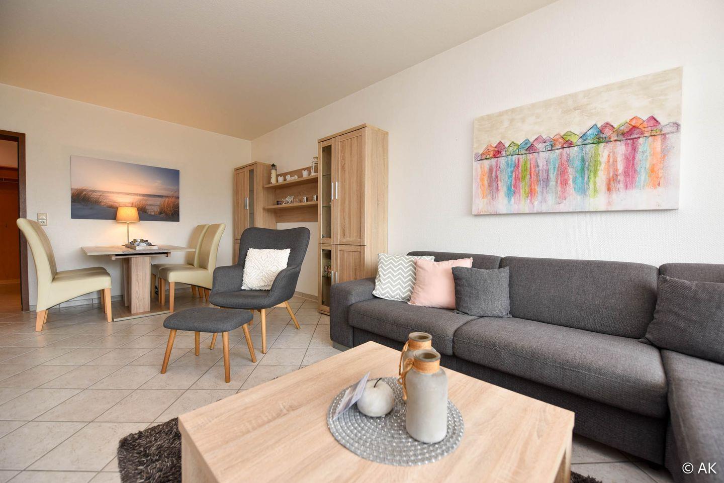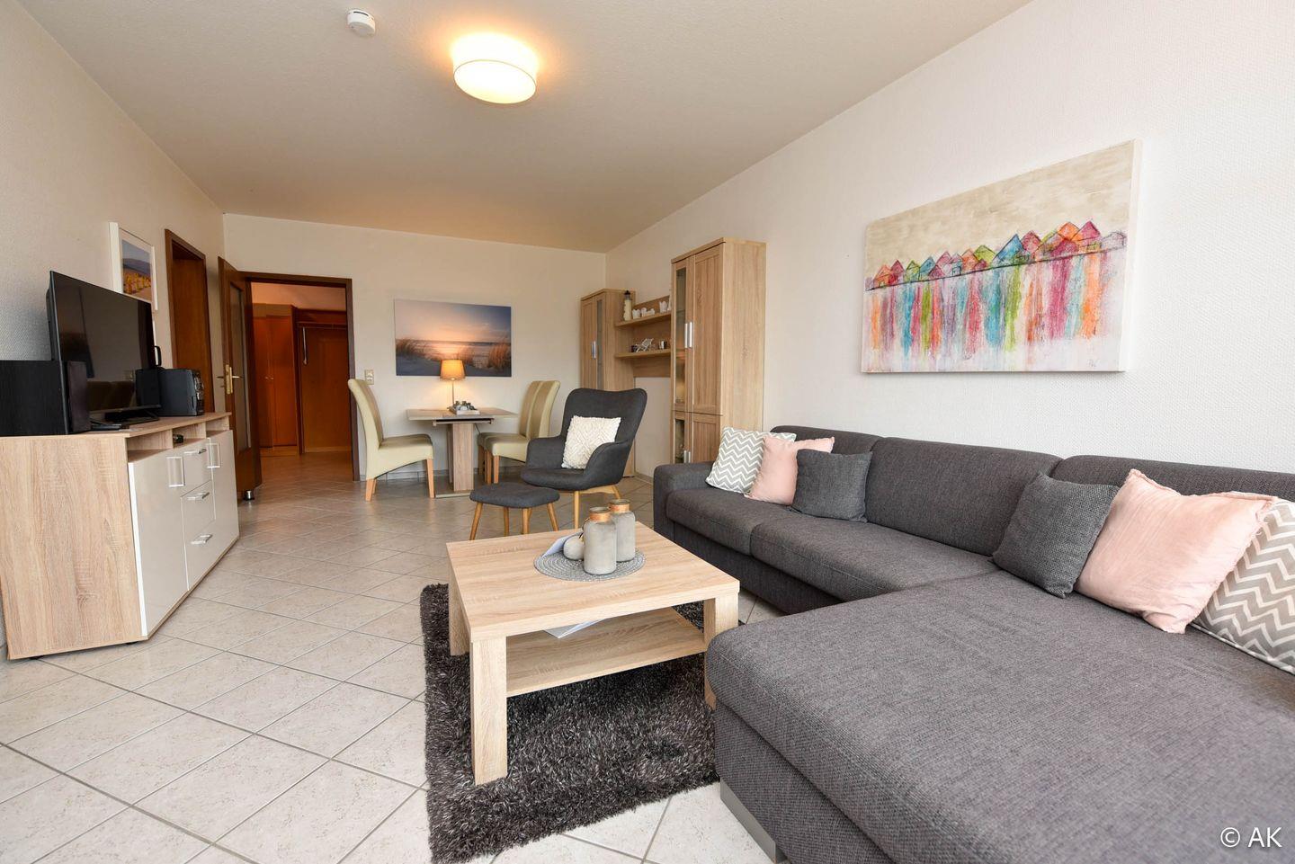 Großzügige 2-Zimmer-Ferienwohnung im 1. OG im Haus LEE mit WLAN. Großzügige geflieste Wohnung mit großem Wohn-/Schlafraum in welchem sich u.a. eine Doppel-Schlafsofagarnitur befindet. Der Küchenraum ist mit einer Küchenzeile, einem Backofen, einer Mikrowelle und einem Geschirrspülautomat, sowie einem Esstisch ausgestattet. Das Schlafzimmer bietet ein Doppelbett und noch Platz für ein Kinderbett. Modernes Duschbad/WC. Zusätzlich gibt es noch einen Balkon und einen Garagenstellplatz. Schwimmbadnutzung kostenfrei!