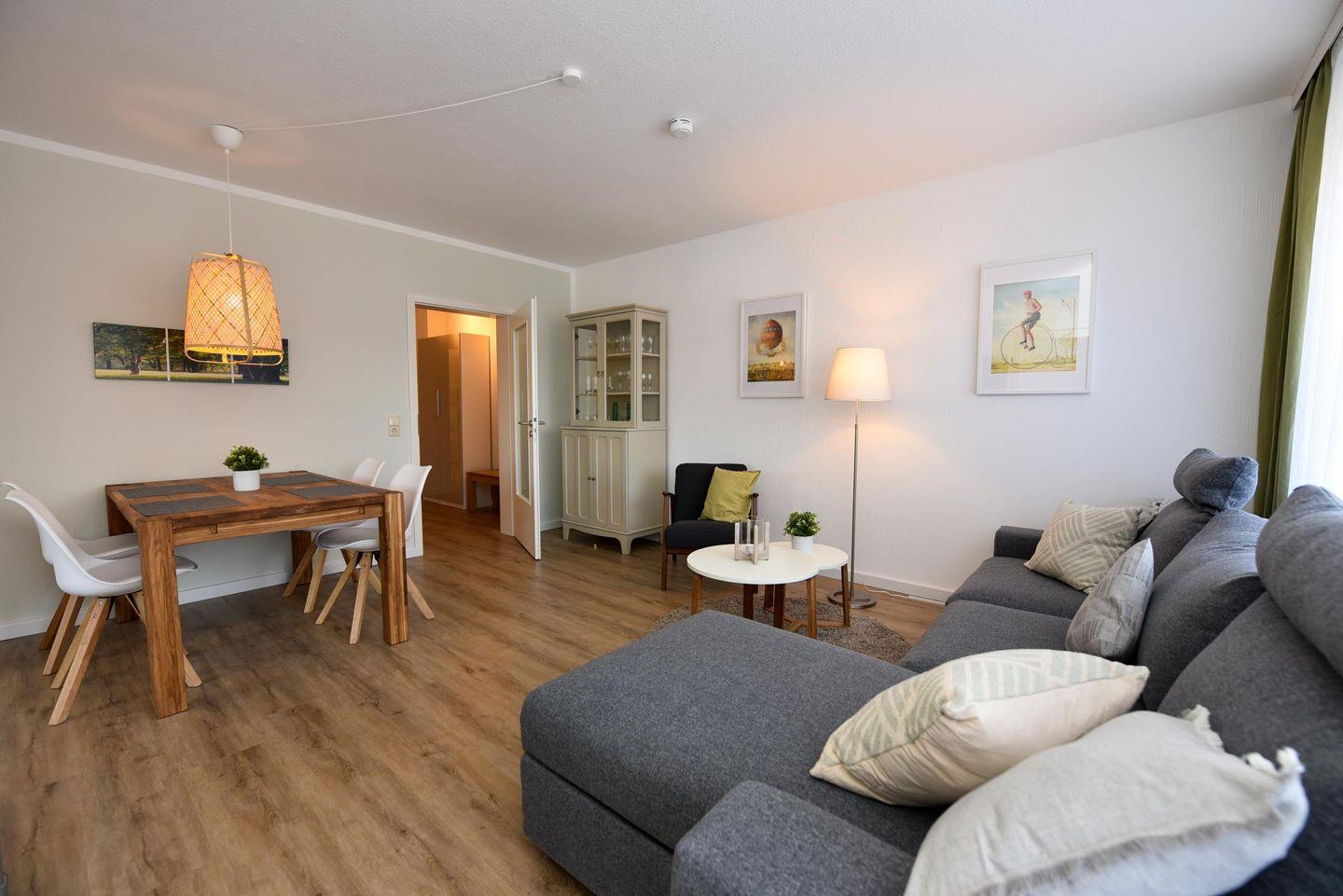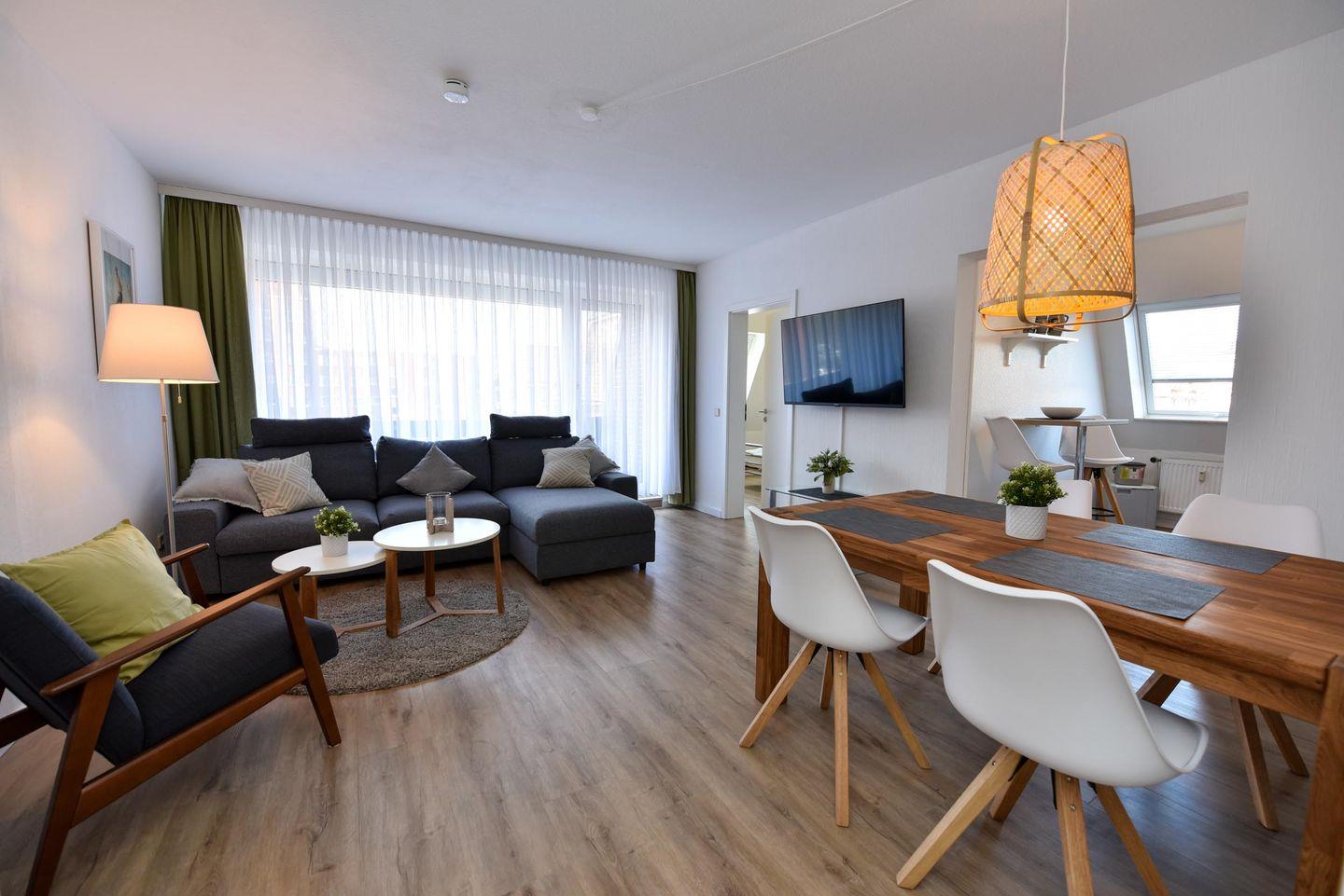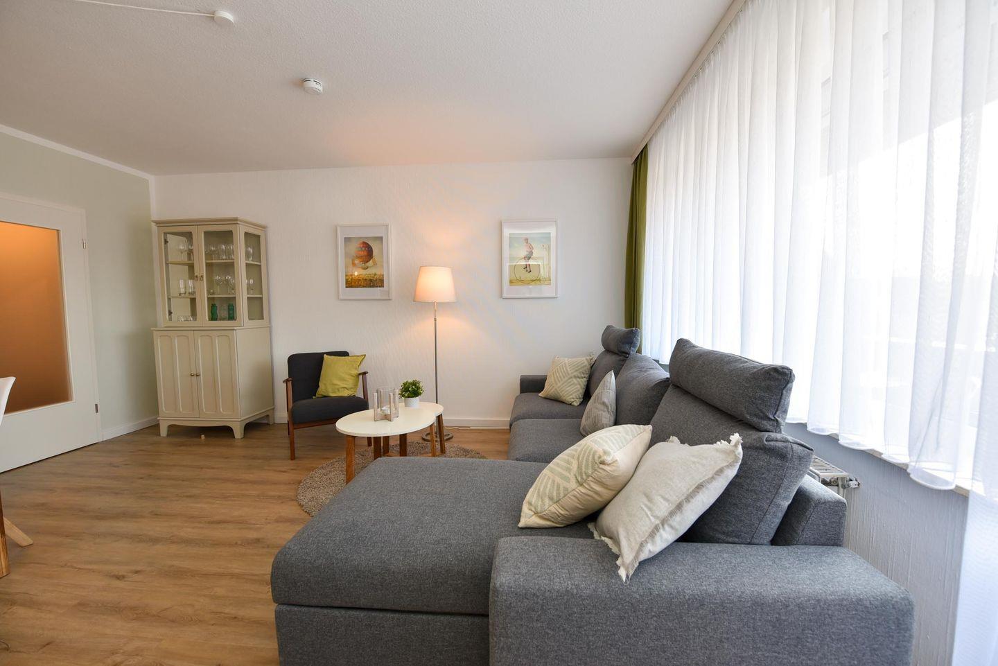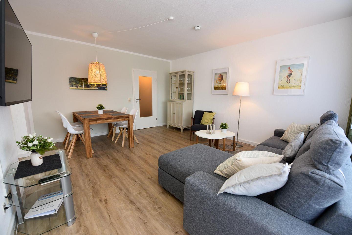 Schön renovierte 2-Zimmer-Ferienwohnung im 2. OG des Hauses LEE. Die großzügige Wohnung besteht aus 1 Wohn-/ Schlafraum (Schlafsofa), Couchgarnitur und 1 Schlafraum mit Doppelehebett. Die neue und zum Wohnbereich offene Küchenzeile mit Geschirrspülmaschine ist voll ausgestattet. Der im Wohnraum befindliche Esstisch bietet 4 Personen ausreichend Platz. Duschbad/WC., Kabel-TV., Süd-West-Balkon. Spielrasen, Spielgerät und Sandkiste auf dem Grundstück, PKW-Stellplatz. Schwimmbadnutzung kostenfrei!