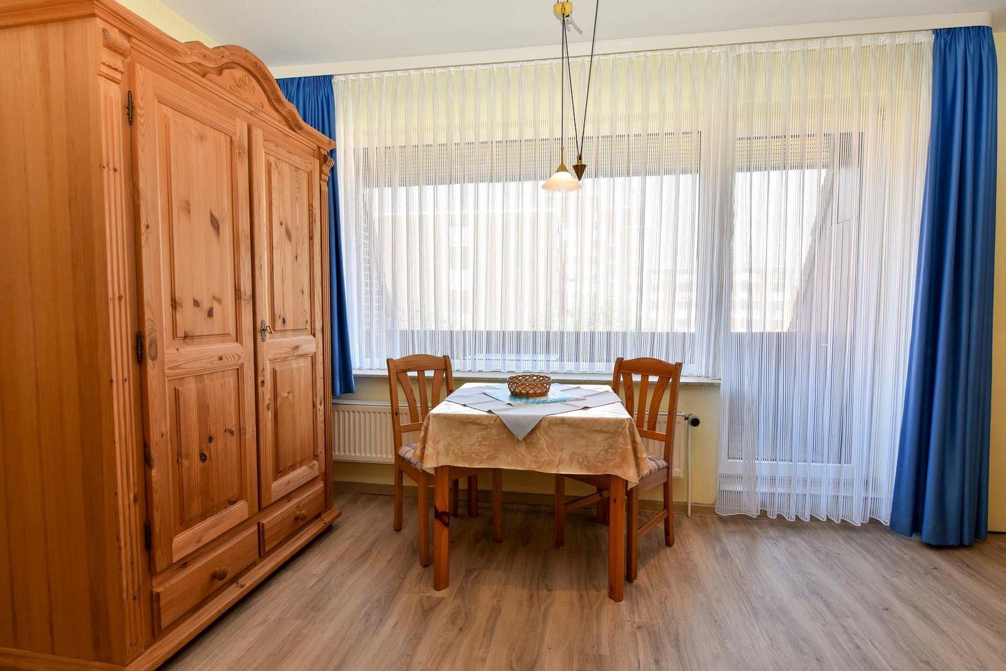 Diese allergikerfreundliche 1-Zimmer-Ferienwohnung liegt im 2. OG des Hauses LEE mit WLAN. Ideal für max. 2 Personen ausgestattet mit einem Wohn-/Schlafraum (Ehebett), einer Couchgarnitur, einem Esstisch und einer kleinen modernen Küchenzeile mit Geschirrspülautomat. Wannenduschbad/WC. Kabel-TV, Südwest Balkon. Zu dem Appartement gehört auch ein PKW-Stellplatz. Schwimmbadnutzung im Haus kostenfrei!