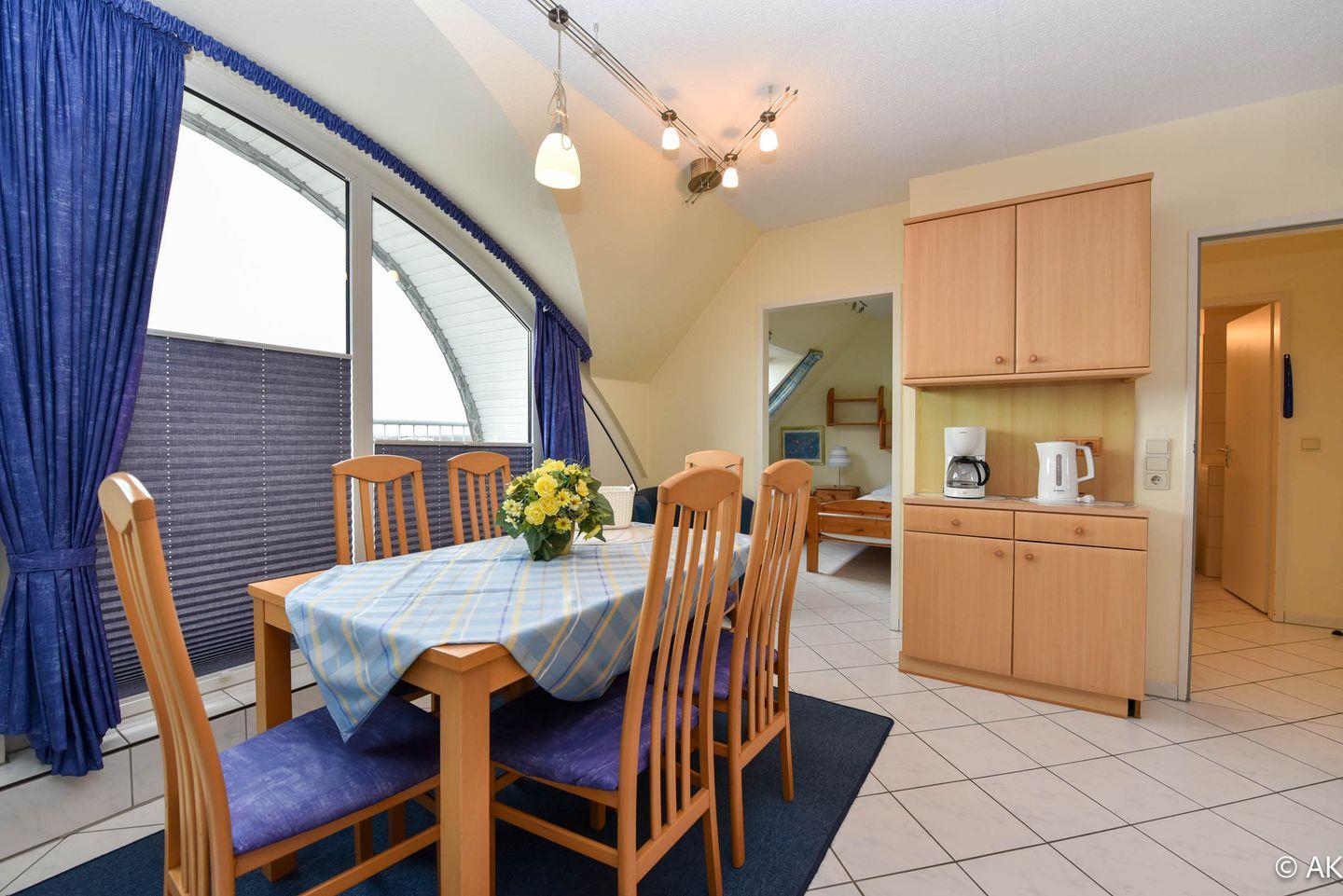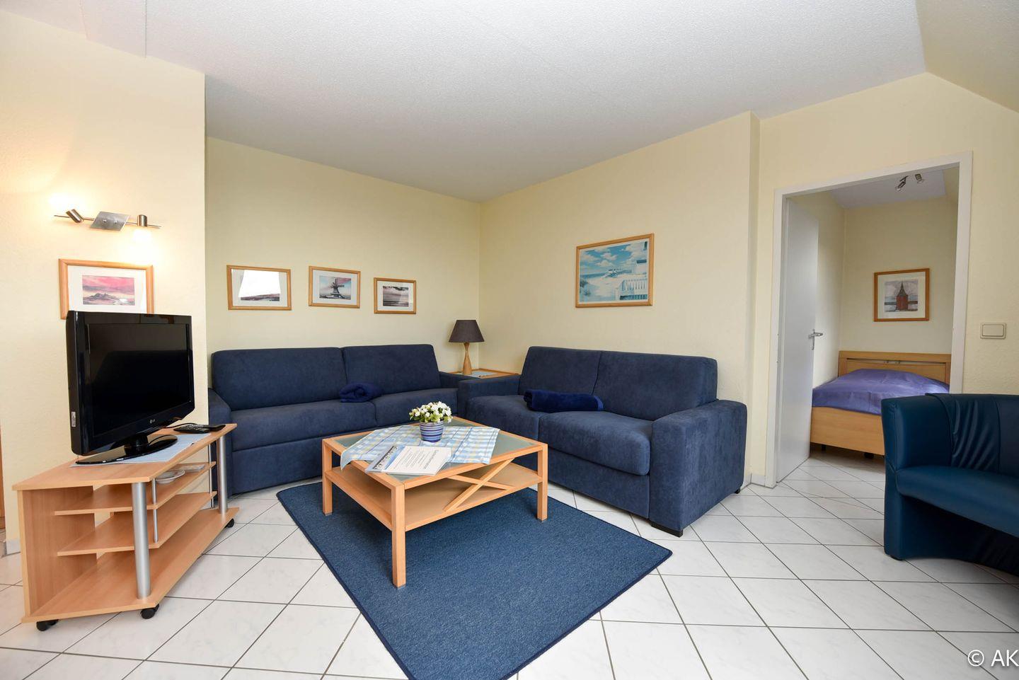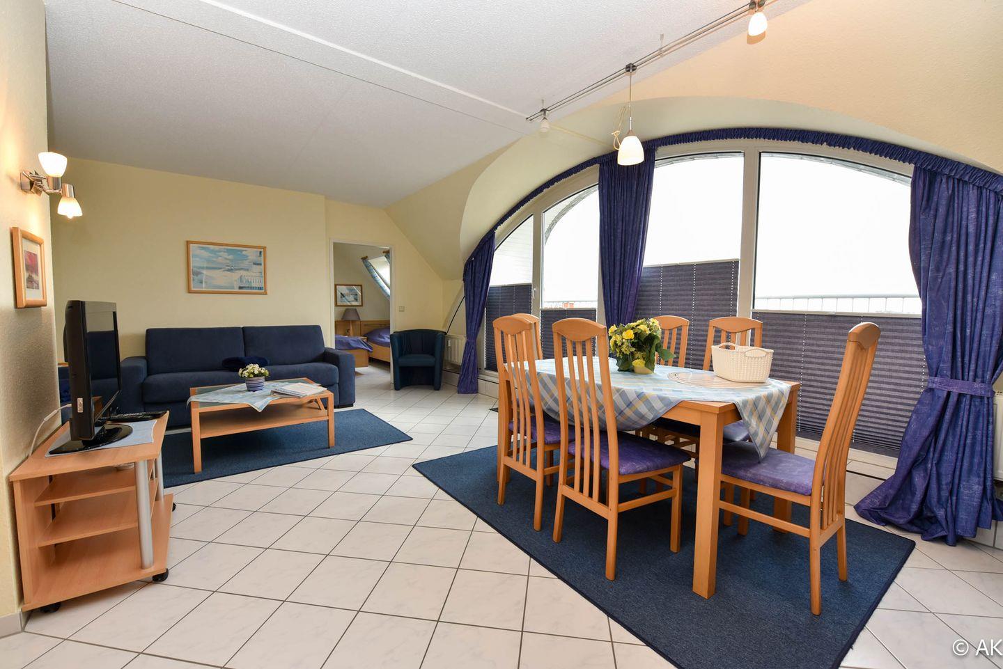 "KAPITÄNS-SUITE" 3-Zimmer Appartement im 5. OG im DEICHGRAF. Ein traumhaftes, großzügiges und allergikerfreundliches Appartement für die ganze Familie. Der Wohn- /Essraum ist mit zwei Schlafsofas, Sessel, einem Couchtisch und einem Esstisch mit 6 Stühlen ausgestattet. Die zwei Schlafzimmer haben jeweils 2 Einzelbetten. Die Suite hat eine moderne Pantry mit einem Vierplattenherd, einer Back-Mikrowelle und einem Geschirrspülautomat. Alle Räume liegen auf der Sonnen/Südseite. Das Appartement ist für bis zu 6 Personen geeignet. Duschbad mit WC. Zum Angebot gehört auch ein kostenfreier PKW-Stellplatz sowie WLAN. Natürlich bieten wir auch hier kostenlos Kinderbetten und Hochstühle für Ihre Kleinen an.