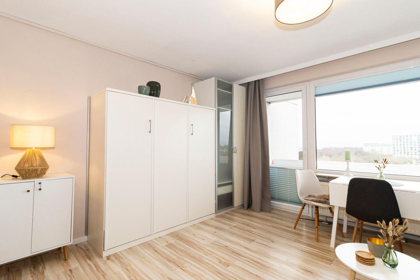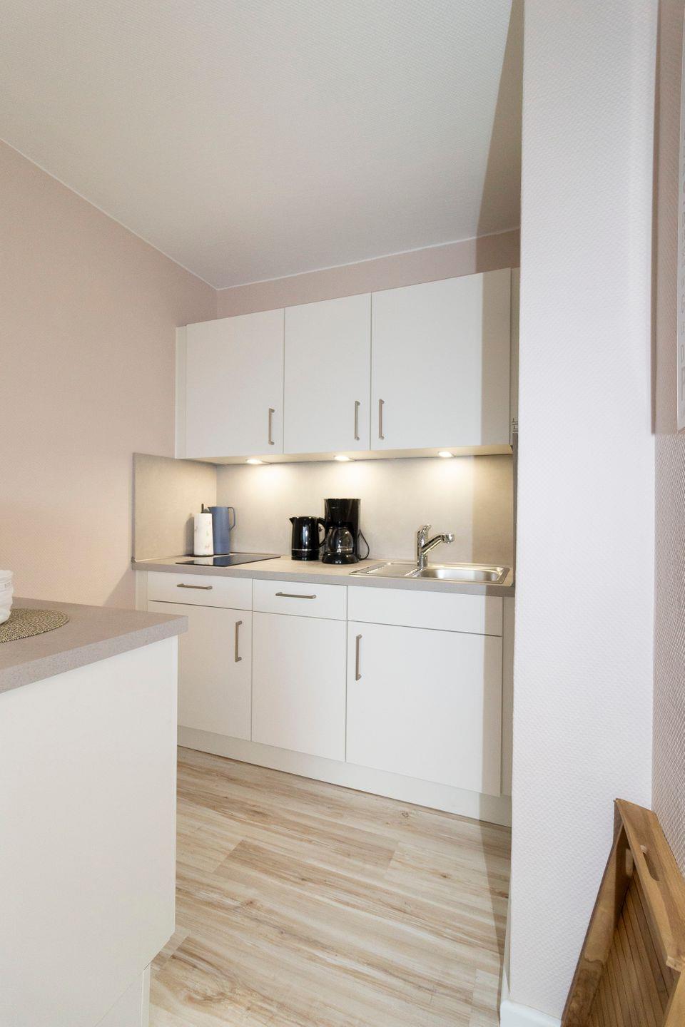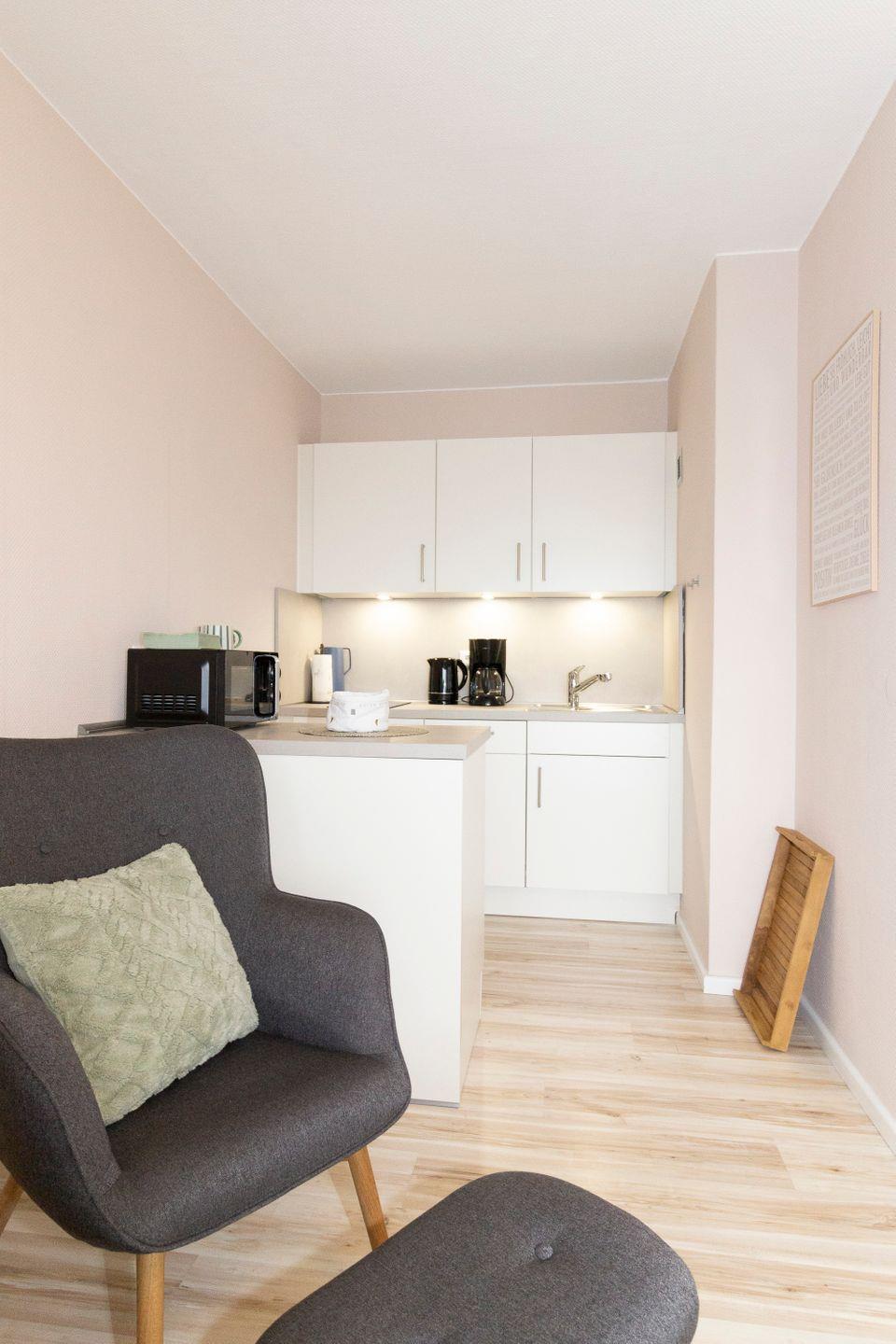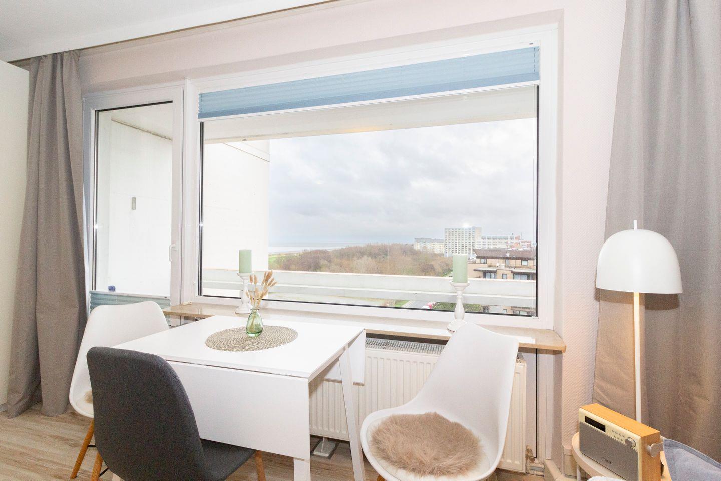 Haus Atlantic in Döse, Fewo im 7. OG, bis 2 Pers. und ein Kind, ca. 35 qm Größe, kombiniertes Wohn-/Schlafzimmer mit Schrankbett , Bettwäsche und Handtücher nicht inklusive, Küchenzeile neu 2024 mit 2-Platten-Ceranfeld, Mikrowelle und Geschirrspüler, Dusche/WC, W-LAN, Pkw-Außenstellplatz, keine Haustiere erlaubt, Nichtraucherwohnung, Strandkorb in den Sommermonaten 2025.