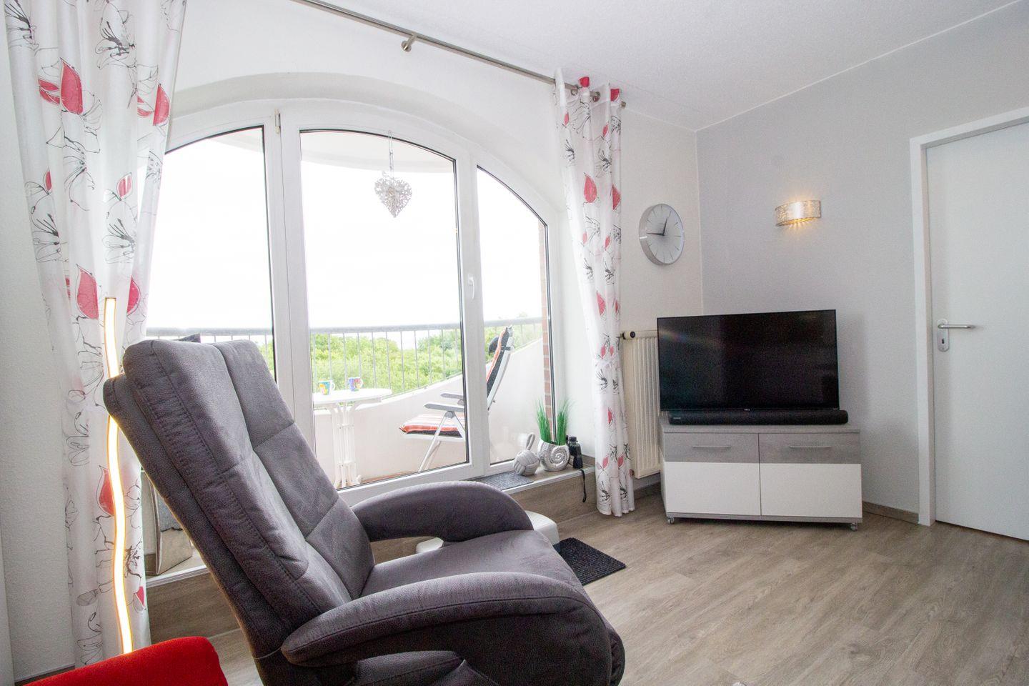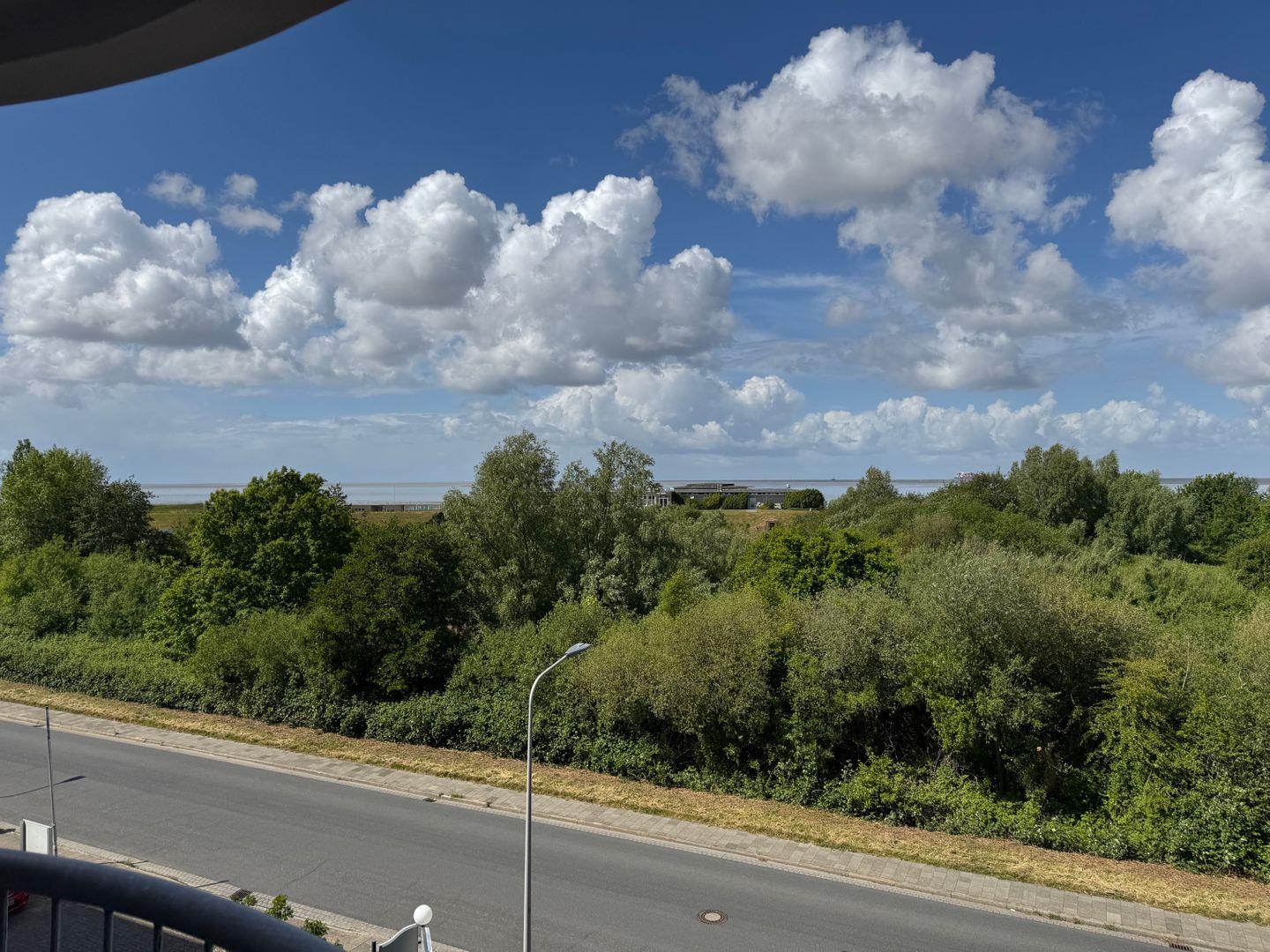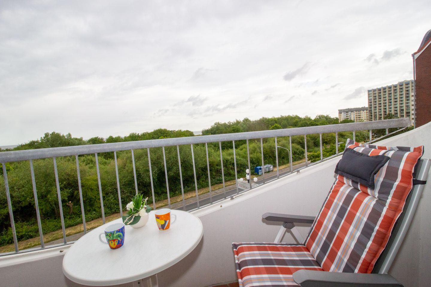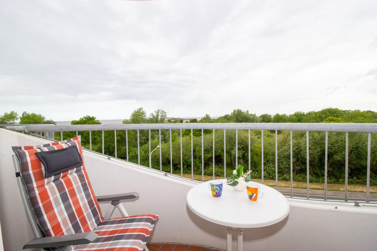Auf dem Balkon der Ferienwohnung erwartet Sie die wunderbare Aussicht aufs Meer. Die Balkonmöbel laden ein, zu jeder Zeit die frische Nordseeluft zu genießen. Perfekt, um den Urlaubstag mit einem Frühstück unter freiem Himmel zu beginnen oder am Abend auf dem Balkon mit einem Glas Wein beim Sonnenuntergang über der Nordsee zu verweilen. Genießen Sie die vorbeifahrenden Container- und Kreuzfahrtschiffe in ihrer imposanten Gestalt, verwandeln Sie Ihr Handy in einen maritimen Schifffahrtsguide und erfahren alles über die gesichteten Schiffe. In der Wohnung liegt ein Fernglas, um die Schiffe noch näher heran zu holen.