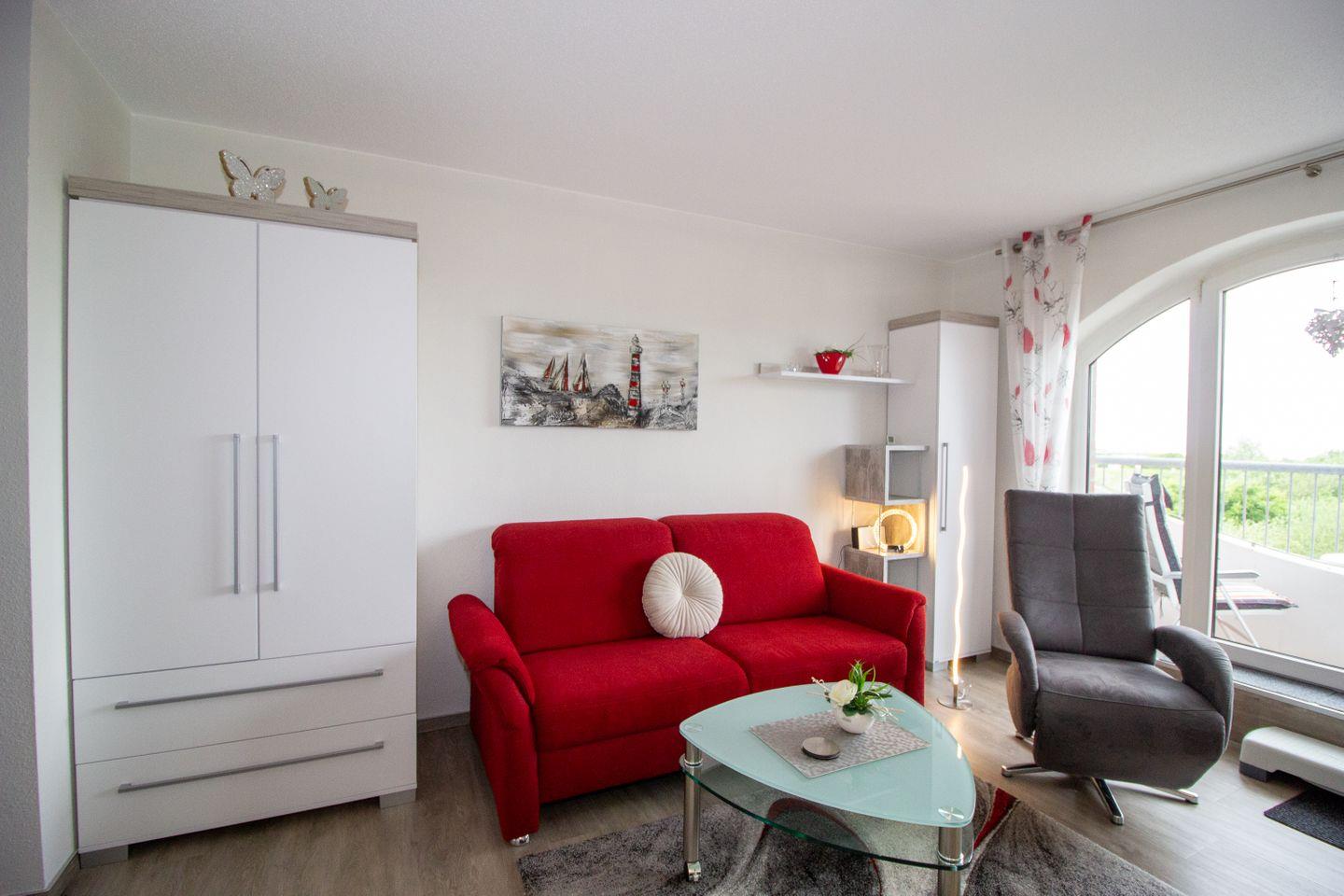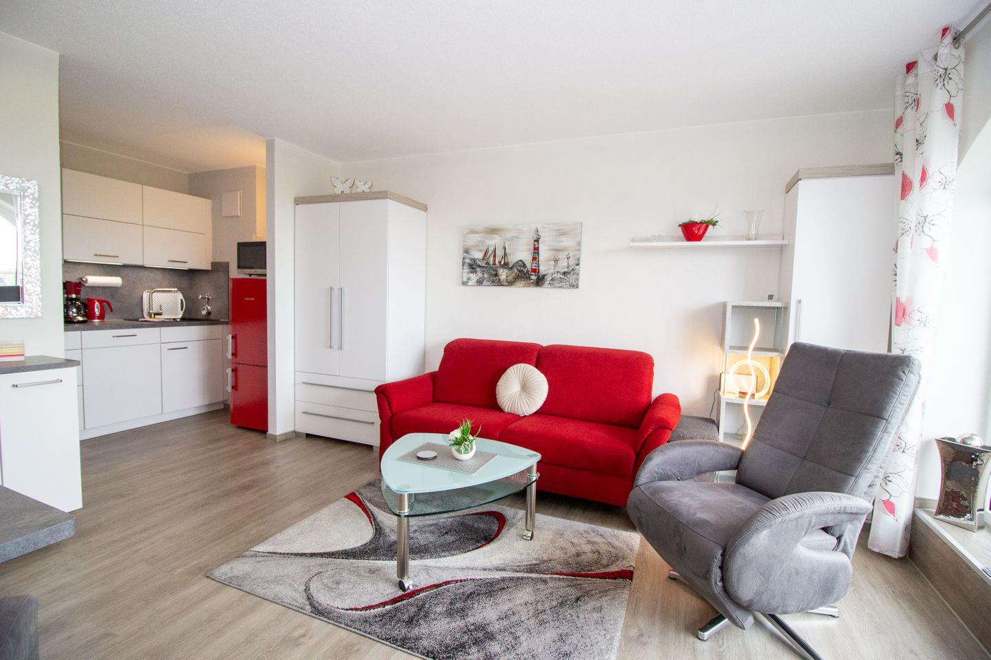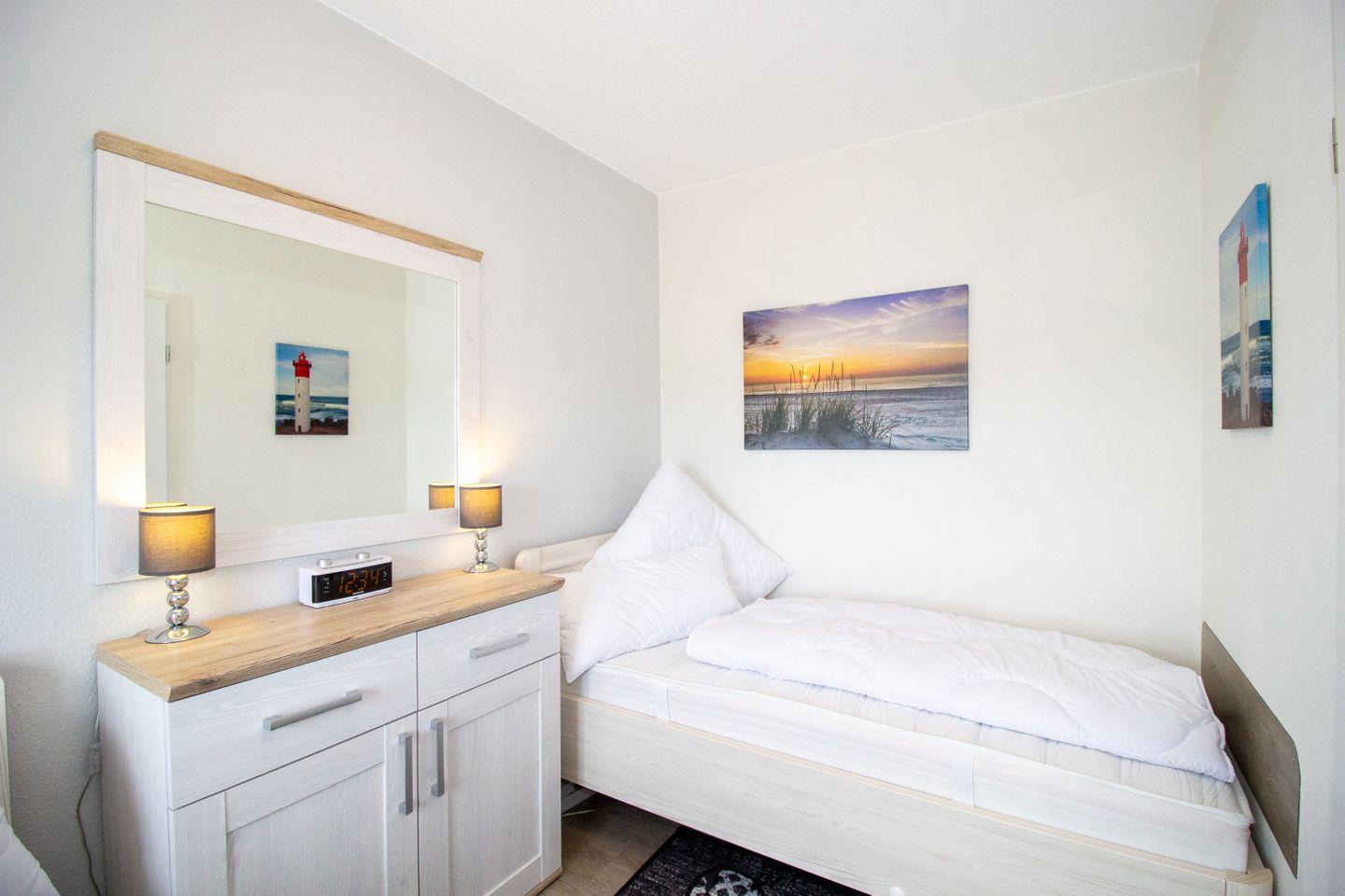 Die Unterkunft erstreckt sich über zwei Zimmer, darunter ein gemütliches Schlafzimmer mit zwei Einzelbetten, das Ihnen einen erholsamen Schlaf in einem ruhigen Ambiente ermöglicht. Das Wohnzimmer lädt mit einem komfortablen Sofa und einem Relax-Sessel zum Entspannen ein und sorgt für eine angenehme Atmosphäre. Hier können Sie die Abende bei einem Film ausklingen lassen oder einfach die Ruhe und den Ausblick auf das Weltnaturerbe Wattenmeer genießen.