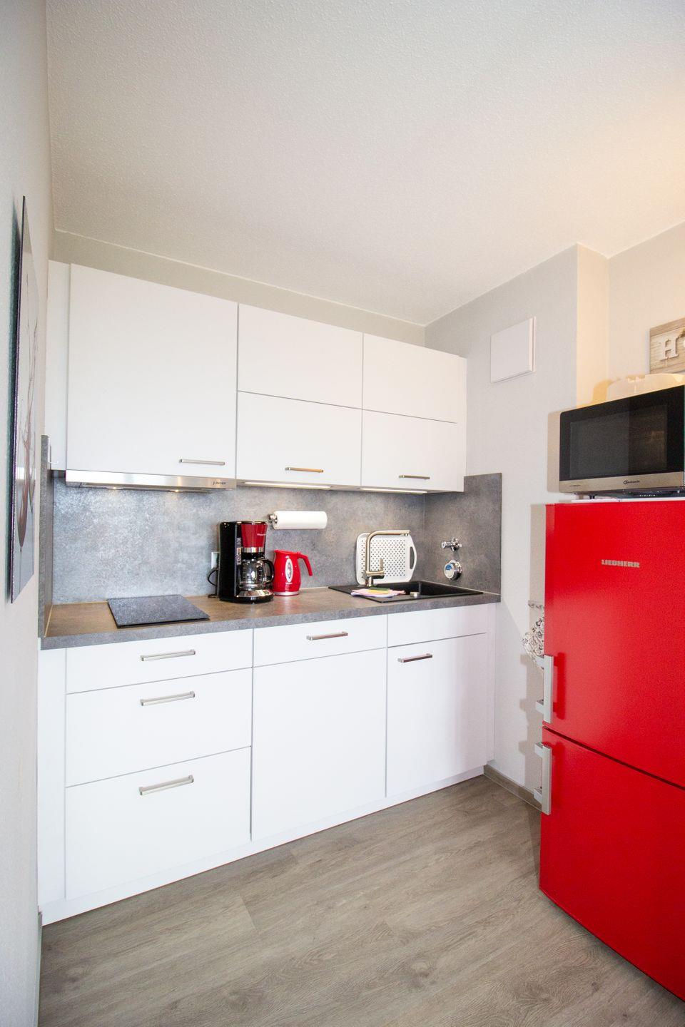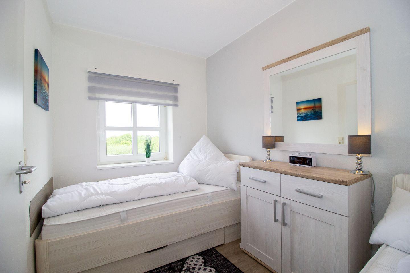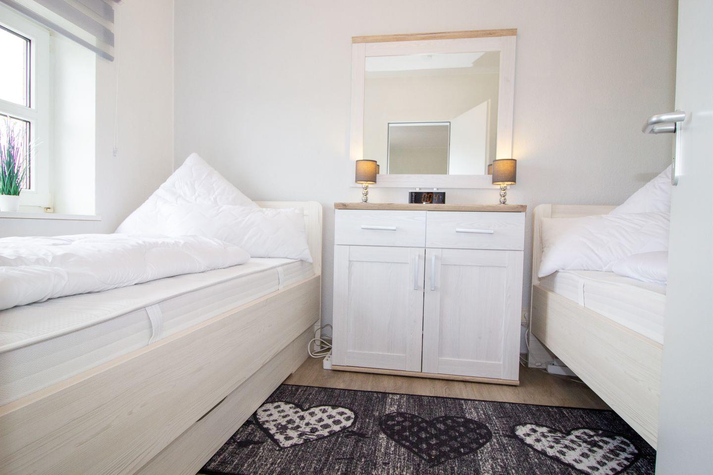 Die Unterkunft erstreckt sich über zwei Zimmer, darunter ein gemütliches Schlafzimmer mit zwei Einzelbetten, das Ihnen einen erholsamen Schlaf in einem ruhigen Ambiente ermöglicht. Das Wohnzimmer lädt mit einem komfortablen Sofa und einem Relax-Sessel zum Entspannen ein und sorgt für eine angenehme Atmosphäre. Hier können Sie die Abende bei einem Film ausklingen lassen oder einfach die Ruhe und den Ausblick auf das Weltnaturerbe Wattenmeer genießen.