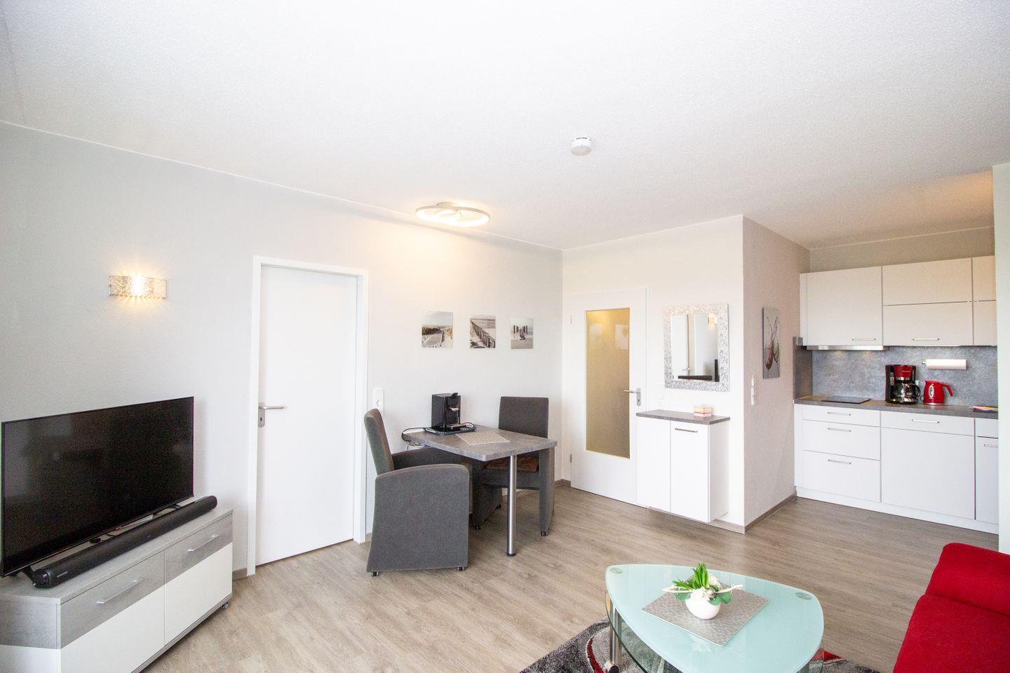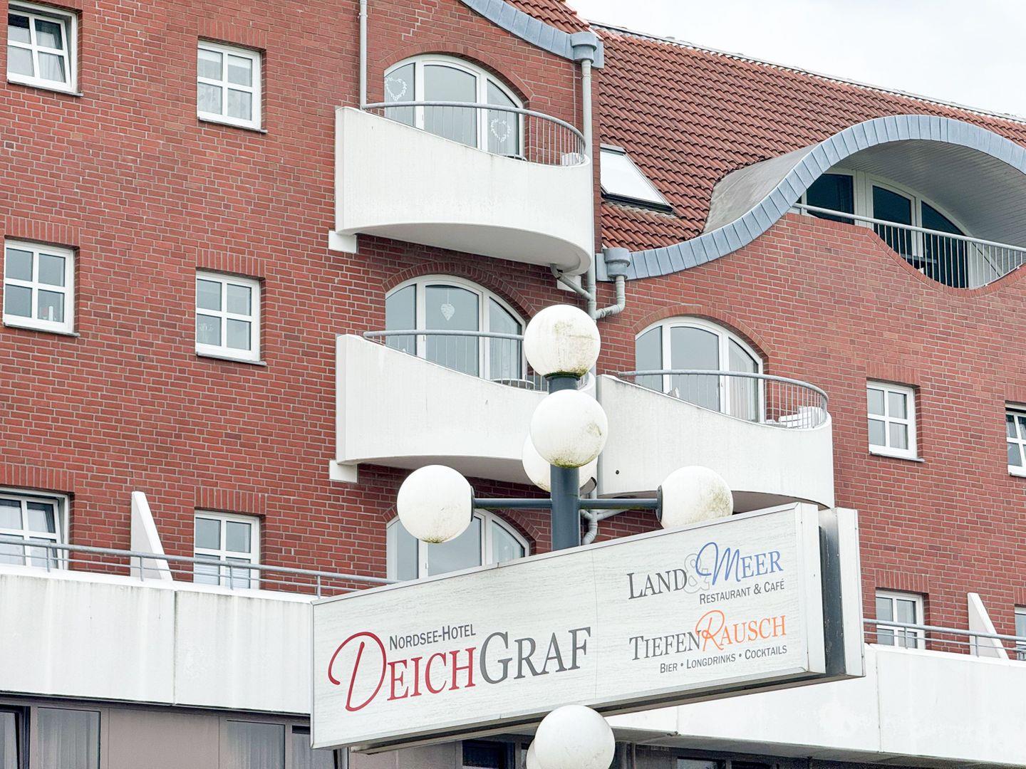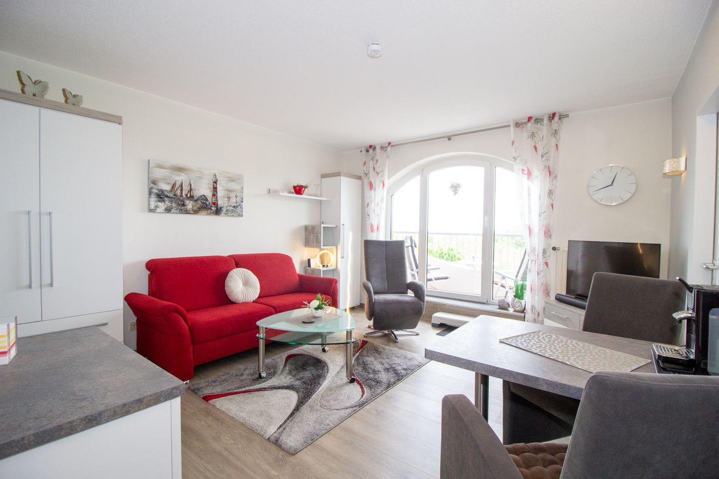 Haus "Deichgraf", App.-Nr. 345, bis 2 Pers., 3. Etage, ca. 38 qm Größe, Nordseite, Meerblick, Schlafzimmer mit 2 Einzelbetten, Offene Küche mit Ceranfeld, Geschirrspüler und Mikrowellen-Backofen-Kombination, Wohnbereich mit Sofa und Relax-Sessel, Bad mit Dusche und WC, Balkon, Kabel-TV, kostenl. WLAN-Zugang im App., Haustiere sind nicht gestattet, Nichtraucherwohnung, Außenstellplatz.
