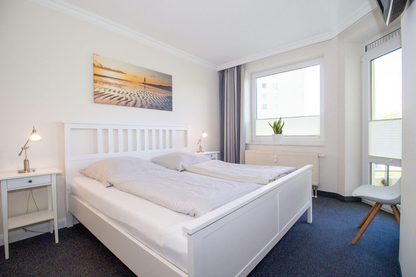 Haus "Kurpark-Residenz", App.-Nr. "121", Typ D2, bis 4 Personen, 1. OG, Westseite, ca. 61 m² Größe, Wohnzimmer mit Flachbild-TV und Bose Soundbar, sep. Schlafzimmer mit Boxspringbett und 2. Flachbild TV, separates 2. innenliegendes Schlafzimmer mit Doppelbett, Dusche, WC separat, Küchenzeile mit Geschirrspüler, Mikrowelle und Backofen, Loggia Richtung Westen mit Zugang vom Wohn- und Schlafzimmer, SAT-TV, kostenl. W-Lan Zugang im App., Tiefgaragenstellplatz, Strandkorb im Sommer 2026.