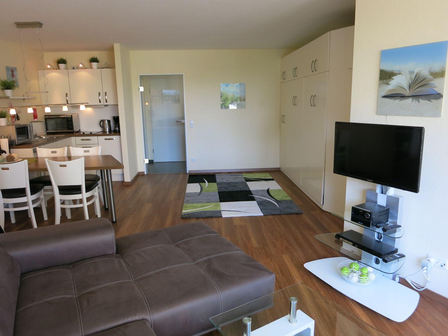 Über den Wohnbereich gelangen Sie auf den Balkon der Ferienwohnung. Hier können Sie jederzeit die frische Nordseeluft genießen.