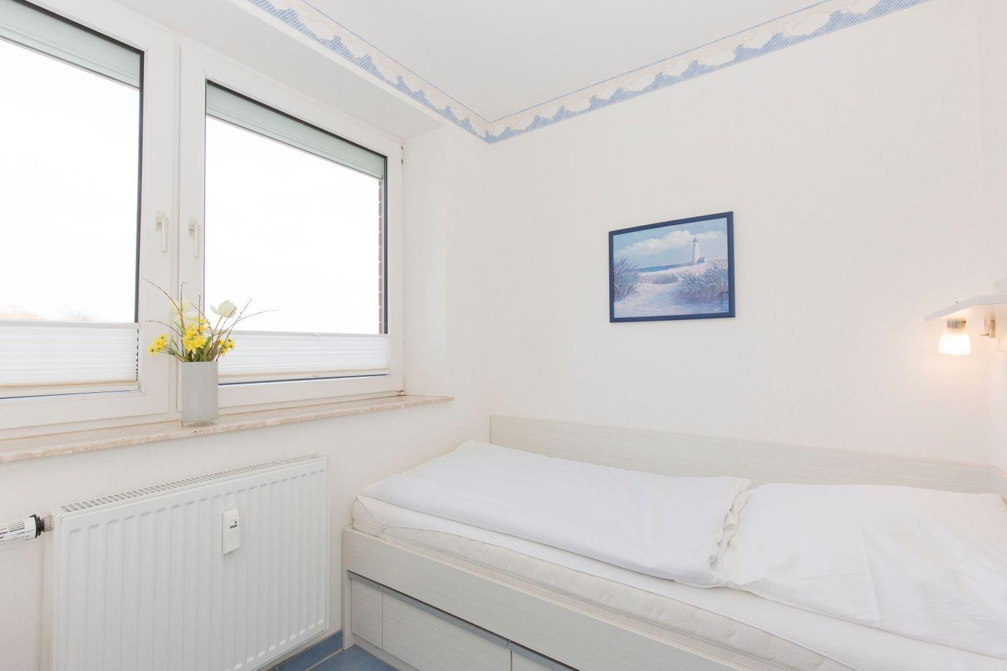 Haus "Lord Nelson", Typ 1, App.-Nr. "120", bis 4 Personen, 1. Etage, ca. 43 qm, Blick Richtung Weltschifffahrtsweg (ohne Meerblick/Richtung Elbe), Wohnbereich mit Schrankbett, separates Schlafzimmer mit zwei Einzelbetten, Dusche/WC, Küchenzeile mit Geschirrspüler, 2-Platten-Ceranfeld und Mikrowelle, Balkon, Telefon, Kabel-TV (Flat-Screen),kostenl. W-Lan Zugang im App., Tiefgaragenstellplatz, Haustiere sind nicht erlaubt, Nichtraucherwohnung, Strandkorb im Sommer 2025.