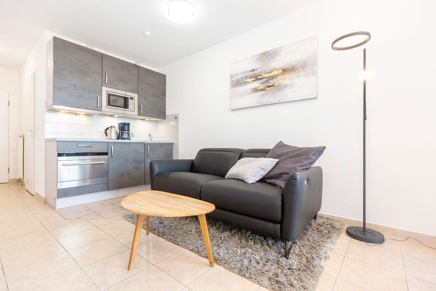Haus "Kurpark-Residenz", Typ A, App.-Nr. "241", bis 2 Personen, 2. OG, ca. 38 m² Größe, Nordseite (Seeseite, Blickrichtung "Elbmündung"), Wohnzimmer mit Couch, sep. Schlafzimmer mit Boxspringbett (großes Laken), Dusche/WC, Küchenzeile mit Mikrowelle, Loggia, SAT-TV, kostenl. W-Lan Zugang im App., Tiefgaragenstellplatz, Strandkorb im Sommer 2026.