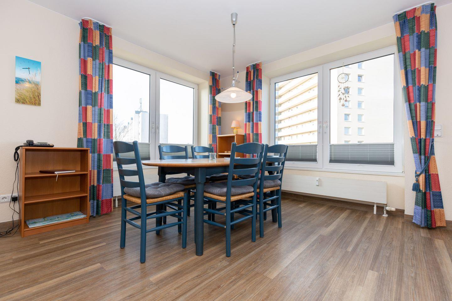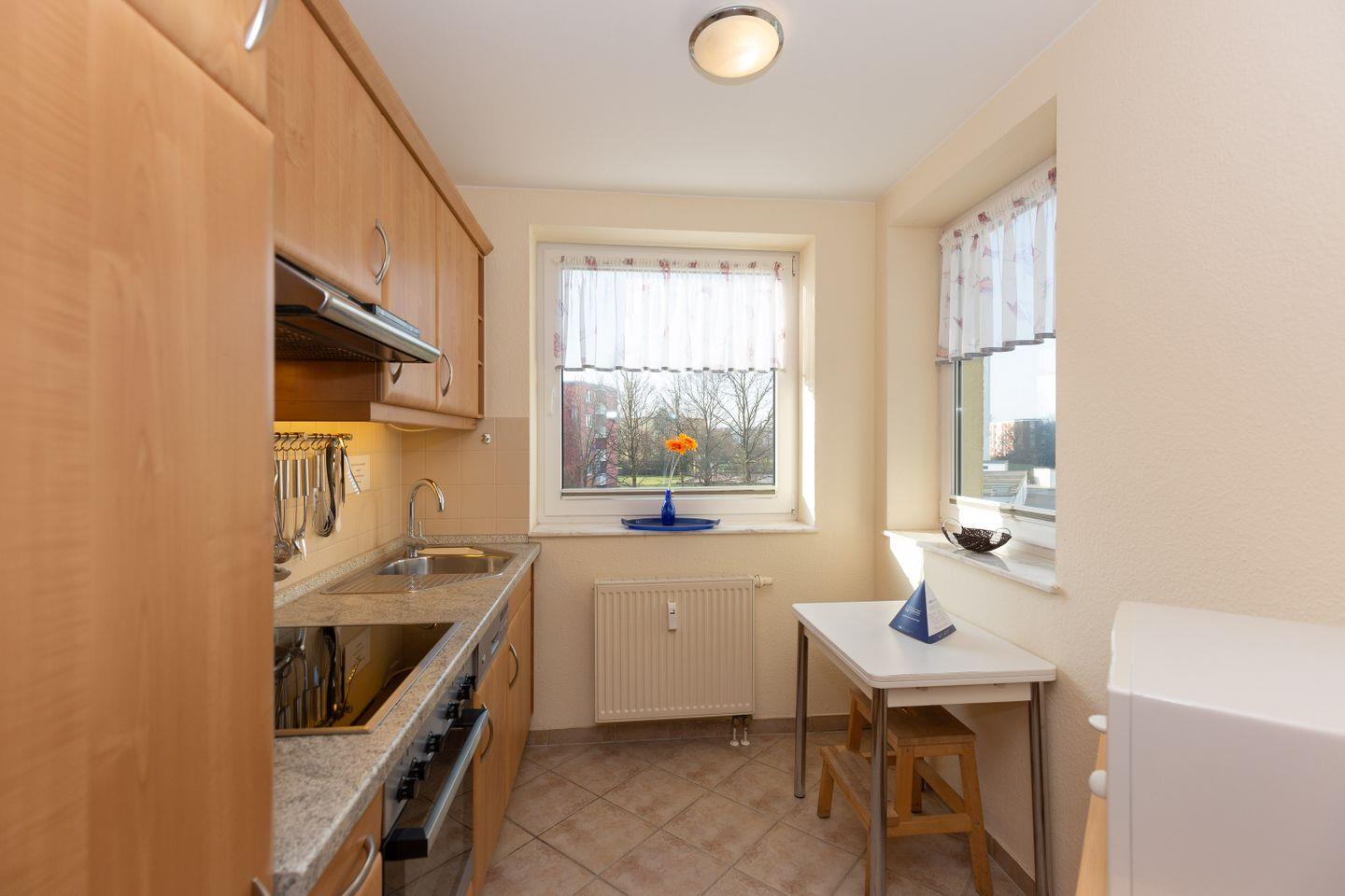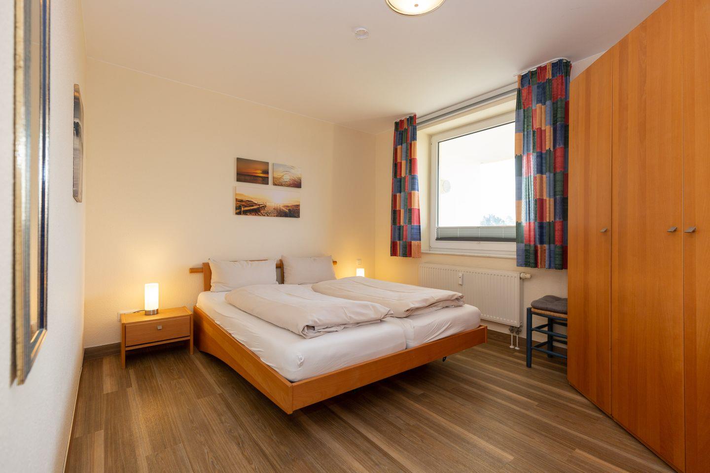 Haus "Kurpark-Residenz", Typ E2, Appartement-Nr. "123", bis 4 Personen, 1. OG, Südseite (Parkseite),ca. 75 m² Wohnungsgröße, Wohnzimmer, separates Schlafzimmer mit Doppelbett und TV, zweites separates Schlafzimmer mit Tageslicht, Einzelbetten und TV, Hochstuhl, Dusche/WC, separate Küche mit Mikrowelle, Backofen und Geschirrspüler,