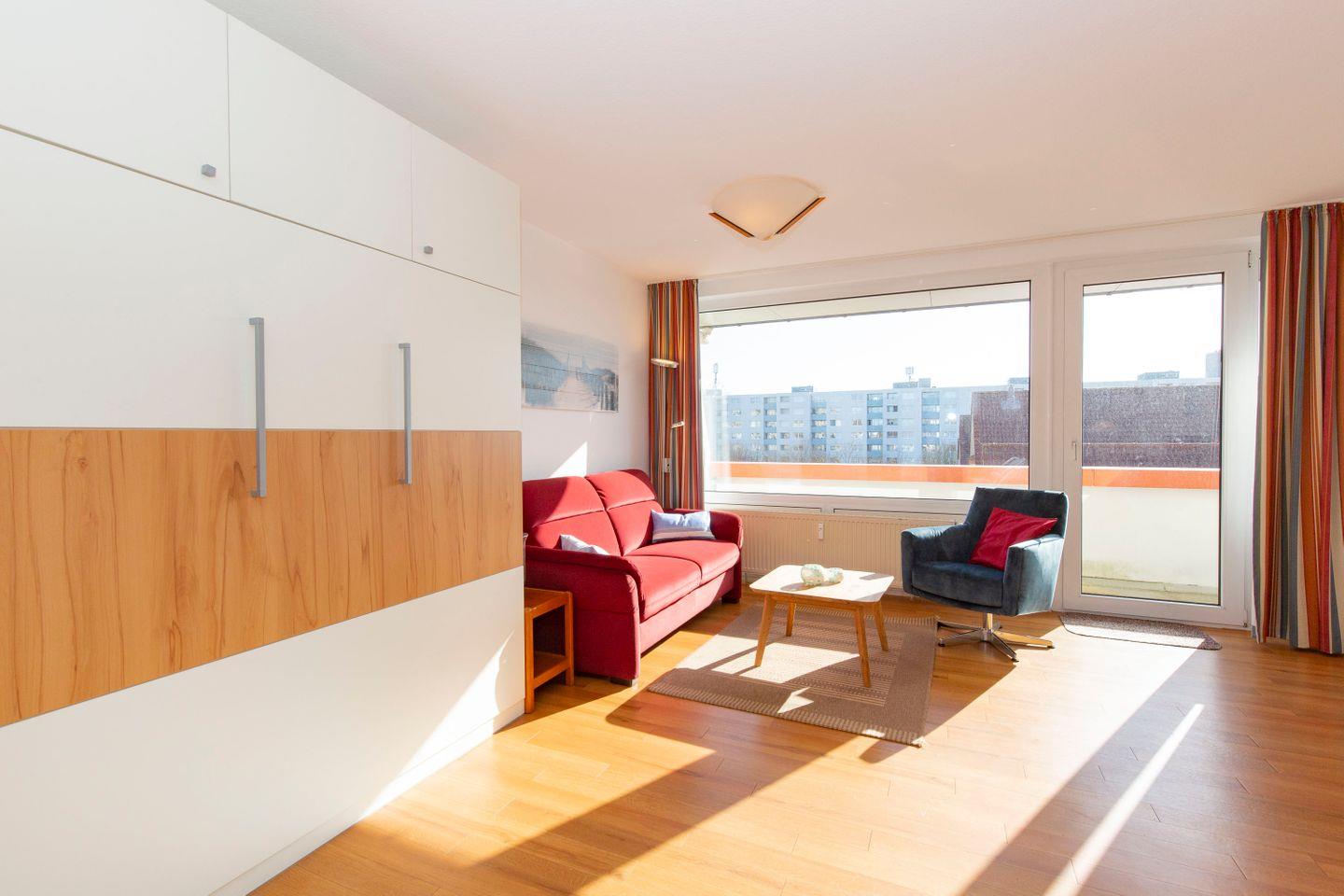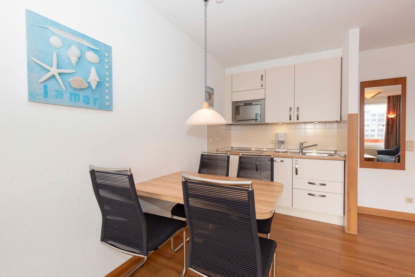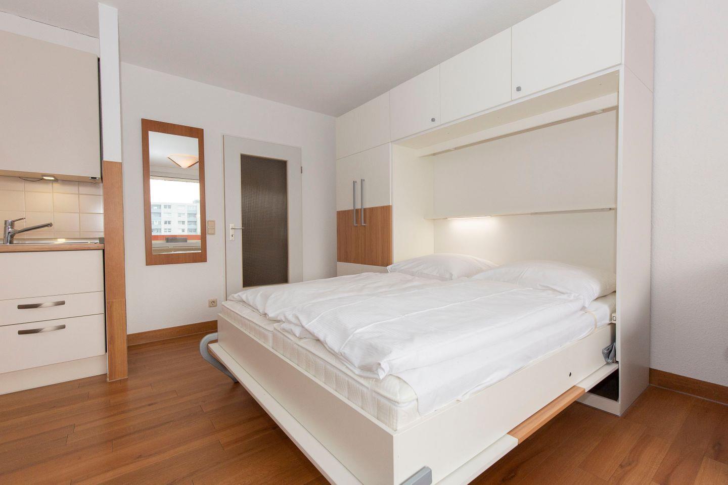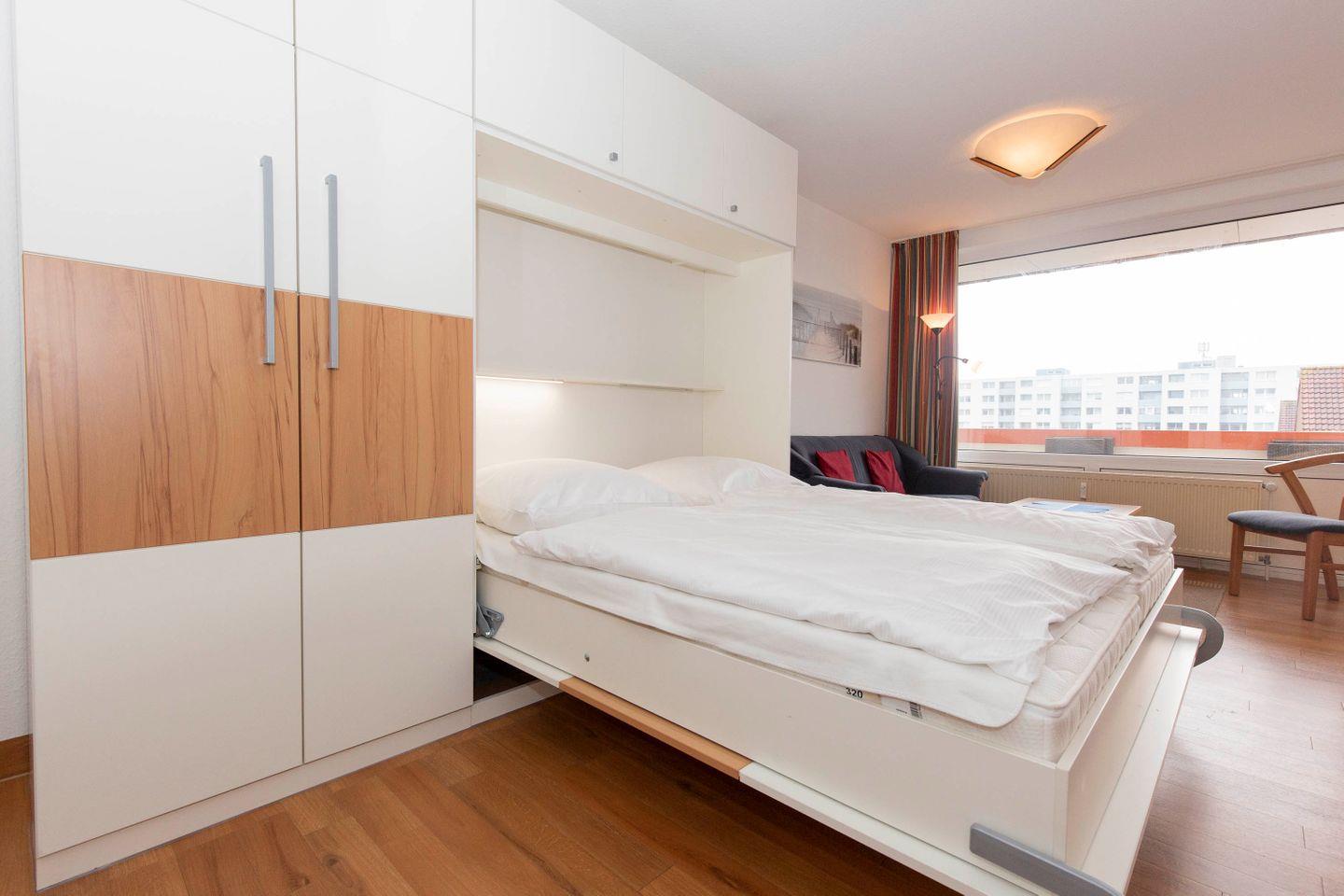 Haus "Trafalgar", Typ A, Appartement-Nr. "430", bis 2 Pers., 4. Etage, Ostseite (ohne Meerblick), Wohn/Schlafraum mit Schrankbett, Küchenzeile mit Geschirrspüler und Mikrowelle inkl. Grill, Dusche/WC, ca. 34 qm Wohnungsgröße, Nichtraucher, Balkon, Kabel-TV, kostenl. W-Lan im App, Nichtraucher, Tiefgaragenstellplatz, Strandkorb im Sommer 2026. Ab 5 Übernachtungen 1 Wäschepaket p.P. inkl., ein Hund pro Buchung gegen Gebühr erlaubt.