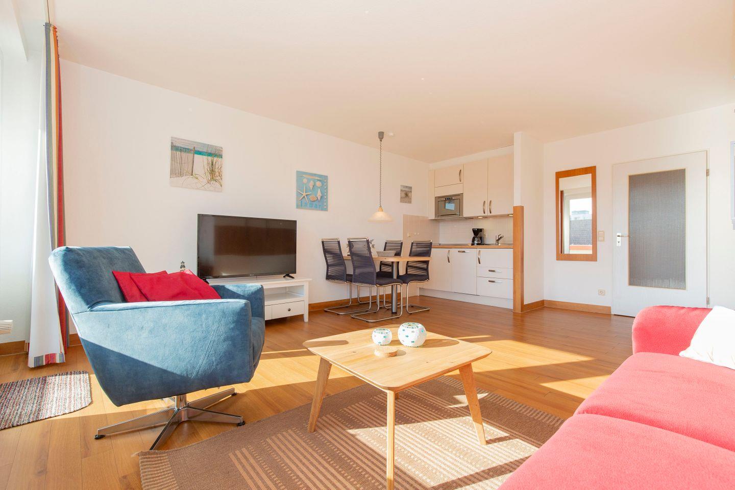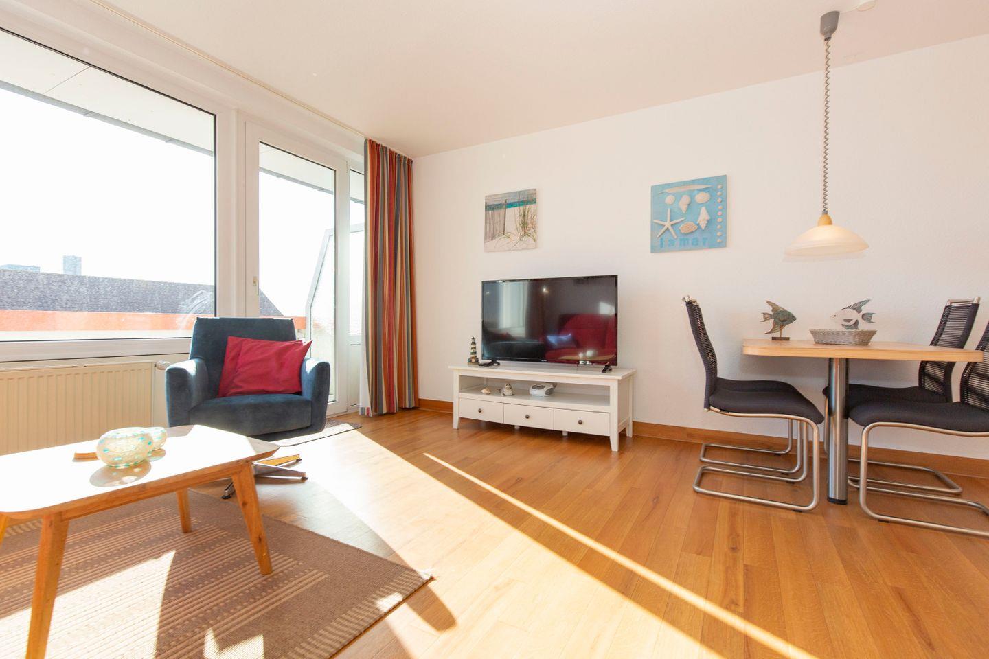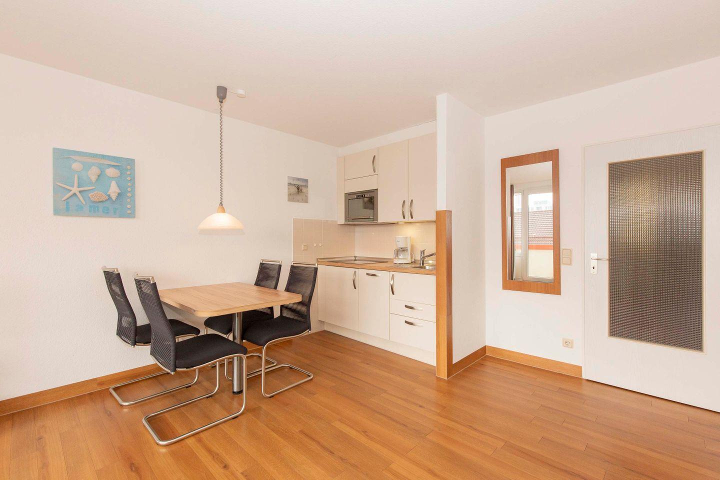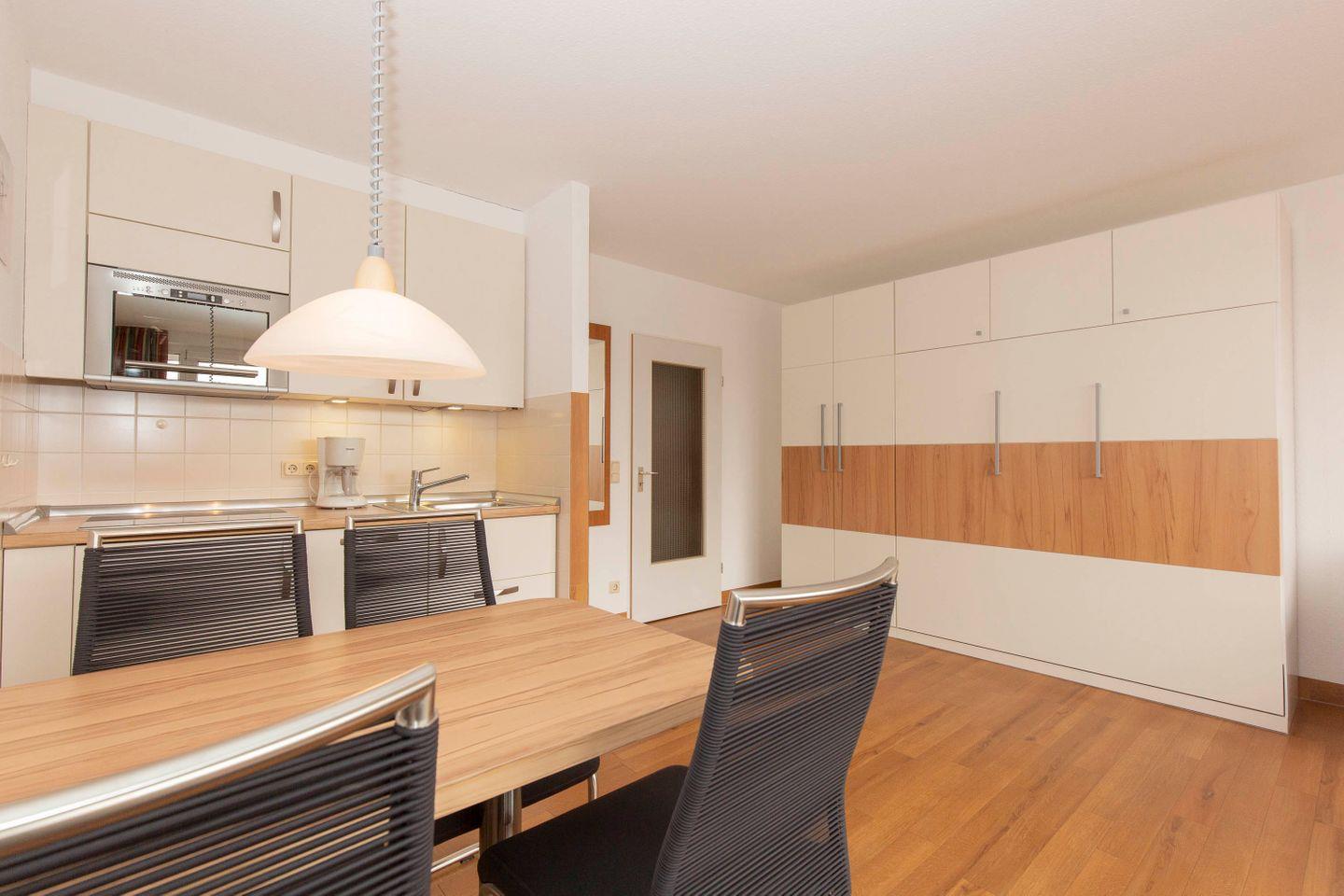 Haus "Trafalgar", Typ A, Appartement-Nr. "430", bis 2 Pers., 4. Etage, Ostseite (ohne Meerblick), Wohn/Schlafraum mit Schrankbett, Küchenzeile mit Geschirrspüler und Mikrowelle inkl. Grill, Dusche/WC, ca. 34 qm Wohnungsgröße, Nichtraucher, Balkon, Kabel-TV, kostenl. W-Lan im App, Nichtraucher, Tiefgaragenstellplatz, Strandkorb im Sommer 2026. Ab 5 Übernachtungen 1 Wäschepaket p.P. inkl., ein Hund pro Buchung gegen Gebühr erlaubt.
