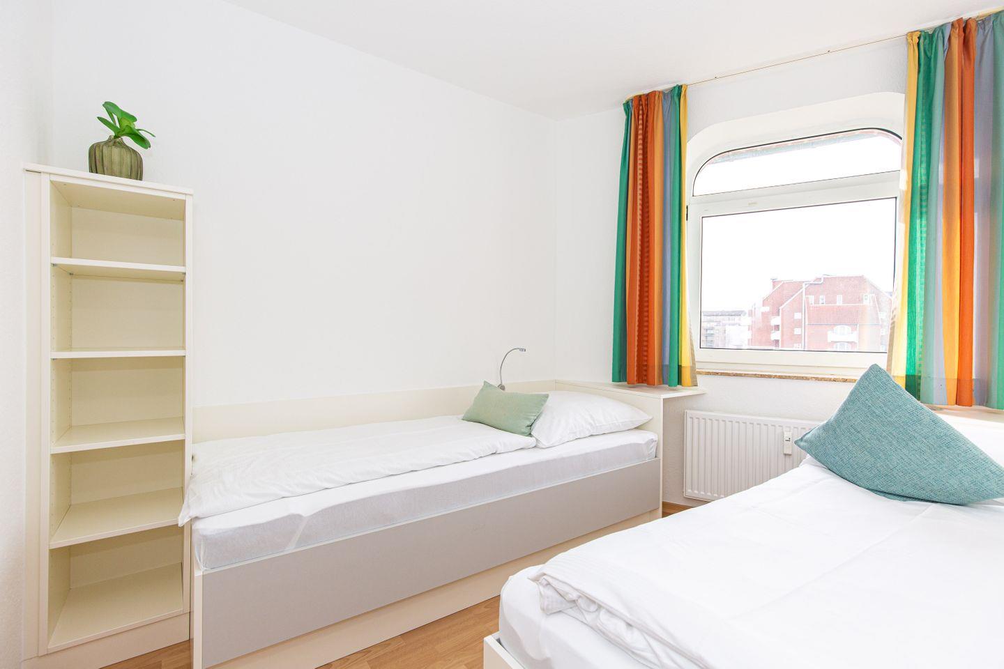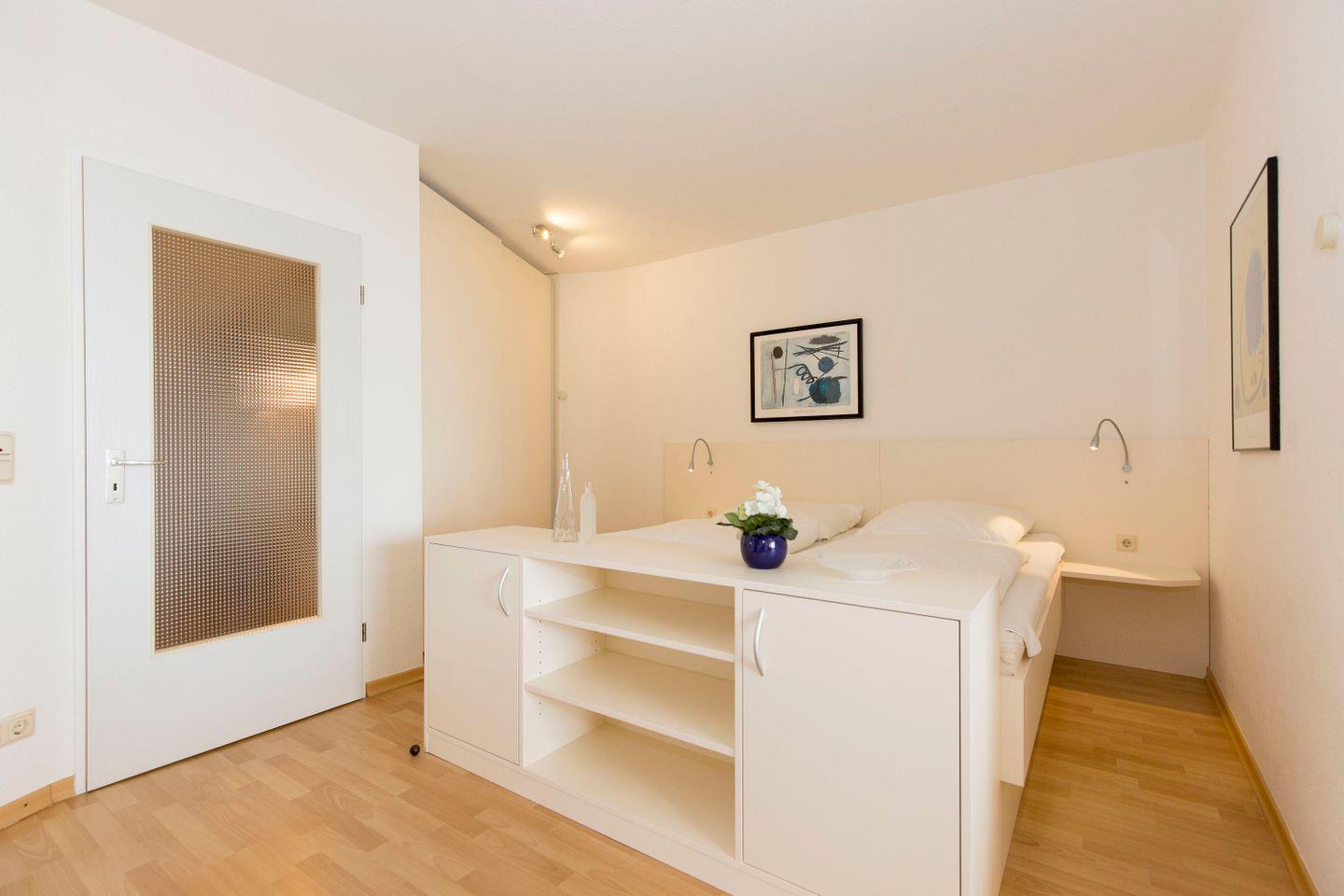 Haus "Trafalgar", Typ C, Appartement-Nr. 323, bis 4 Personen, 3.Etage, ca. 55 qm, Westseite (Meerblick), Wohn/Schlafraum mit Doppelbett, separates Schlafzimmer mit zwei Einzelbetten, Küchenzeile mit Mikrowelle, 4-Platten-Ceranfeld, Geschirrspüler, Dusche/WC, Balkon, Kabel-TV, WLAN im App., Tiefgaragenstellplatz, Nichtraucherappartement, keine Haustiere erlaubt, Strandkorb im Sommer 2026.