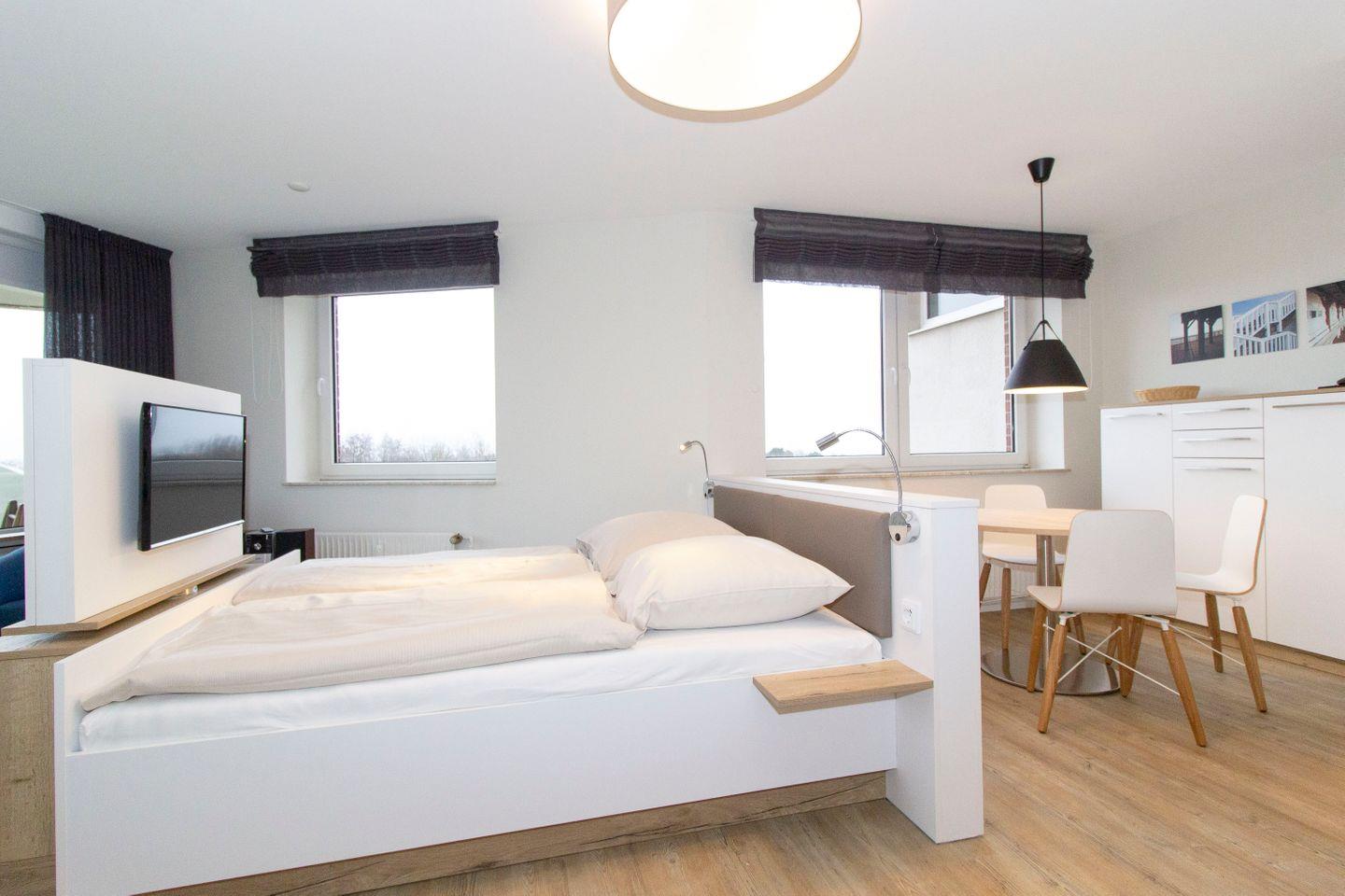 Haus "Lord Nelson", Typ 1, App.-Nr. 401, bis 2 Pers., 4. Etage, ca. 43 qm, Meerblick Richtung Neuwerk und Elbmündung, Wohnbereich mit einem Doppelbett, Dusche/WC, Küchenzeile mit Geschirrspüler, Mikrowelle mit Grillfunktion und 2-Platten-Ceranfeld, Balkon, Kabel-TV, kostenl. W-Lan Zugang im App., CD-Kassetten-Radio, Tiefgaragenstellplatz, Haustiere sind auf Anfrage erlaubt, Nichtraucherwohnung, Strandkorb im Sommer 2026.