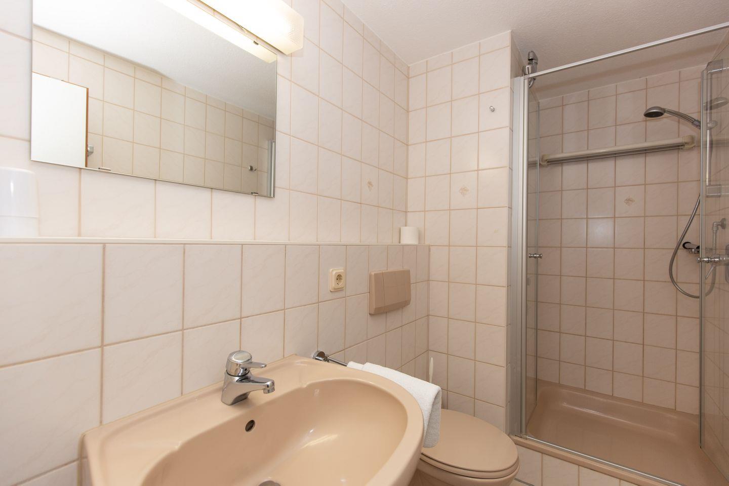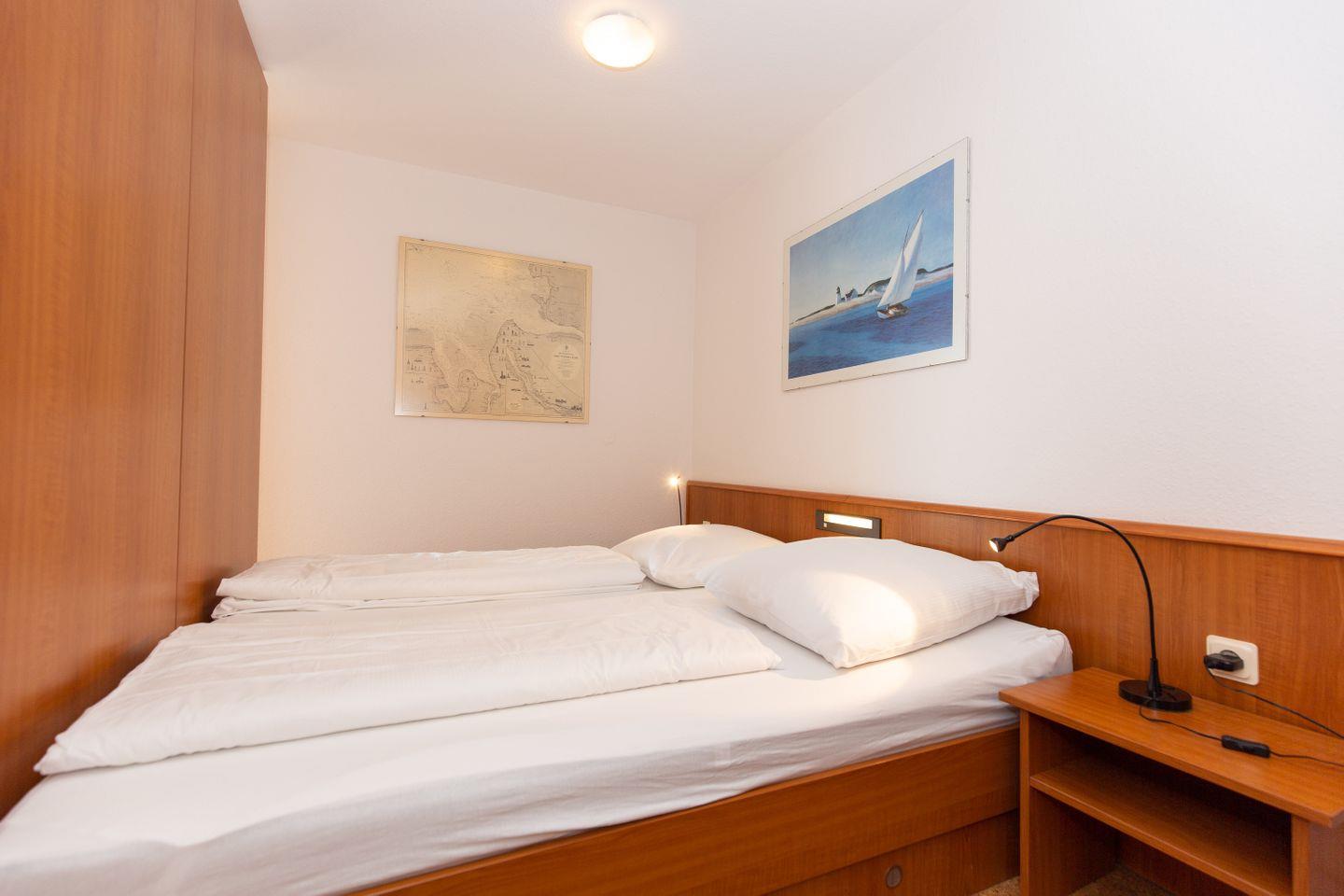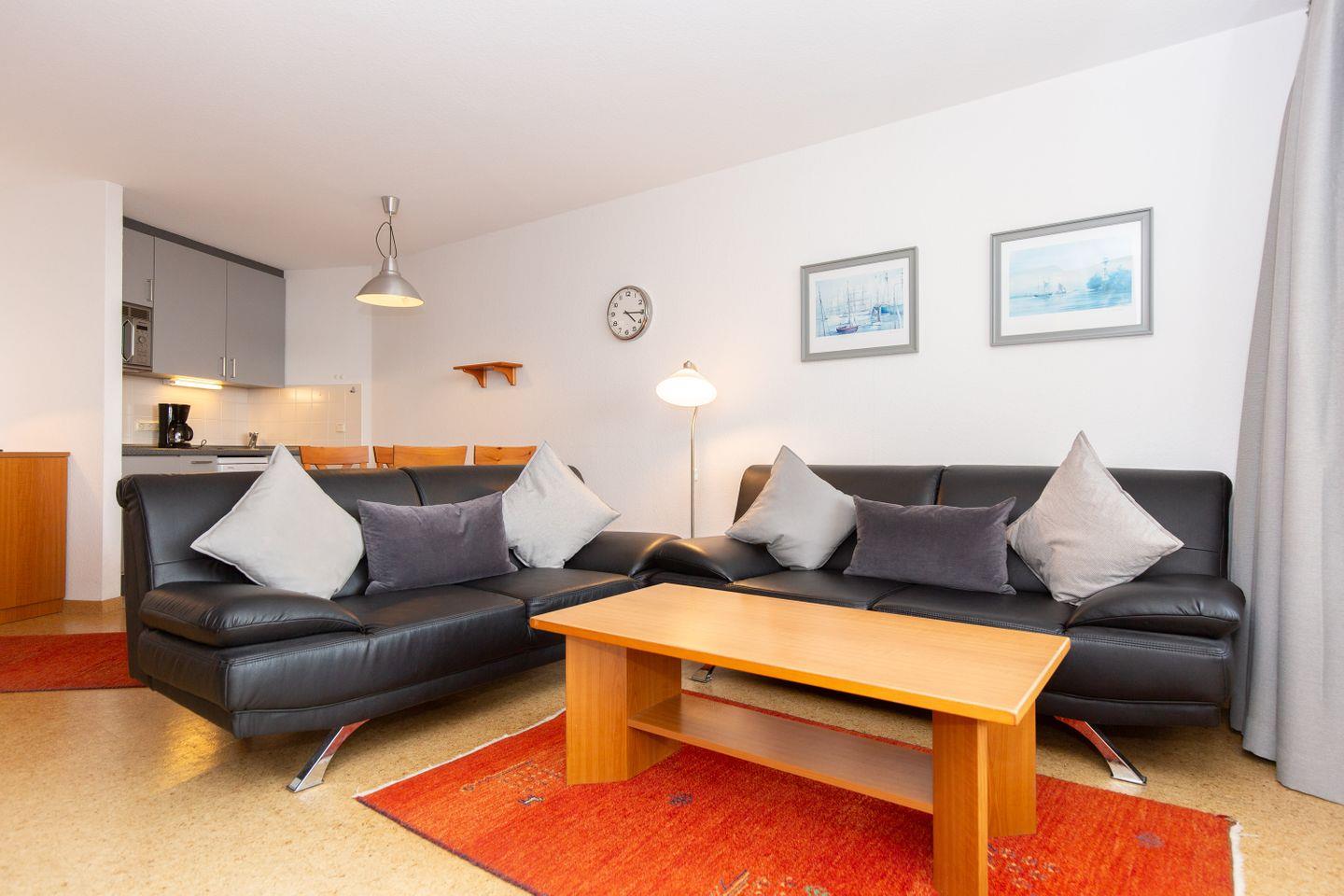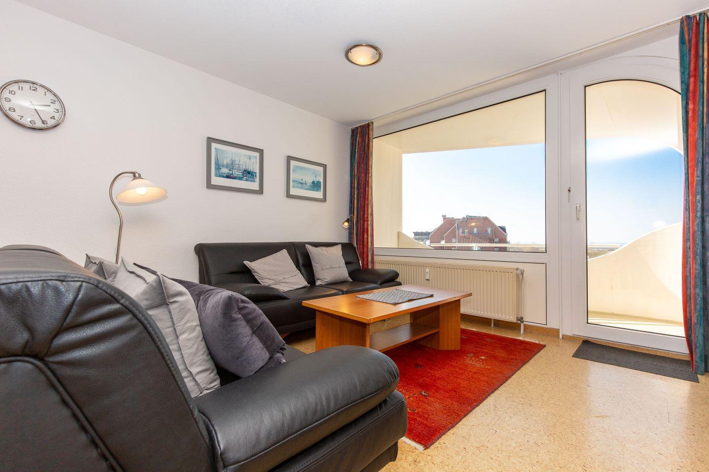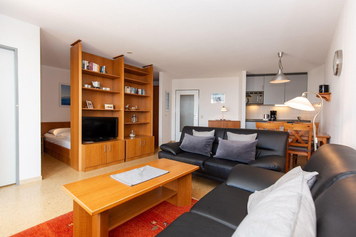 Haus "Trafalgar", Typ B, Appartement-Nr. 422, bis 4 Personen, 4. Etage, ca. 55 qm, Westseite (Meerblick), Wohn/Schlafraum mit Doppelbett (Raumteiler), sep. Schlafzimmer mit zwei Einzelbetten, Küchenzeile mit Ceranfeld, Geschirrspüler und Mikrowelle, Dusche/WC, Balkon, Kabel-TV, W-LAN im App., Radio, Nichtraucher, Haustiere sind nicht erlaubt, Tiefgaragenstellplatz, Strandkorb in den Sommermonaten 2026