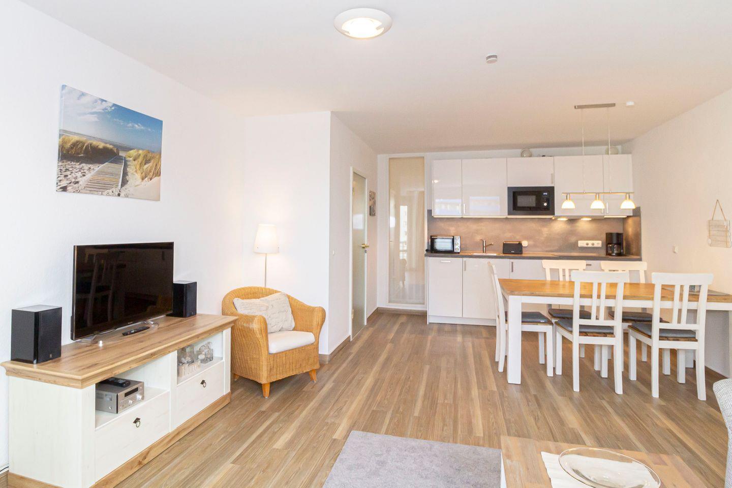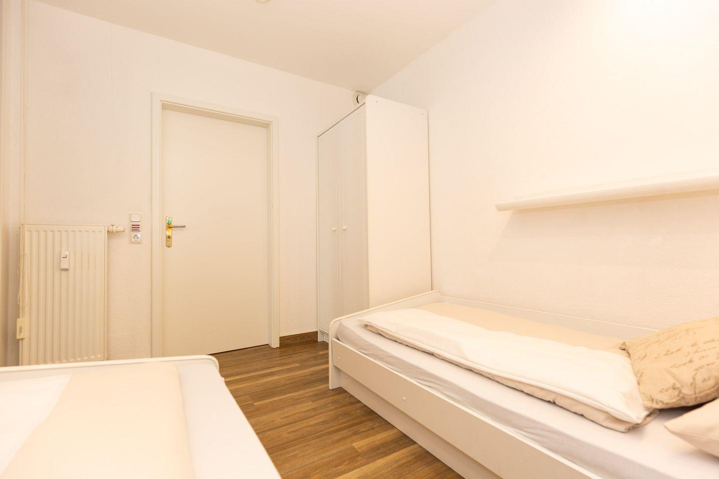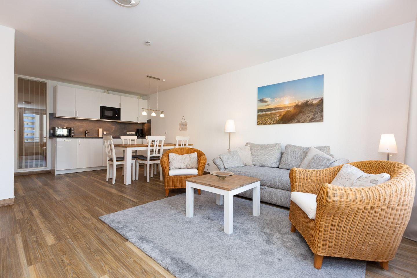 Haus "Kurpark-Residenz", Typ D2, App.-Nr. "235", bis 5 Pers., 2. OG, Südseite ("Parkseite"), ca. 69 m² Größe, Wohnzimmer mit Schlafcouch, sep. Schlafzimmer mit Doppelbett und TV Gerät, zweites sep. Schlafzimmer (innenliegend) mit Einzelbetten, Dusche/WC, Bidet, Küchenzeile mit Mikrowelle, Backofen und Geschirrspüler, Loggia, SAT-TV, Tiefgaragenstellplatz, Haustiere sind nicht gestattet, Strandkorb im Sommer 2025 von Mai bis September.
