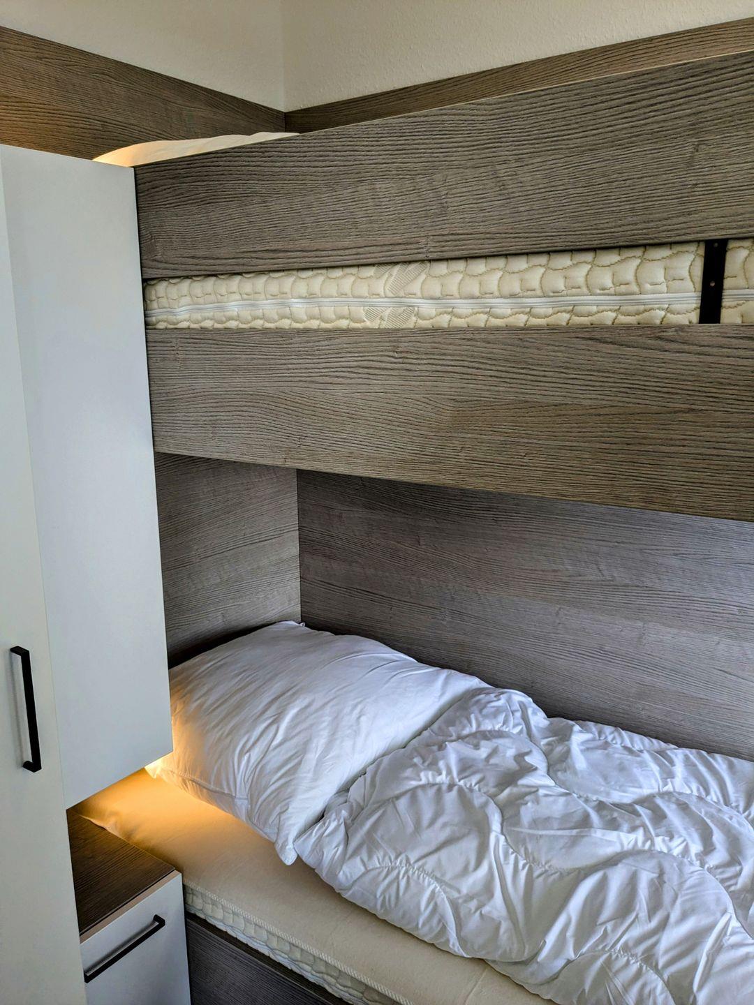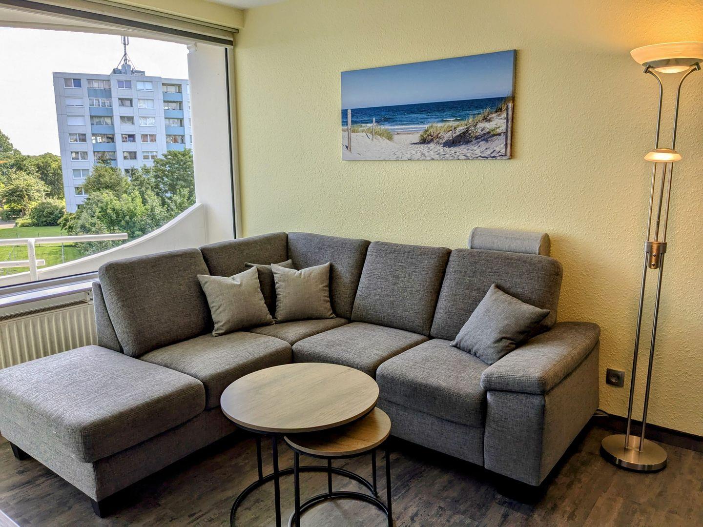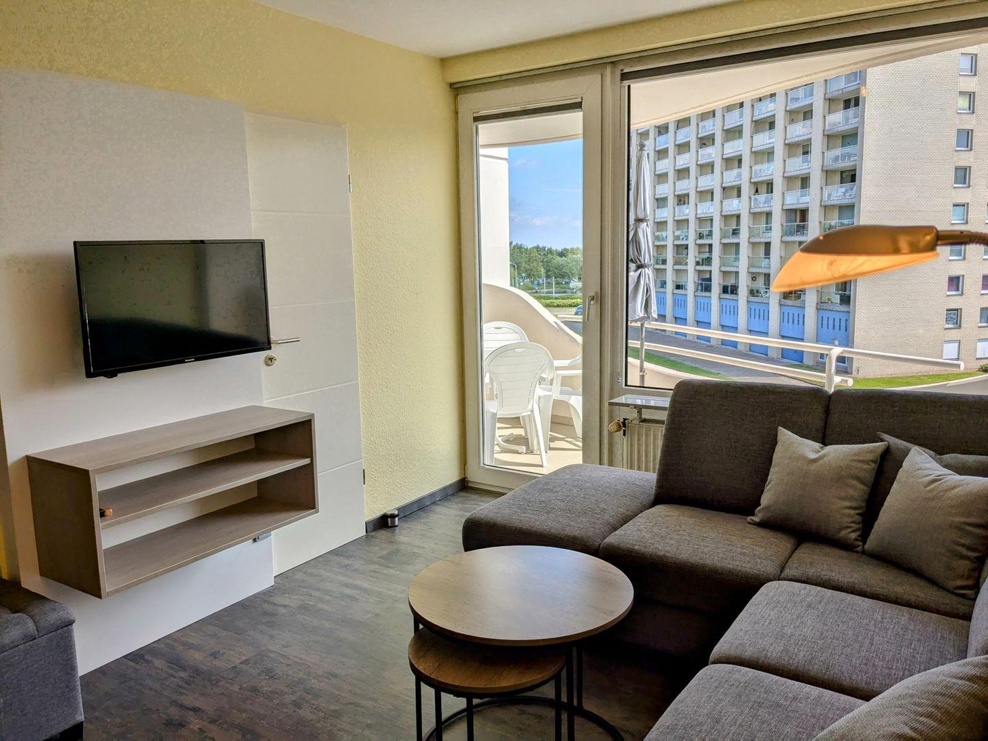 Haus "Lord Nelson", Typ 2, App.-Nr. "318", bis 4 Personen, 3. Etage, ca. 40 qm Größe, Weltschifffahrtsweg (eingeschränkter Meerblick in die Elbmündung), Wohnbereich mit feststehendem Doppelbett (1,80x2,00m), separates kleines Kinderzimmer mit Etagenbett, Dusche/WC, Küchenzeile mit Mikrowellen-Backofenkombination, Geschirrspüler, 4-Platten Induktionsfeld, Kabel-TV schwenkbar vom Sitzbereich/Sofa zum Bett, Internet-Radio, Außenstellplatz, Nichtraucherappartement, Haustiere nicht gestattet, kostenloser WLAN-Zugang im App., Strandkorb im Sommer 2026.