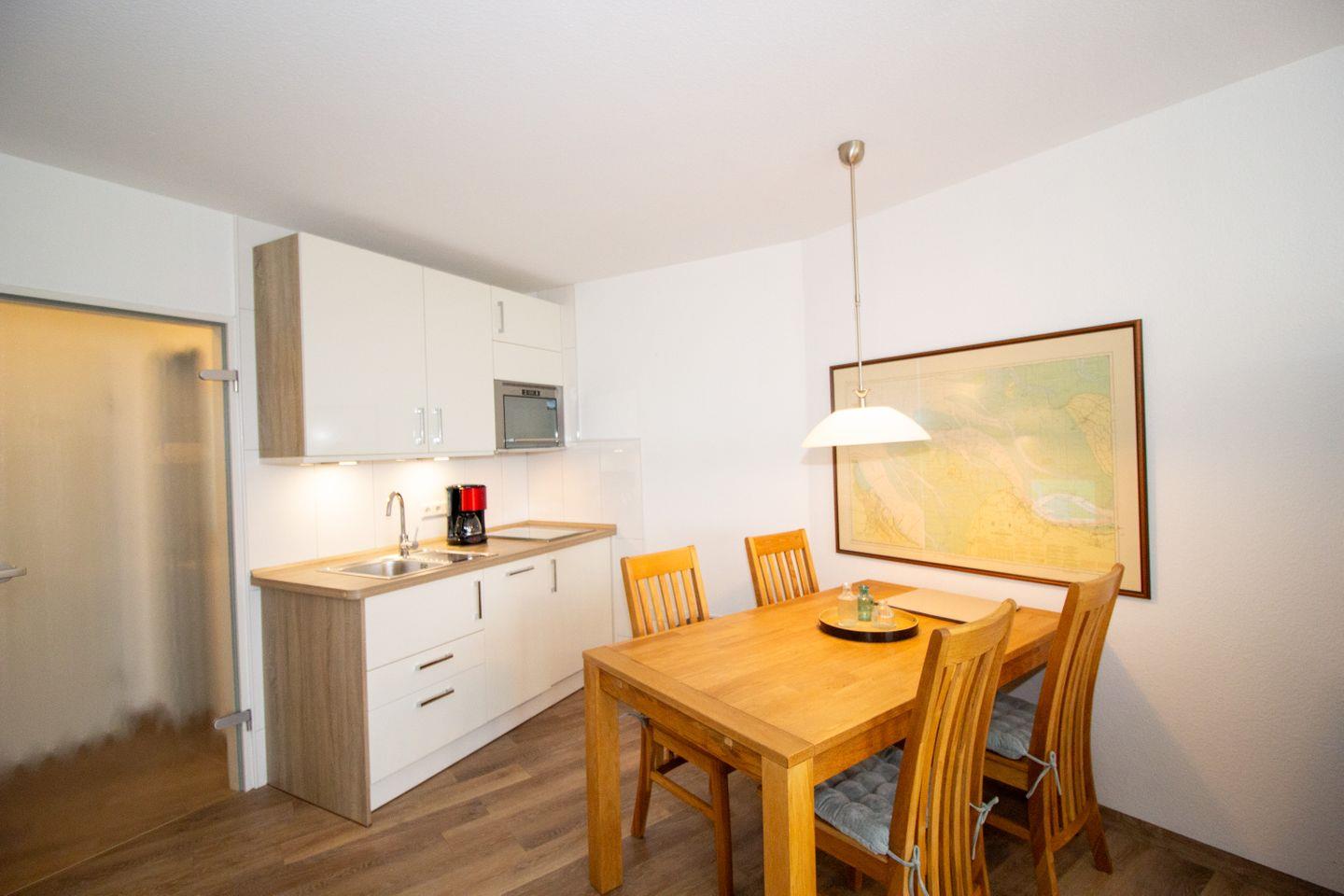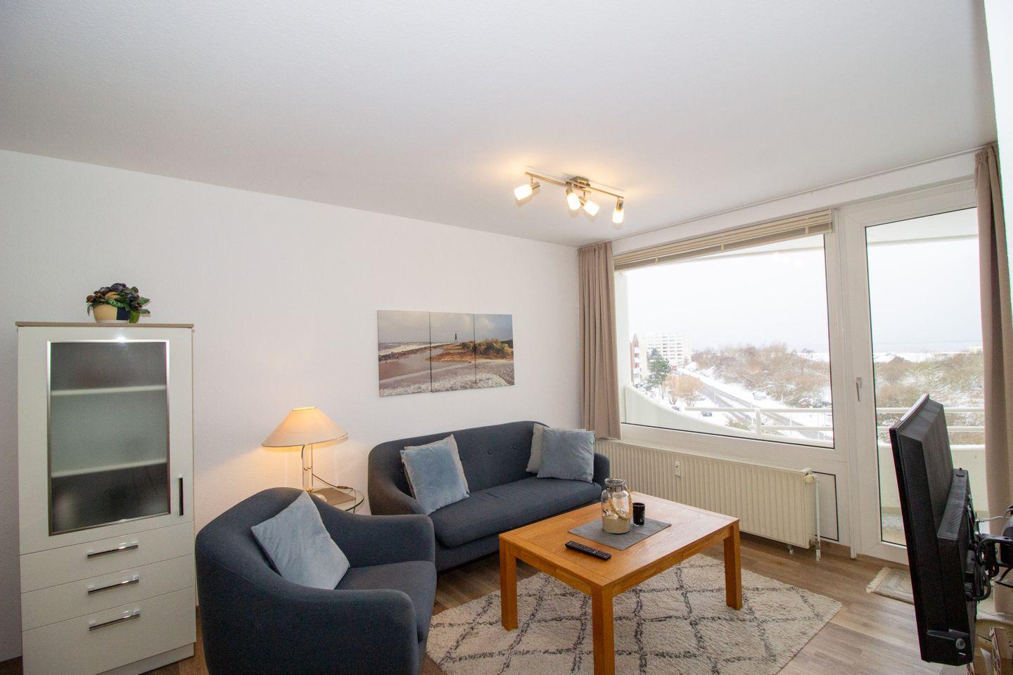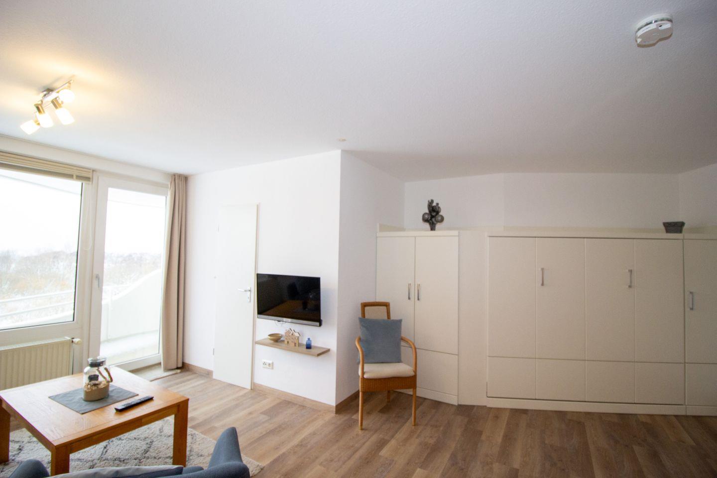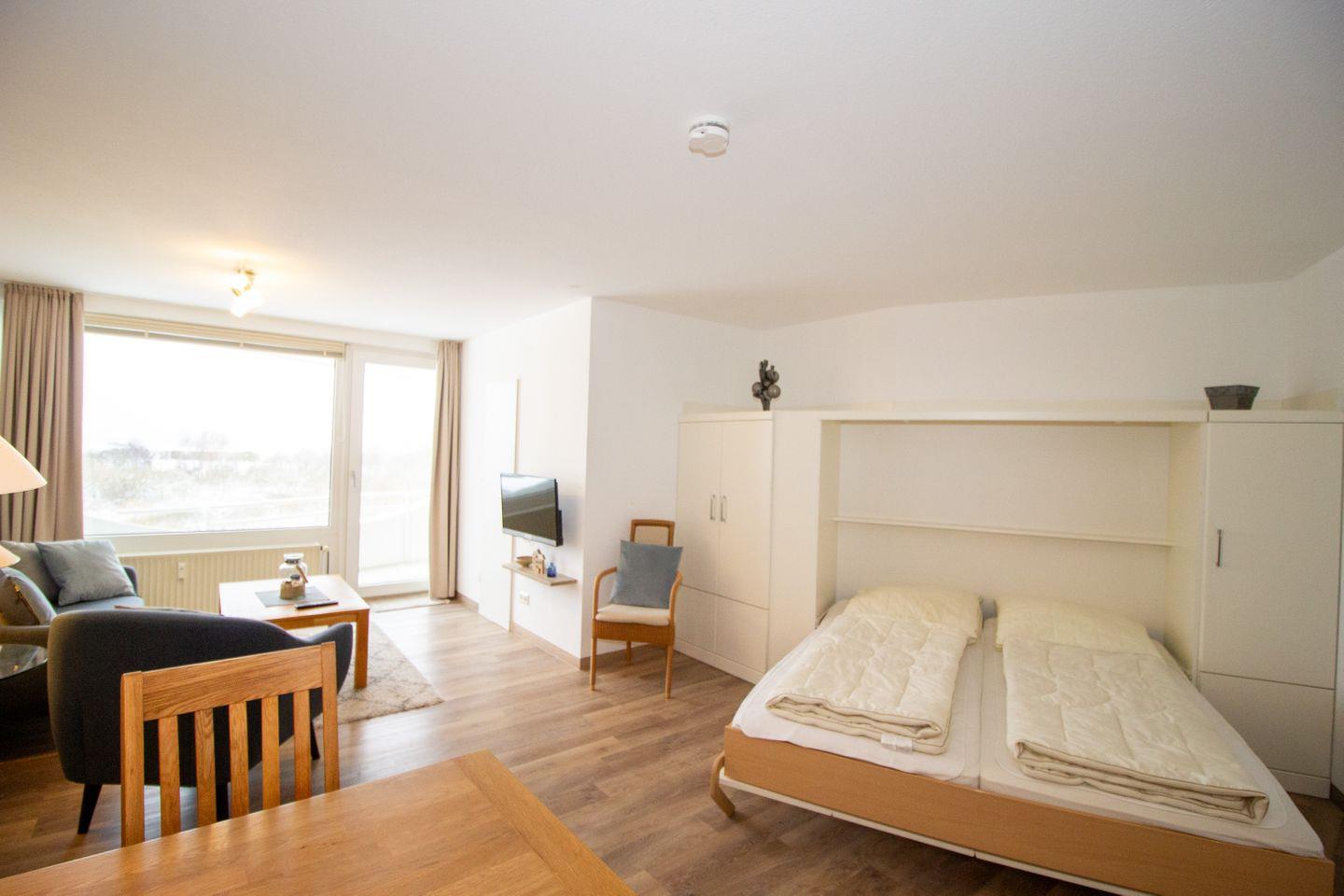 Haus "Lord Nelson", Typ 2, App.-Nr. 404, bis 3 Personen, 4. Etage, ca. 40 qm, Lage Richtung Weltnaturerbe Wattenmeer, Meerblick Richtung Neuwerk, Wohn/Schlafbereich mit Schrankbett, sep. Schlafzimmer mit Einzelbett, Dusche/WC, Küchenzeile mit 3-Platten Ceranfeld, Mikrowelle und Geschirrspüler, Balkon, Kabel-TV, Tiefgaragenstellplatz, Nichtraucherappartement, Haustiere sind auf Anfrage erlaubt, Strandkorb im Sommer 2026.