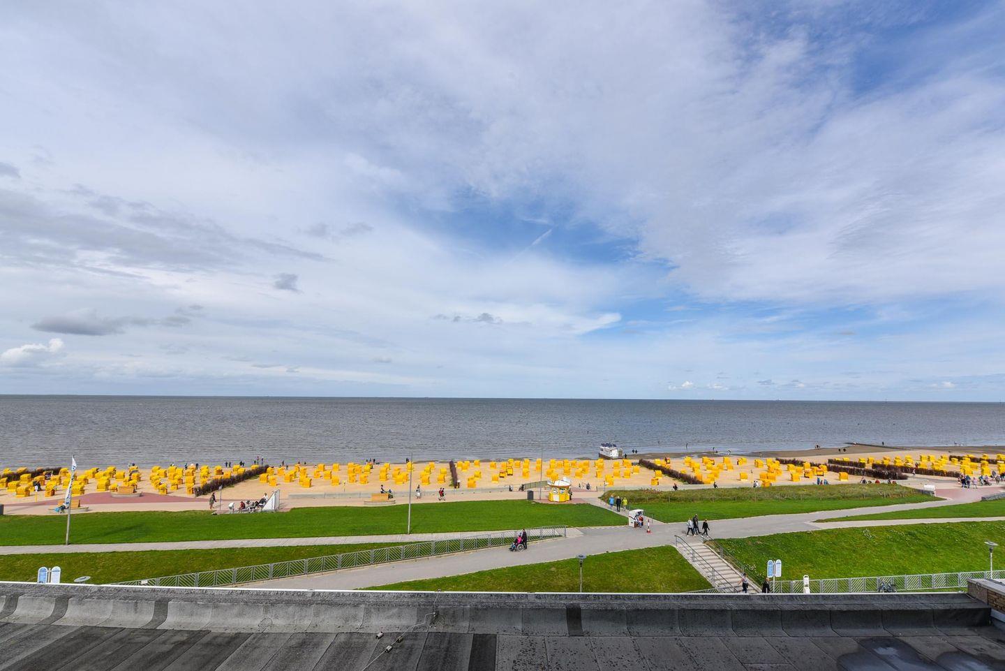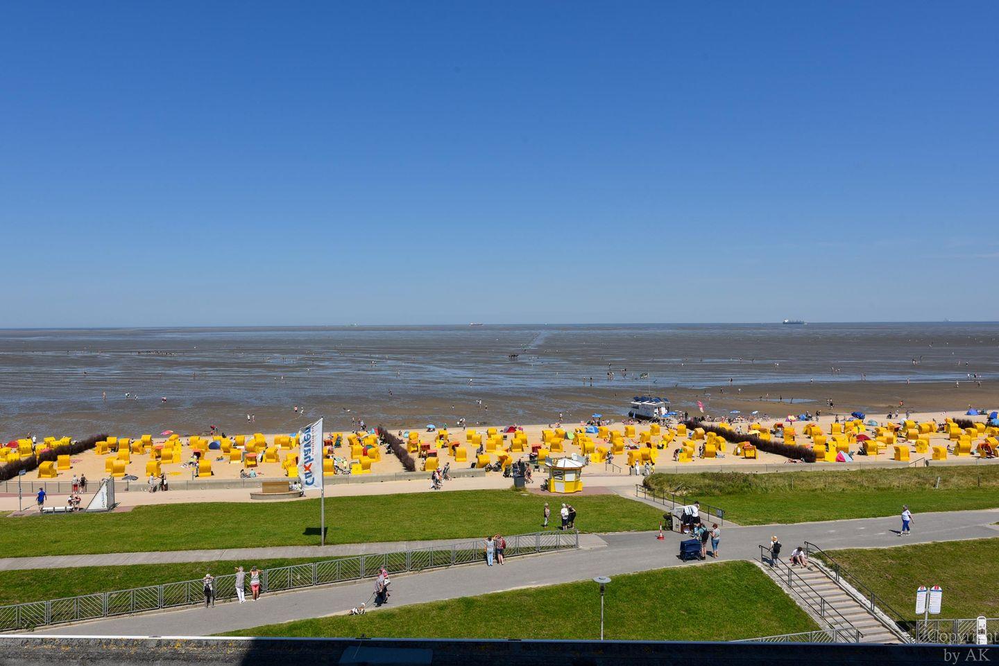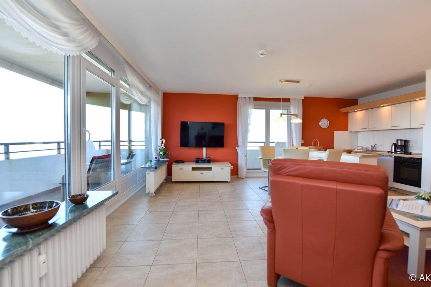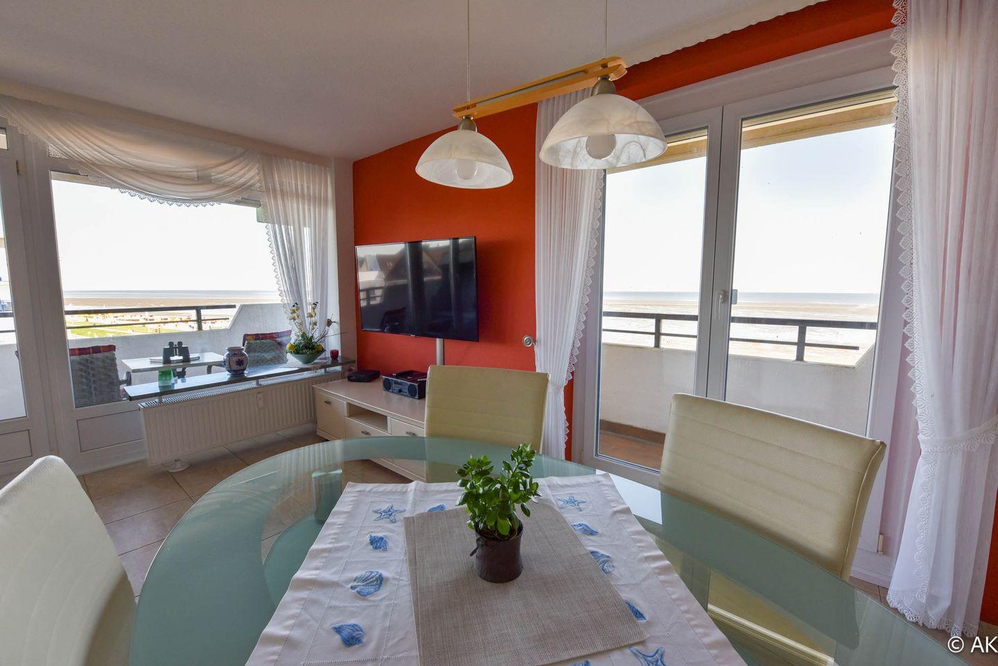 Genießen Sie einen unvergesslichen Urlaub in der erstklassigen Ferienwohnung Nr. 63 im Haus Panorama, die sich in der 4. Etage befindet und eine atemberaubende, direkte Aussicht auf die Nordsee bietet. Als Ihr ideales Zuhause fern von Zuhause setzt diese luxuriöse Einheit Maßstäbe in Sachen Komfort und Annehmlichkeiten. Entspannen Sie in dem geräumigen und stilvoll eingerichteten Wohn-/Esszimmer, das ideal für gemütliche Abende ist. Das komfortable Schlafzimmer bietet alles, was Sie für eine erholsame Nachtruhe benötigen. Kulinarische Genüsse kommen ebenfalls nicht zu kurz, denn die voll ausgestattete Küchenzeile verfügt über einen modernen E-Herd, einen großen Kühlschrank, eine Mikrowelle und einen Geschirrspüler. Für Ihre Unterhaltung steht ein Flachbildfernseher bereit,
