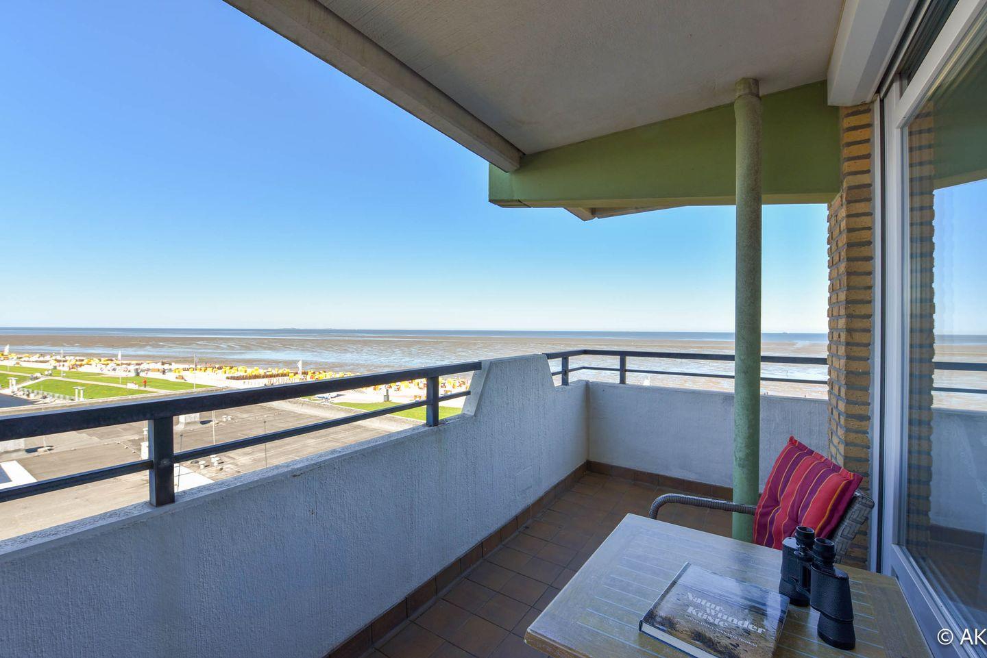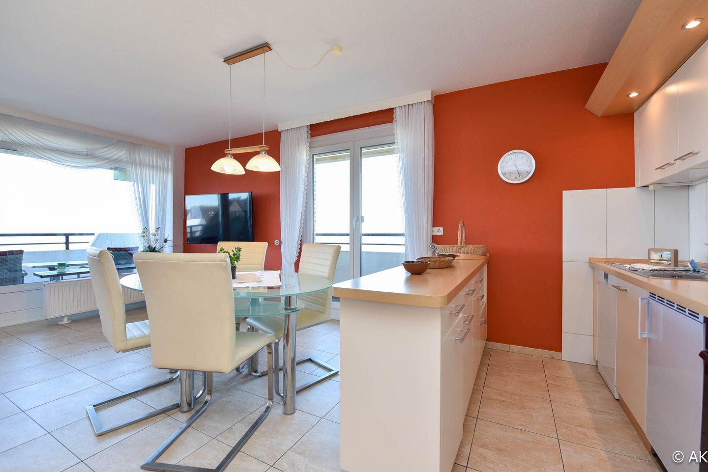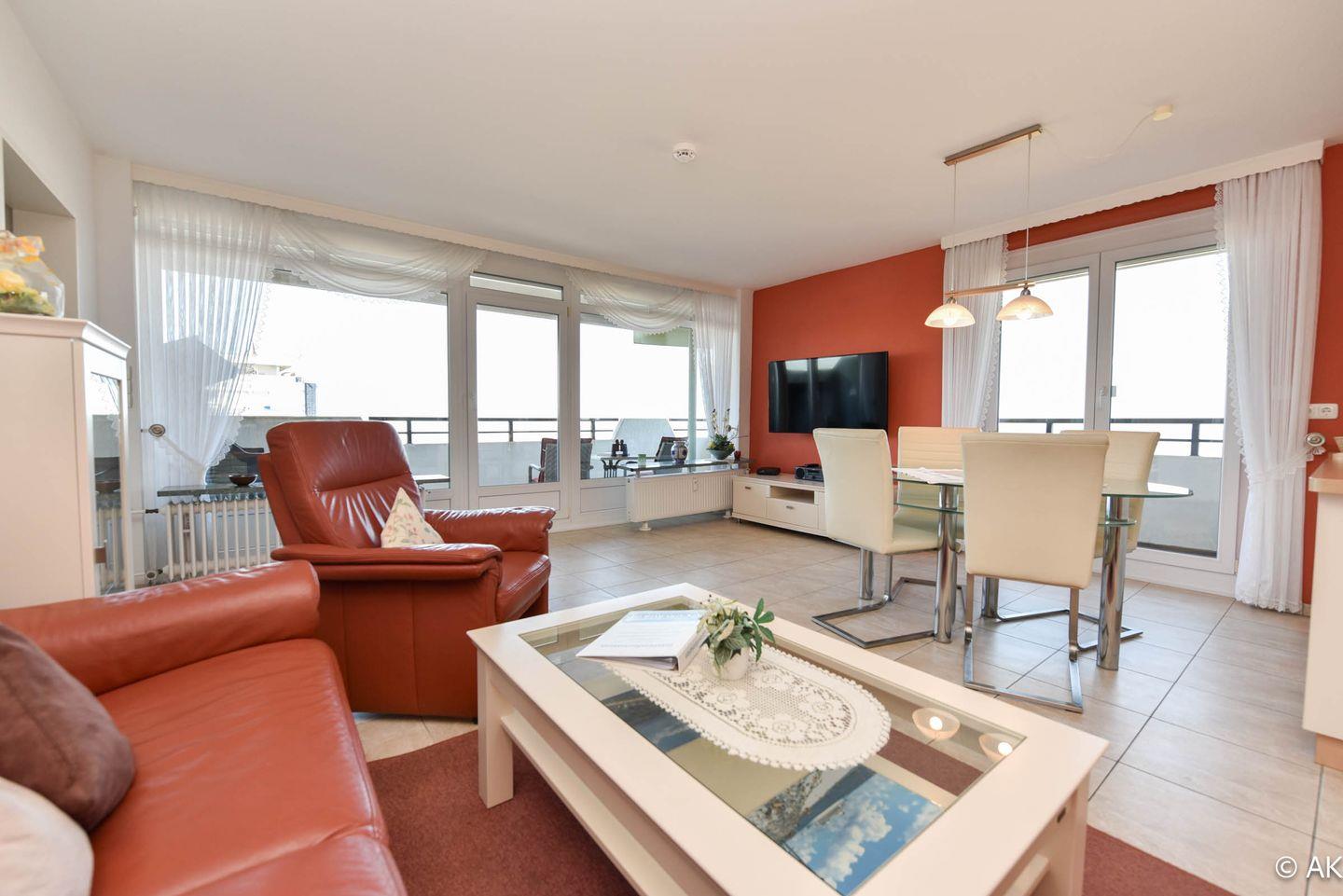 Genießen Sie einen unvergesslichen Urlaub in der erstklassigen Ferienwohnung Nr. 63 im Haus Panorama, die sich in der 4. Etage befindet und eine atemberaubende, direkte Aussicht auf die Nordsee bietet. Als Ihr ideales Zuhause fern von Zuhause setzt diese luxuriöse Einheit Maßstäbe in Sachen Komfort und Annehmlichkeiten. Entspannen Sie in dem geräumigen und stilvoll eingerichteten Wohn-/Esszimmer, das ideal für gemütliche Abende ist. Das komfortable Schlafzimmer bietet alles, was Sie für eine erholsame Nachtruhe benötigen. Kulinarische Genüsse kommen ebenfalls nicht zu kurz, denn die voll ausgestattete Küchenzeile verfügt über einen modernen E-Herd, einen großen Kühlschrank, eine Mikrowelle und einen Geschirrspüler. Für Ihre Unterhaltung steht ein Flachbildfernseher bereit,