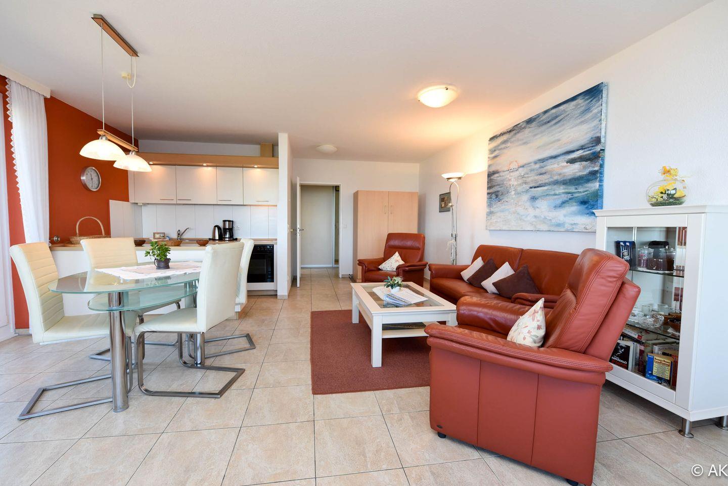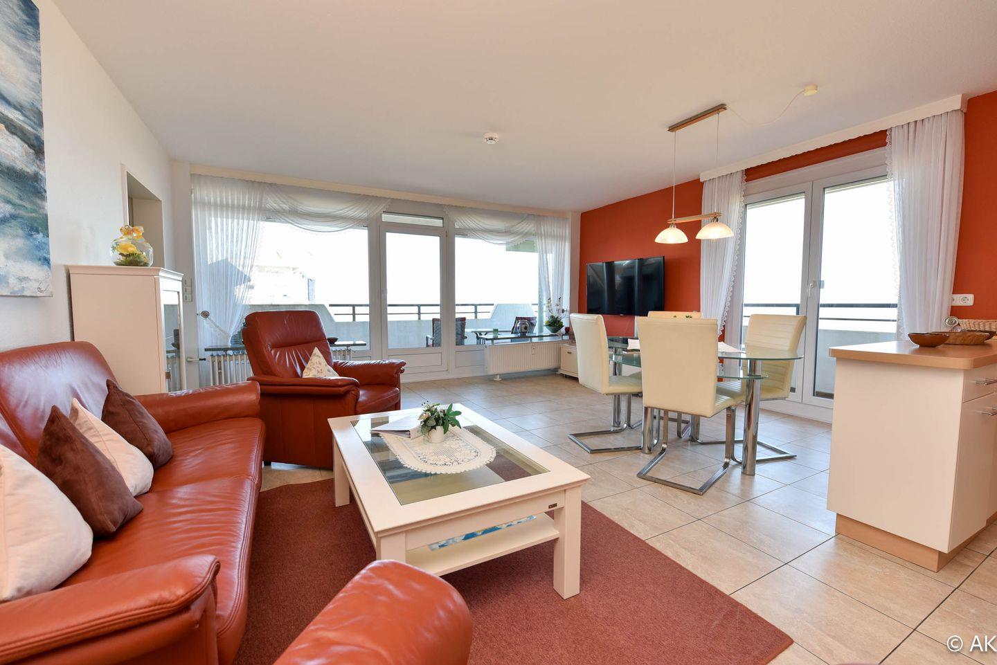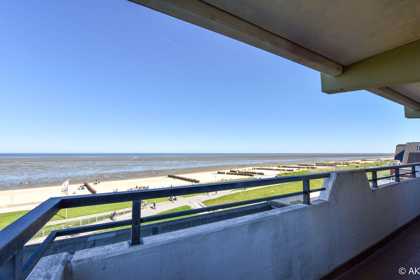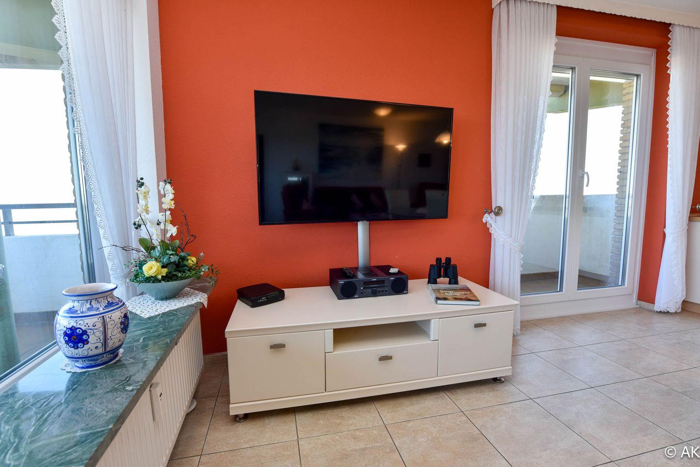Genießen Sie einen unvergesslichen Urlaub in der erstklassigen Ferienwohnung Nr. 63 im Haus Panorama, die sich in der 4. Etage befindet und eine atemberaubende, direkte Aussicht auf die Nordsee bietet. Als Ihr ideales Zuhause fern von Zuhause setzt diese luxuriöse Einheit Maßstäbe in Sachen Komfort und Annehmlichkeiten. Entspannen Sie in dem geräumigen und stilvoll eingerichteten Wohn-/Esszimmer, das ideal für gemütliche Abende ist. Das komfortable Schlafzimmer bietet alles, was Sie für eine erholsame Nachtruhe benötigen. Kulinarische Genüsse kommen ebenfalls nicht zu kurz, denn die voll ausgestattete Küchenzeile verfügt über einen modernen E-Herd, einen großen Kühlschrank, eine Mikrowelle und einen Geschirrspüler. Für Ihre Unterhaltung steht ein Flachbildfernseher bereit,