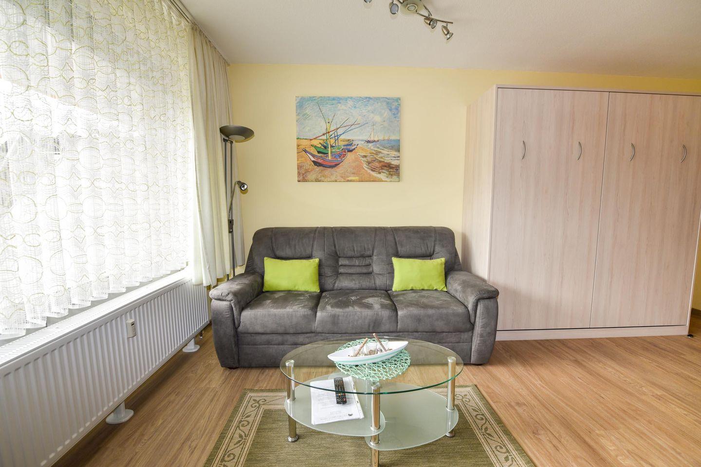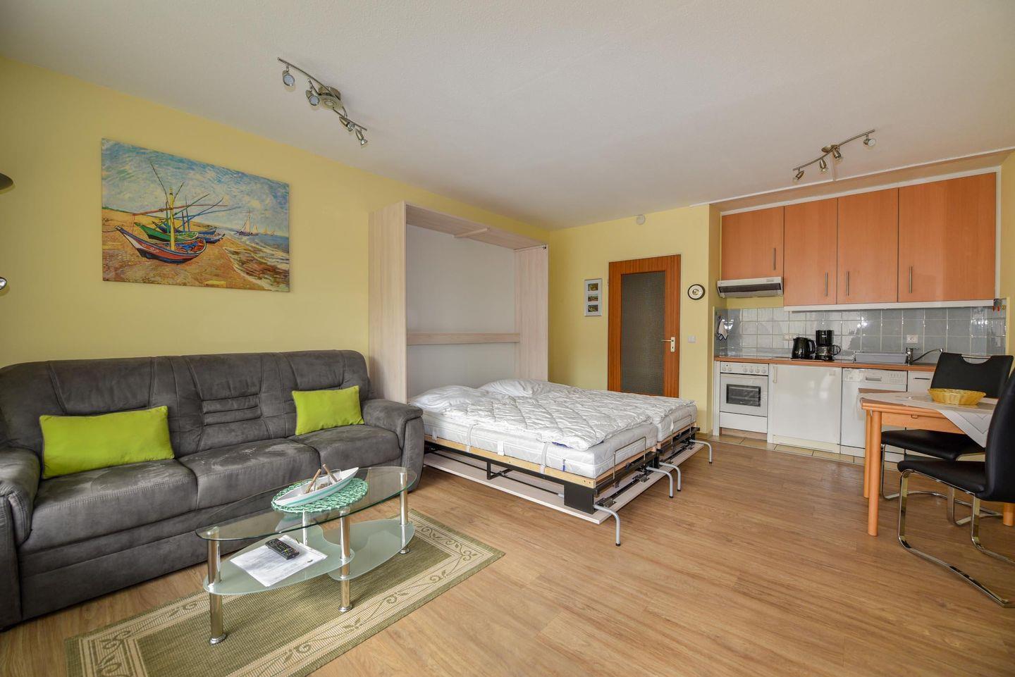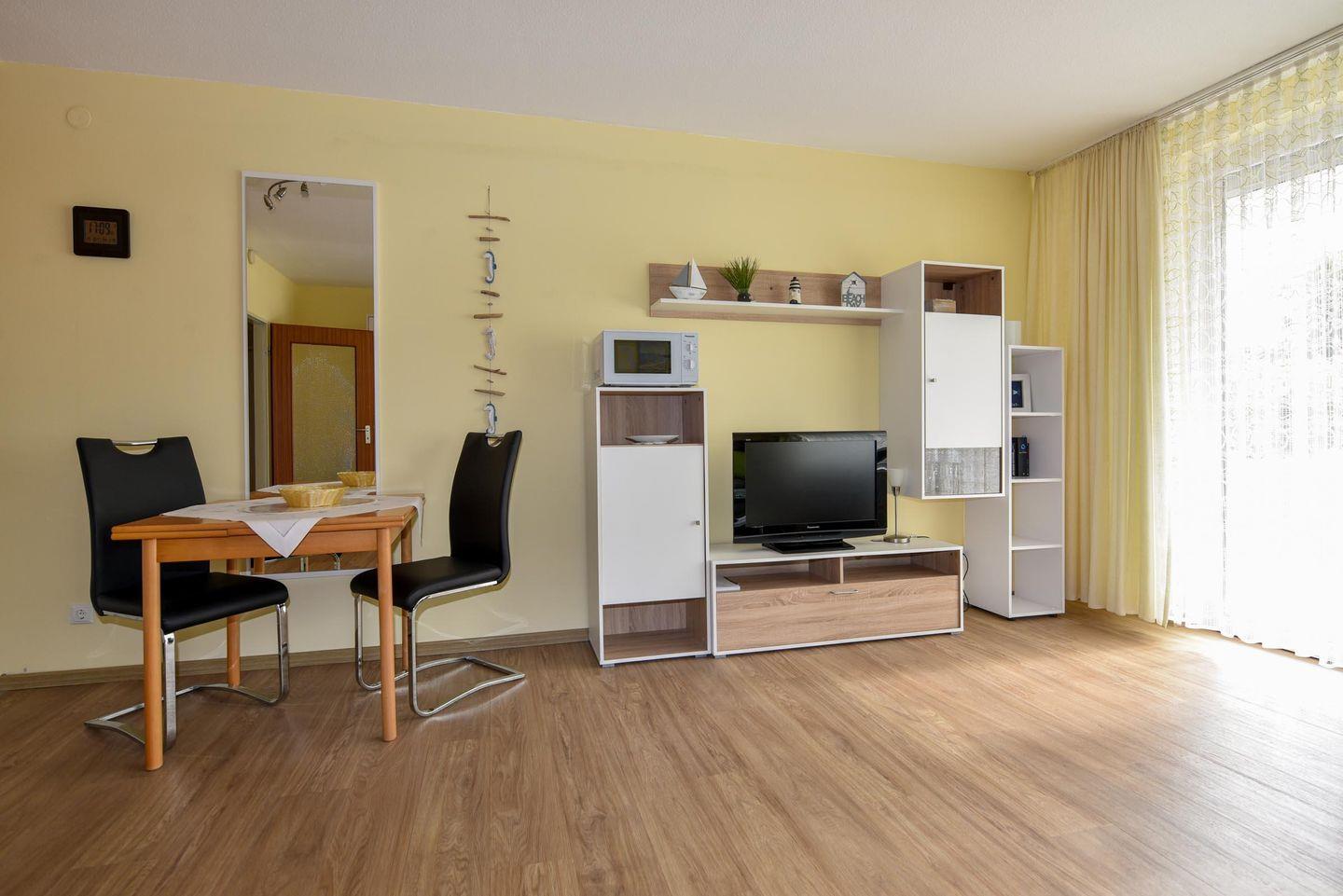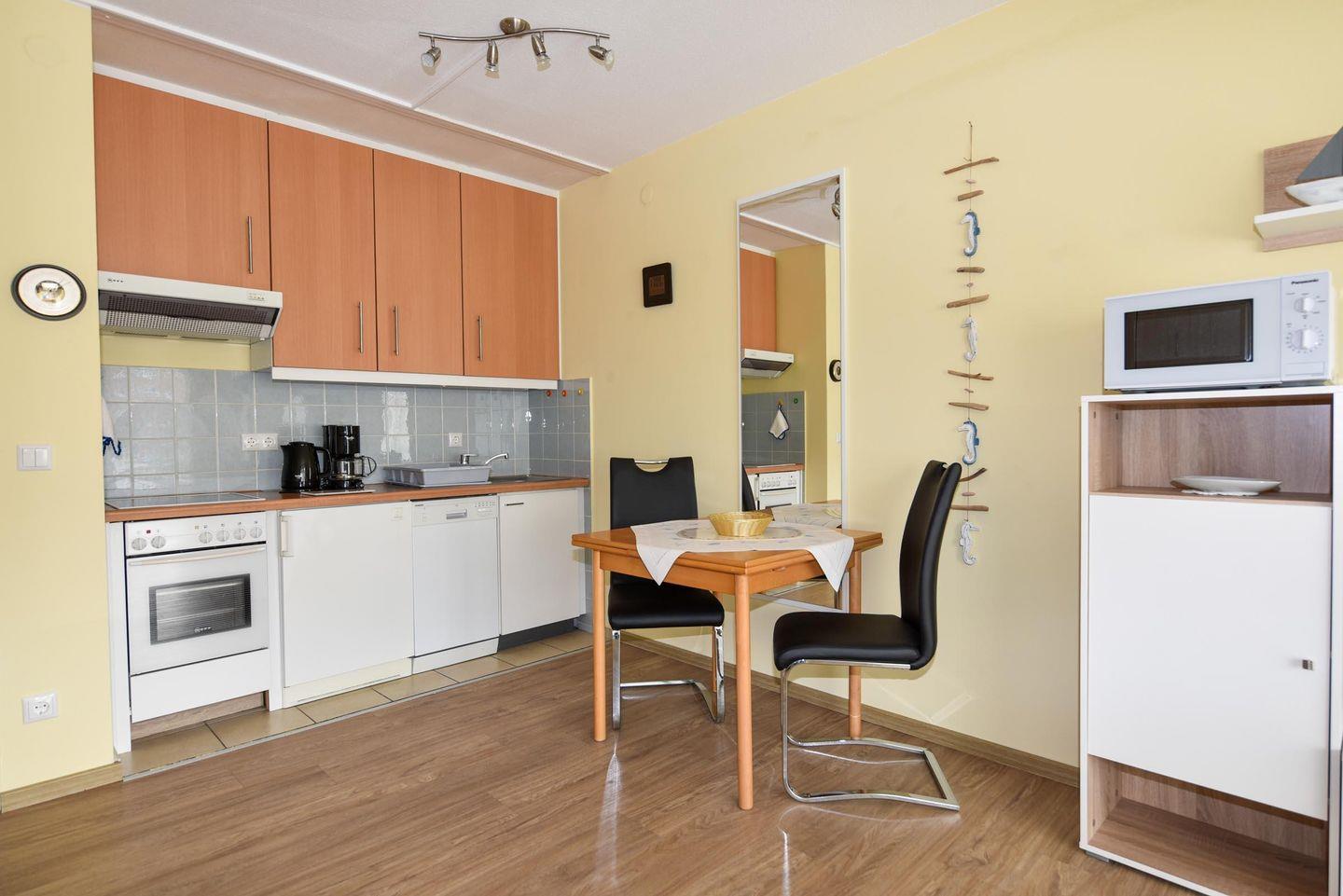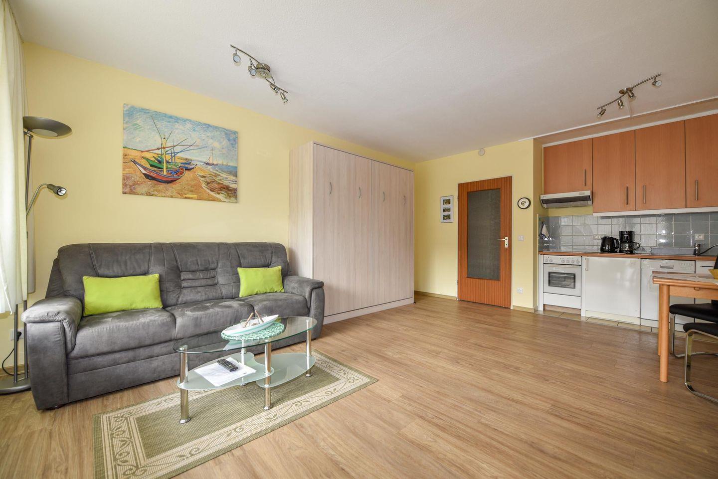Diese wunderschöne Ferienwohnung befindet sich im Hochparterre des Hauses Baltic, nur 50 Meter vom Strand entfernt. Die Wohnung ist aufgeteilt in einen Wohn-/Schlafraum mit Schrankklappbetten, einer Küchenzeile und einem Duschbad. Sie ist ausgestattet mit Kühlschrank, Spülmaschine, Mikrowelle, Kaffeemaschine, Wasserkocher, Elektroplatten und einem Flachbildfernseher. Selbstverständlich gibt es auch WLAN.