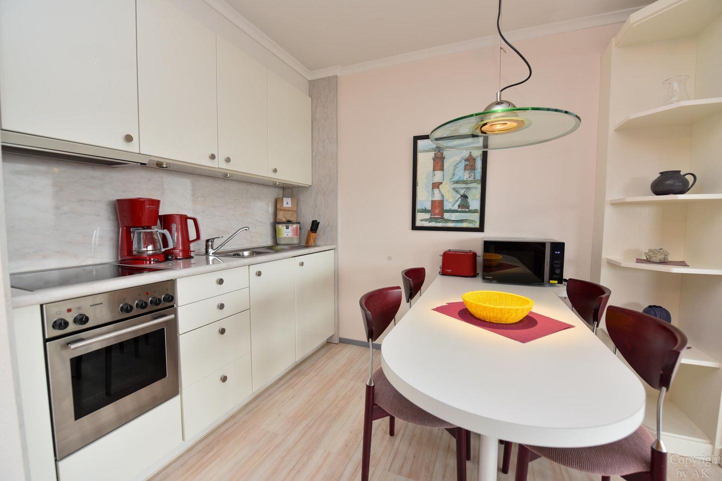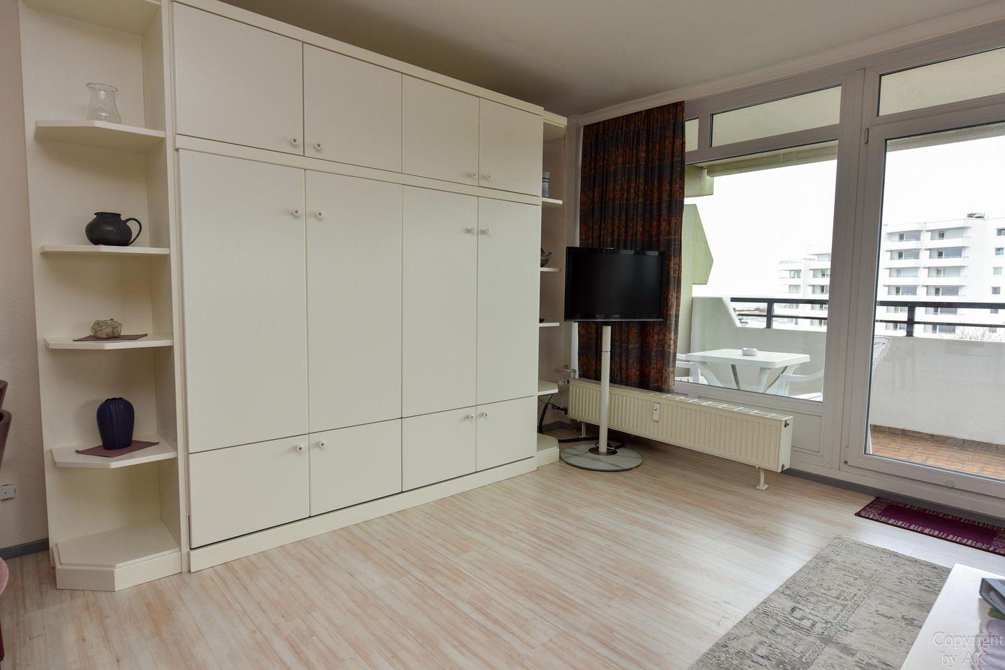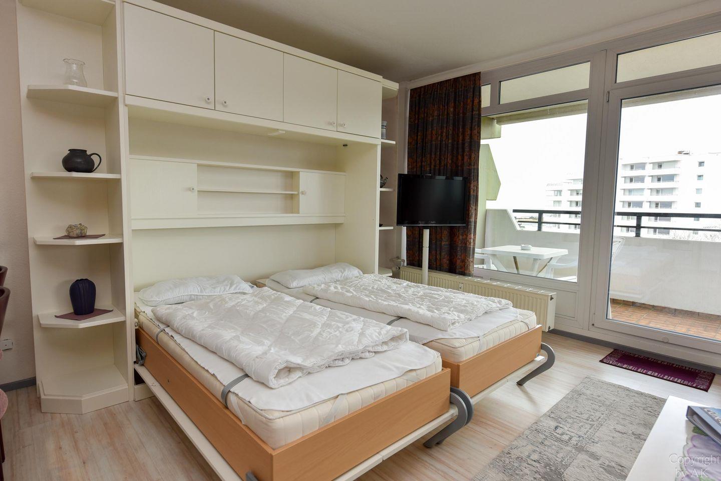Die Ferienwohnung verfügt über einen Wohn-/Schlafraum mit einem praktischen Schrankklappbett, das tagsüber Platz schafft und nachts für erholsamen Schlaf sorgt. Die Küchenzeile ist mit einem Kühlschrank, E-Herd, Mikrowelle und einer Kaffeemaschine ausgestattet, sodass sich Gäste bequem selbst versorgen können. Ein Flachbildfernseher sorgt für Unterhaltung, während das Badezimmer mit Dusche und WC für Komfort während des Aufenthalts bietet.