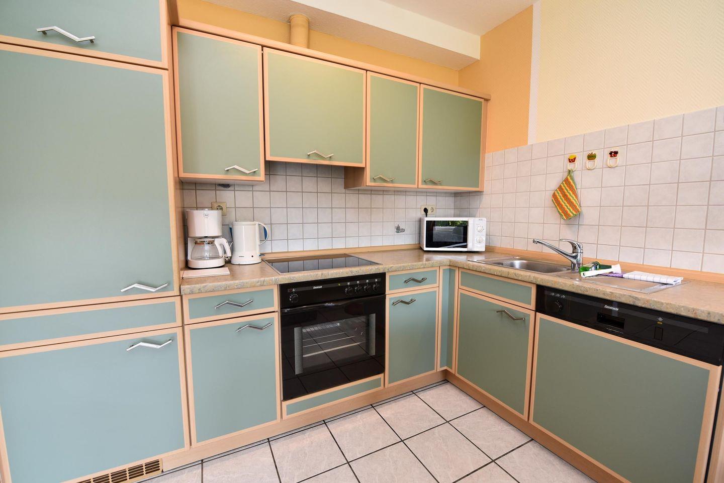 Das helle und geflieste Apartment verfügt über einen gemütlichen Wohnbereich mit Sofa, Flachbild-TV und Zugang zu einer sonnigen Südterrasse. Der Schlafbereich ist mit einem bequemen Doppelbett ausgestattet, das erholsame Nächte garantiert. In der voll ausgestatteten Küchenzeile finden Sie alles, was Sie zur Zubereitung eigener Mahlzeiten benötigen, einschließlich Herd, Backofen, Kühlschrank, Geschirrspüler und Kaffeemaschine. Das helle Badezimmer bietet eine Dusche, Waschbecken und WC.