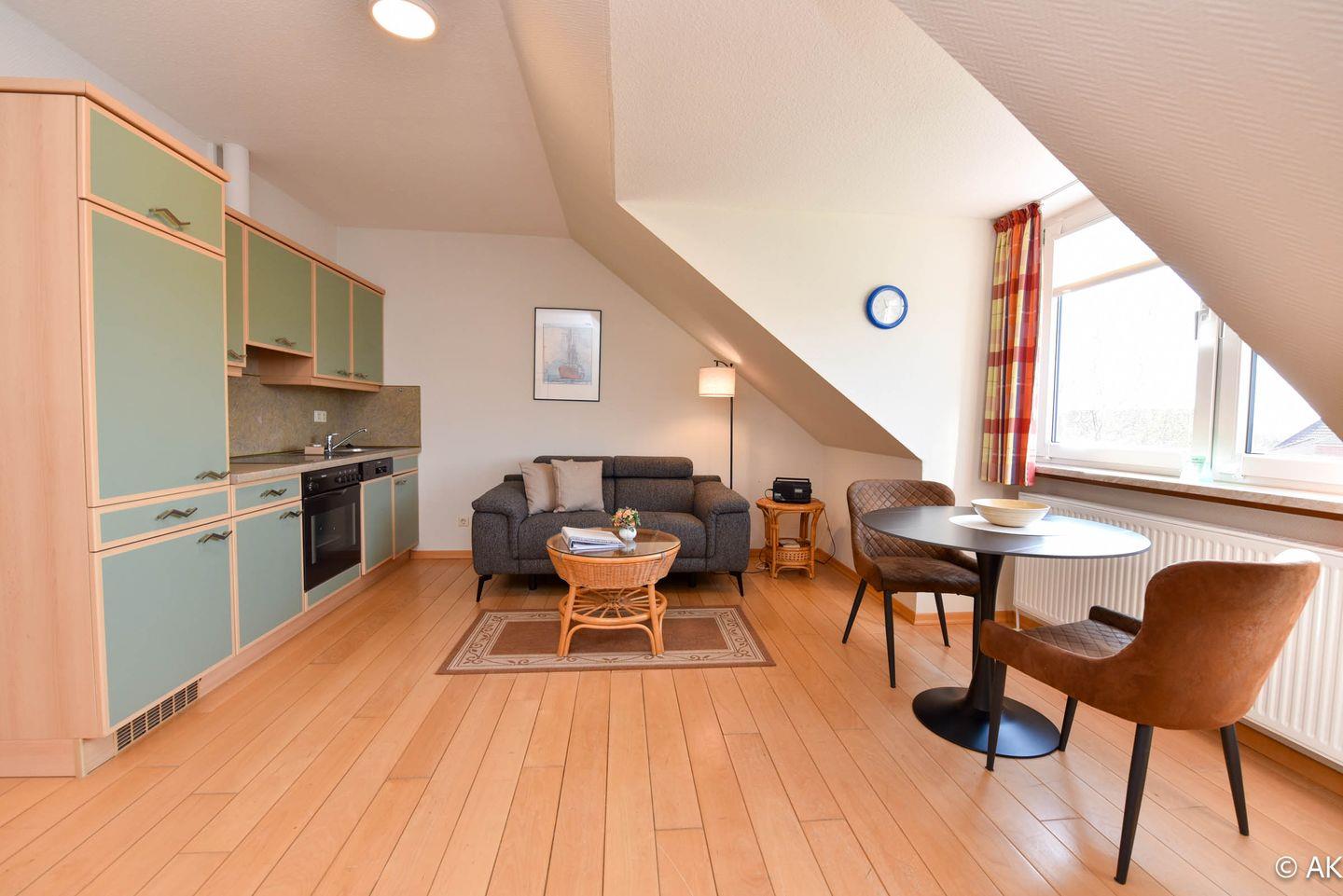 Das gemütliche Nichtraucher-Dachgeschoss-Appartement SEE209 im Haus Seeland 2 umfasst ein Schlafzimmer, ein Wohnzimmer mit integrierter und voll ausgestatteter Küche sowie ein Badezimmer. Aufgrund seiner ruhigen Lage in der Nähe des Zentrums von Duhnen eignet sich diese Ferienwohnung hervorragend für einen entspannenden Aufenthalt. Haustiere sind nicht erlaubt, was es besonders für Allergiker geeignet macht.