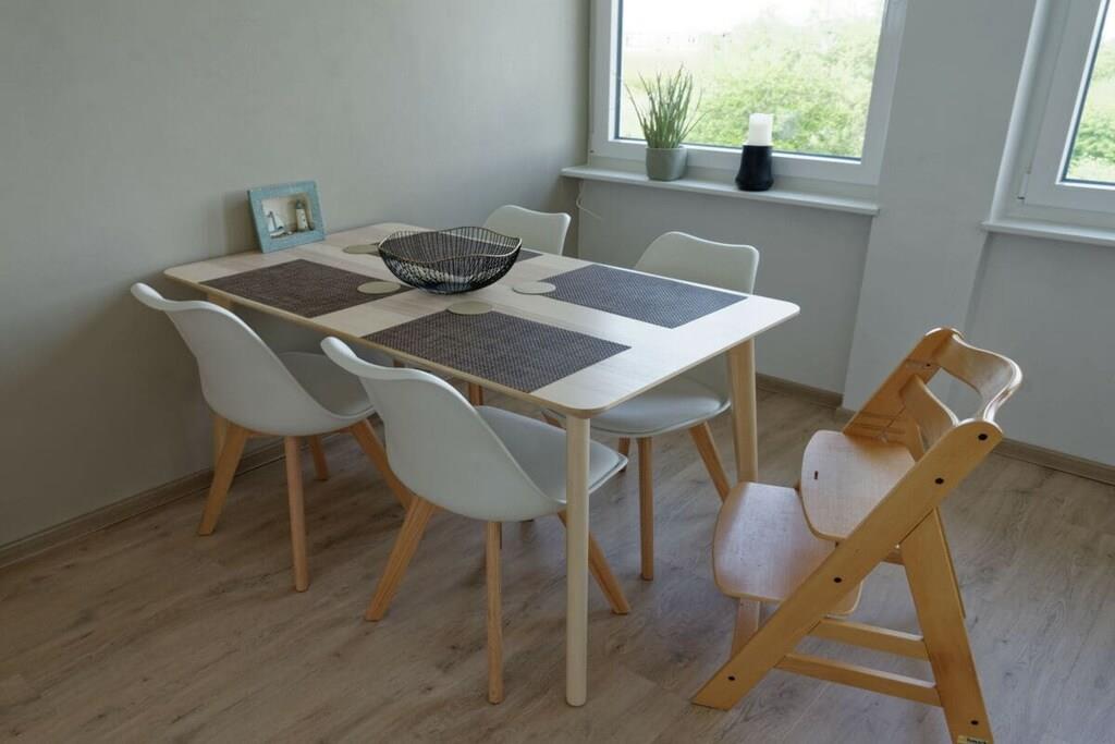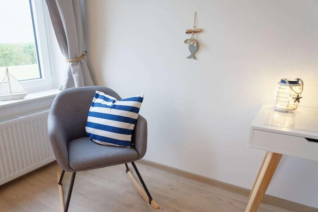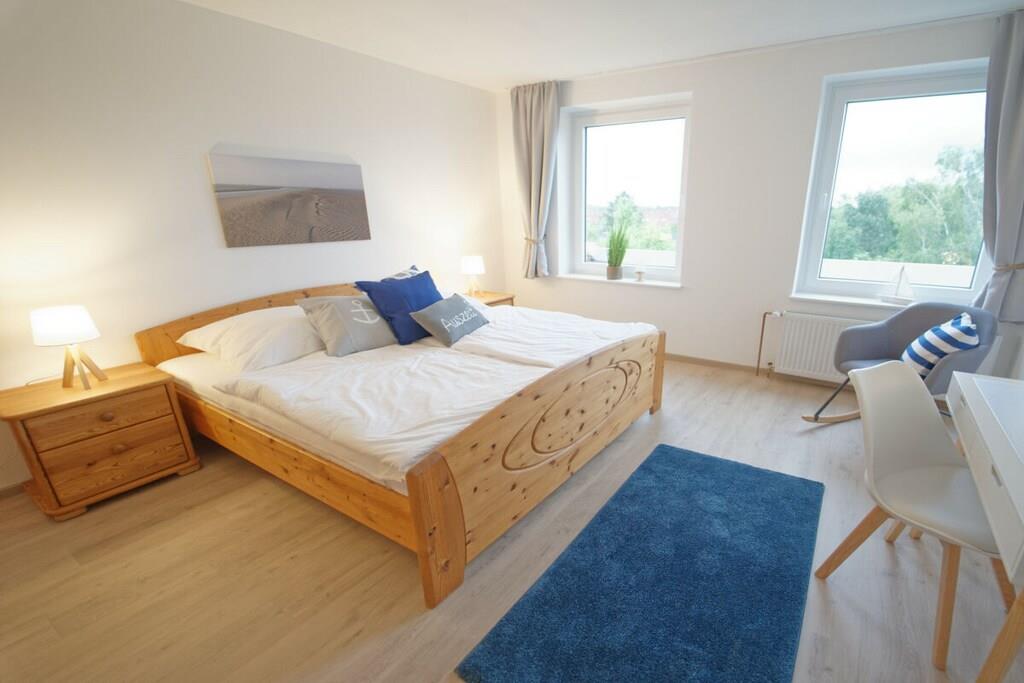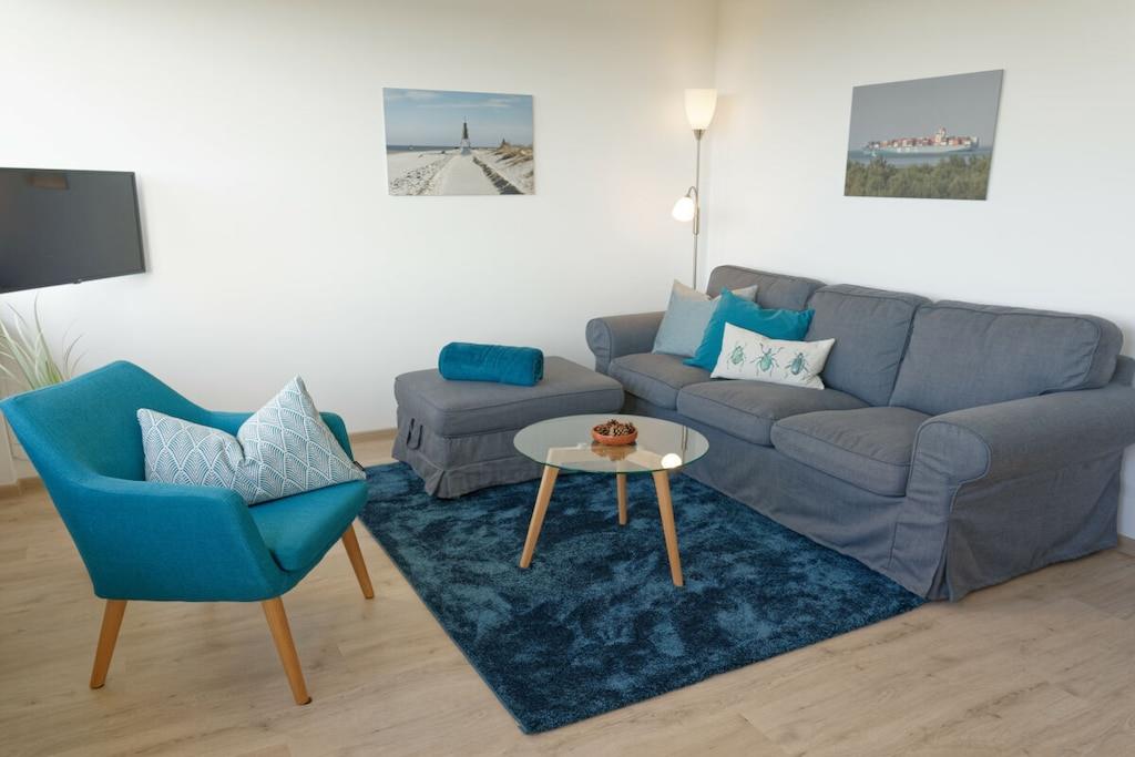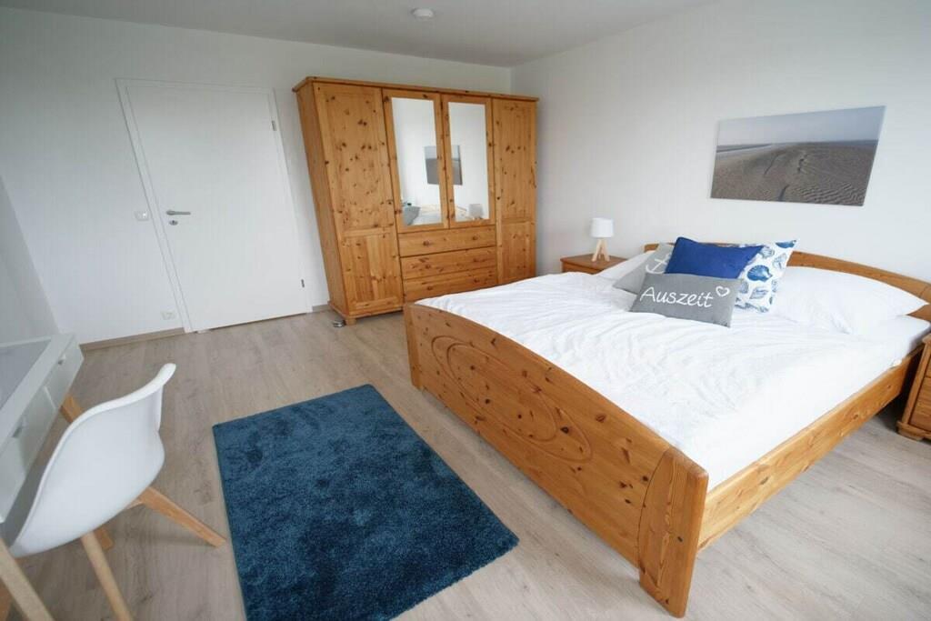 Nyd en afslappende ferie i vores kærligt møblerede lejlighed med enestående havudsigt. Vores lyse ferielejlighed (81 m², 3. sal) i moderne landlig stil ligger lige bag diget (200 m til stranden) og tilbyder masser af plads til 4 personer og en baby/tumling. Der er en barneseng og en højstol til rådighed. Lejligheden har to rummelige soveværelser, hver med en dobbeltseng, samt en stue og spisestue med panoramaudsigt over Nordsøen og den internationale sejlrute. Badeværelset med bruser/toilet har også en vaskemaskine. Det moderne og fuldt udstyrede køkken tilbyder al komfort, herunder keramisk kogeplade, ovn, mikrobølgeovn, opvaskemaskine og køleskab med frostboks. Den solrige sydvendte balkon har en vidunderlig udsigt over det omkringliggende grønt. Gratis Wi-Fi. To LG Smart TV'er giver dig mulighed for at se dine yndlingsprogrammer med din Netflix- eller Amazon-konto (osv.). Der er gratis parkering lige foran bygningen. Udlejningskontoret ligger i bygningen. Bemærk venligst, at der ikke er elevator.