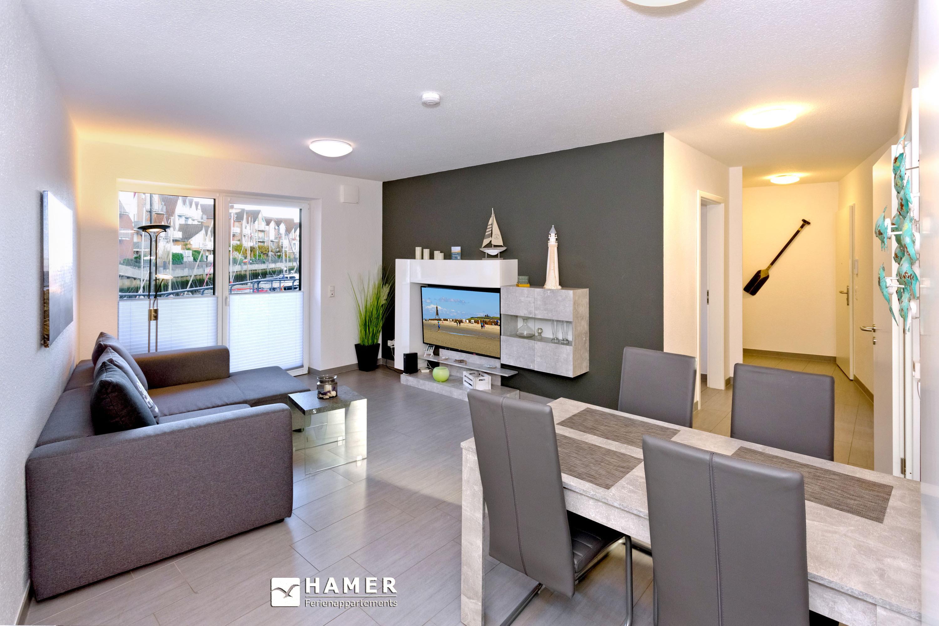 Schöne 2-Raum-Wohnung für 2 Pers. in der City Marina im Erdgeschoss mit großer Terrasse direkt am Hafenbecken. Voll ausgestattete Küchenzeile mit Backofen, Geschirrspüler etc.. Wohn- Esszimmer mit TV, Schlafzimmer mit Doppelbett, TV und elektr.. Rollläden, Badezimmer mit ebenerdige Dusche/WC. Waschmaschine i.d. Wohnung, kostenloses W-Lan, Stellplatz #1 und großer separater Abstellraum mit E-Bike Lademöglichkeit, keine Haustiere und natürlich Nichtraucher.