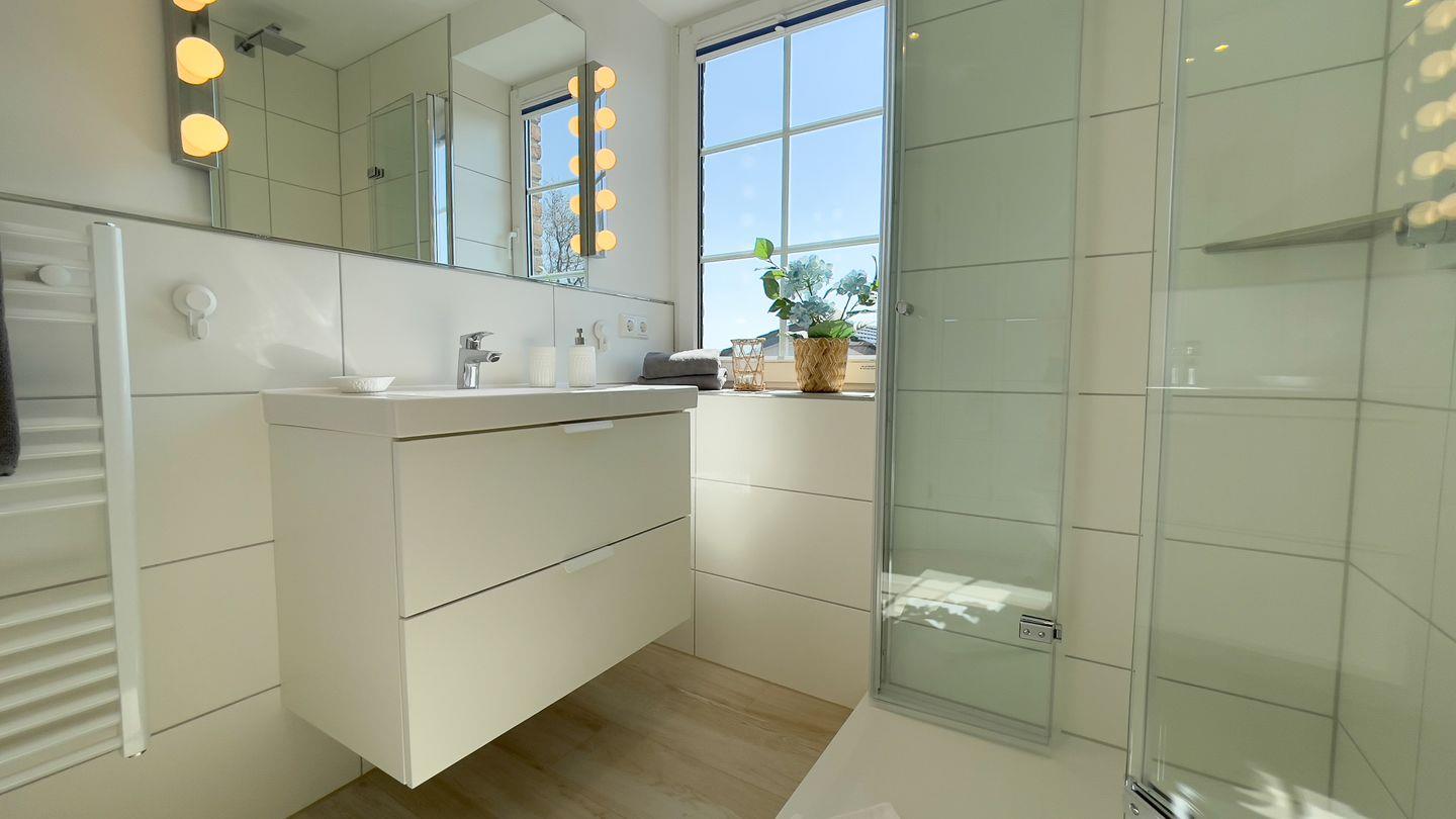 Die Ferienwohnung hat eine Fläche von 40 m² und ist ausgestattet für bis zu vier Personen. Sie liegt im ersten Stock eines freistehenden Hauses und ist hell und freundlich gestaltet. Im gemütlichen Schlafzimmer mit einem komfortablen Doppelbett und auf dem ausziehbaren Sofa im Wohnbereich finden Sie Ruhe für Ihren erholsamen Schlaf. Zu Ihrem Wohlbefinden trägt auch das moderne Tageslichtbadezimmer mit einer bodengleichen Dusche bei.