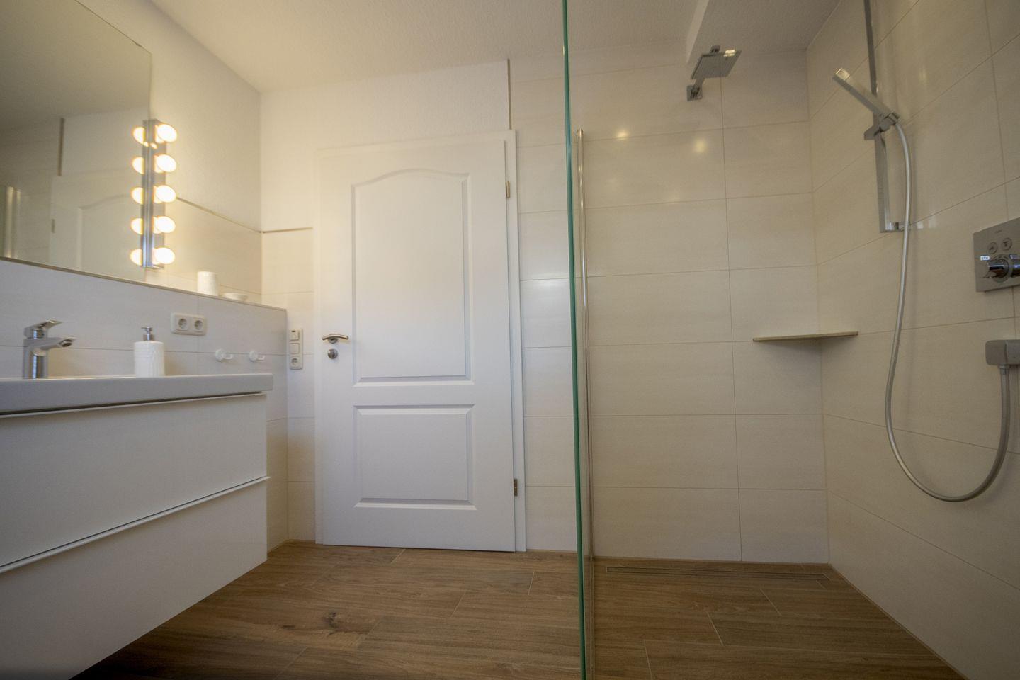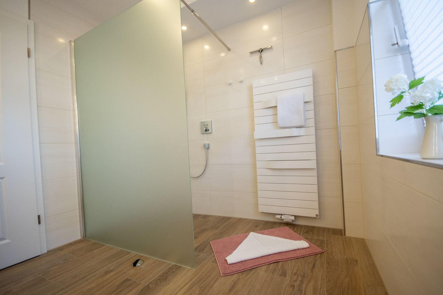Das moderne Badezimmer ist behindertenfreundlich mit ebenerdiger, großer Walk-In-Dusche.