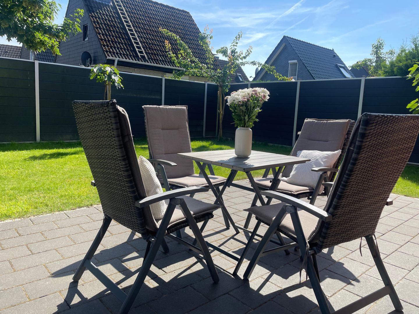 Zur Wohnung gehört eine eigene Terrasse mit Gartenmöbeln sowie ein Garten (eingezäunt).