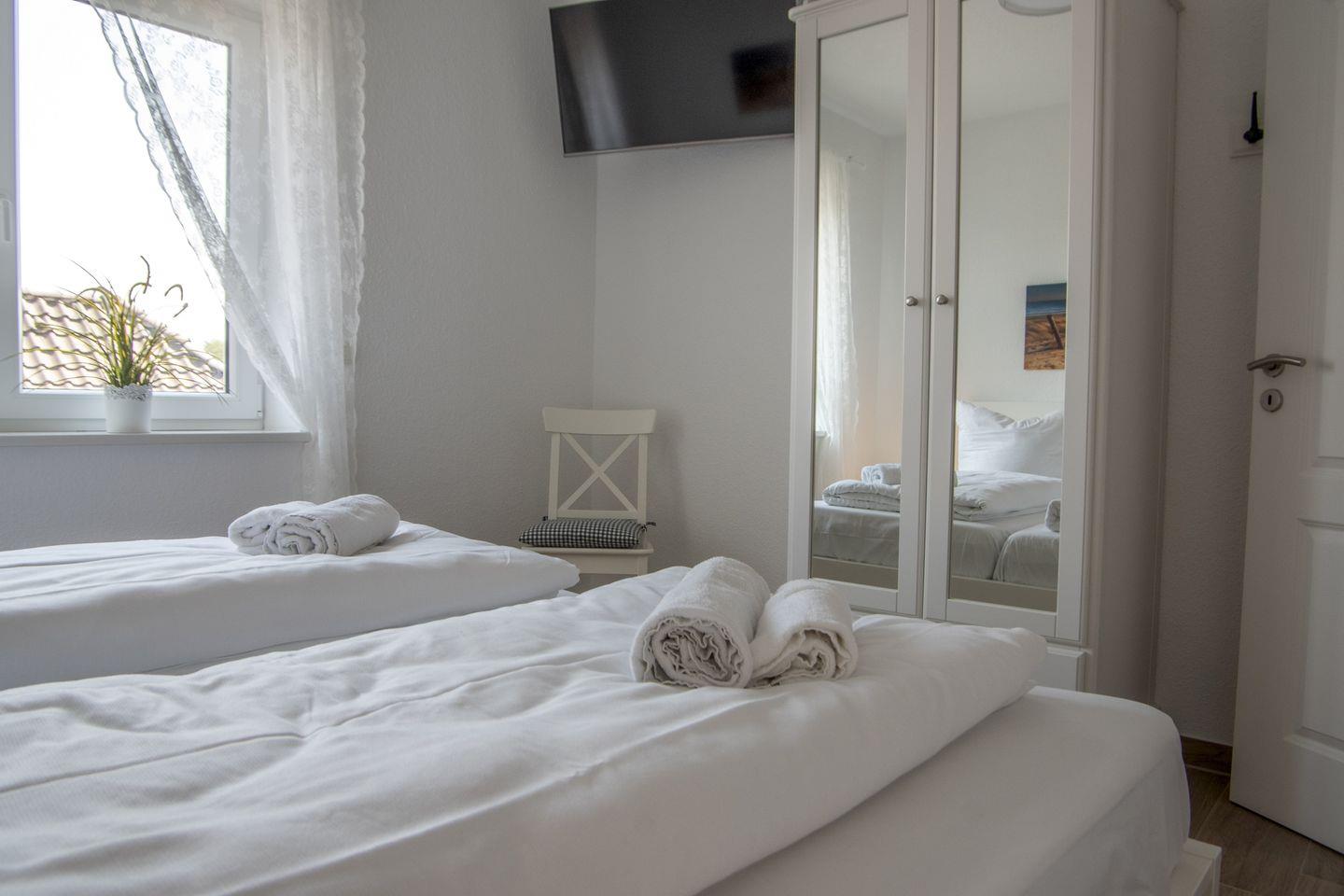 Beide Schlafzimmer sind mit Doppelbett und Flatscreen-TV ausgestattet. Im Wohnzimmer befindet sich eine aufklappbare Schlafcouch.