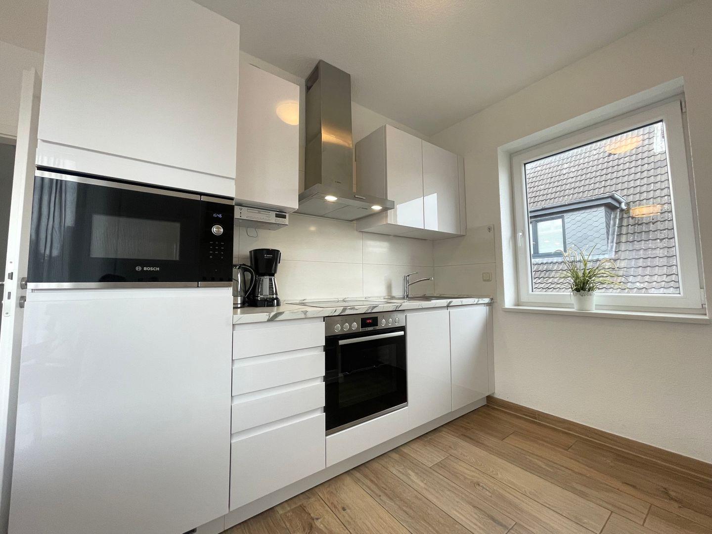 Die offene Küchenzeile ist voll ausgestattet (Geschirrspüler, Induktionsherd, Mikrowelle, Backofen, Kaffeemaschine, Wasserkocher etc.) und ermöglicht es Ihnen, gemeinsam leckere Mahlzeiten zu kochen.