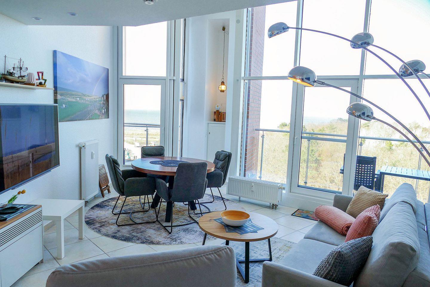 Modernes Penthouse im Haus Nordseebrandung in Cuxhaven-Sahlenburg. Zwei Balkone mit direkter Seesicht, stilvolle Einrichtung und hochwertige Ausstattung bieten den perfekten Rückzugsort für entspannte Tage an der Nordsee – mit Meerblick, Ruhe und Komfort über den Dächern von Sahlenburg.