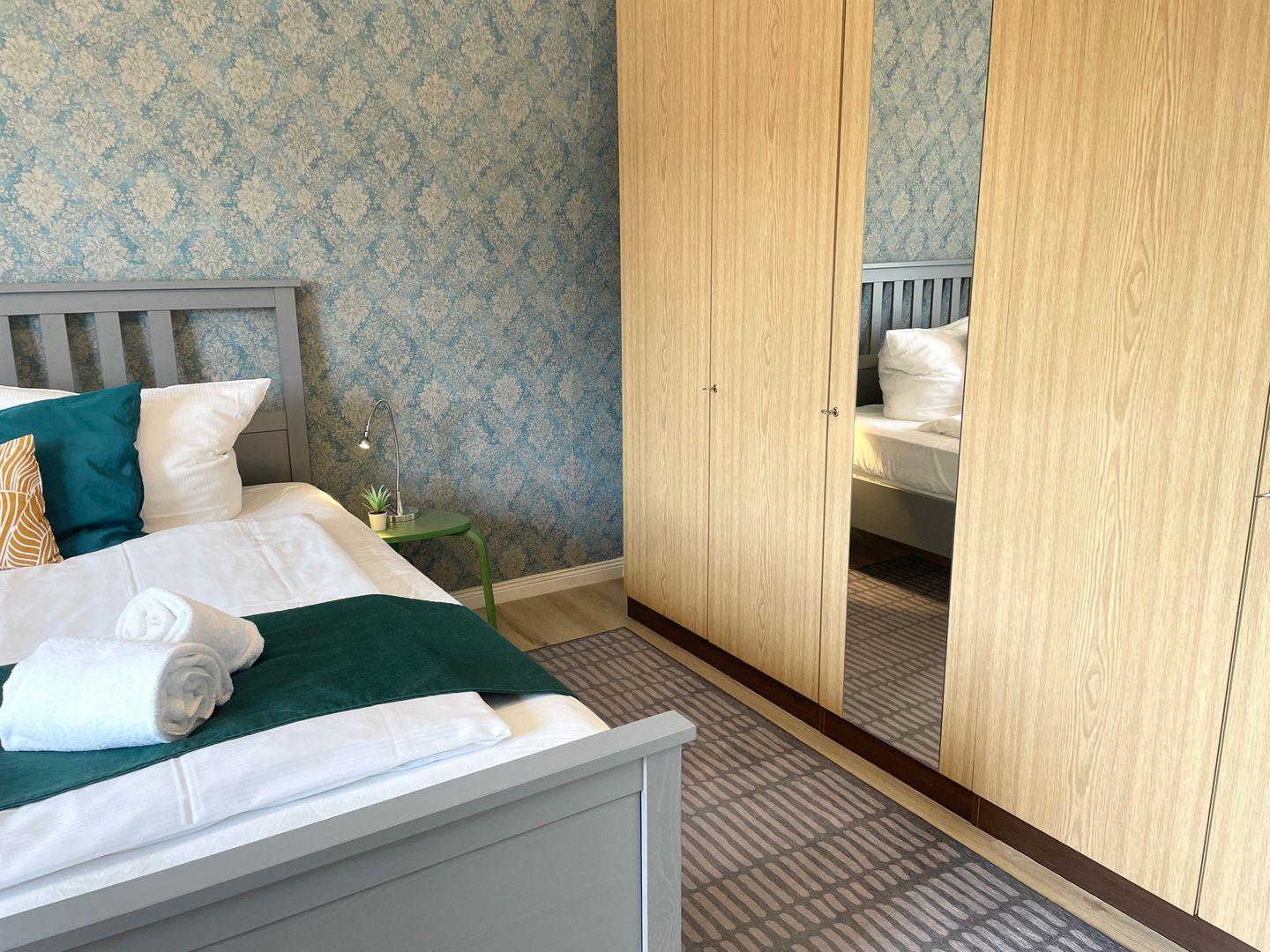 Zwei Bäder mit Tageslicht sorgen für zusätzlichen Komfort: eines mit Badewanne, das andere mit Dusche. Die großzügige Küchenzeile ist mit Cerankochfeld und Backofen ausgestattet und ideal für die Selbstversorgung. Zudem befindet sich eine Waschmaschine in der Wohnung.