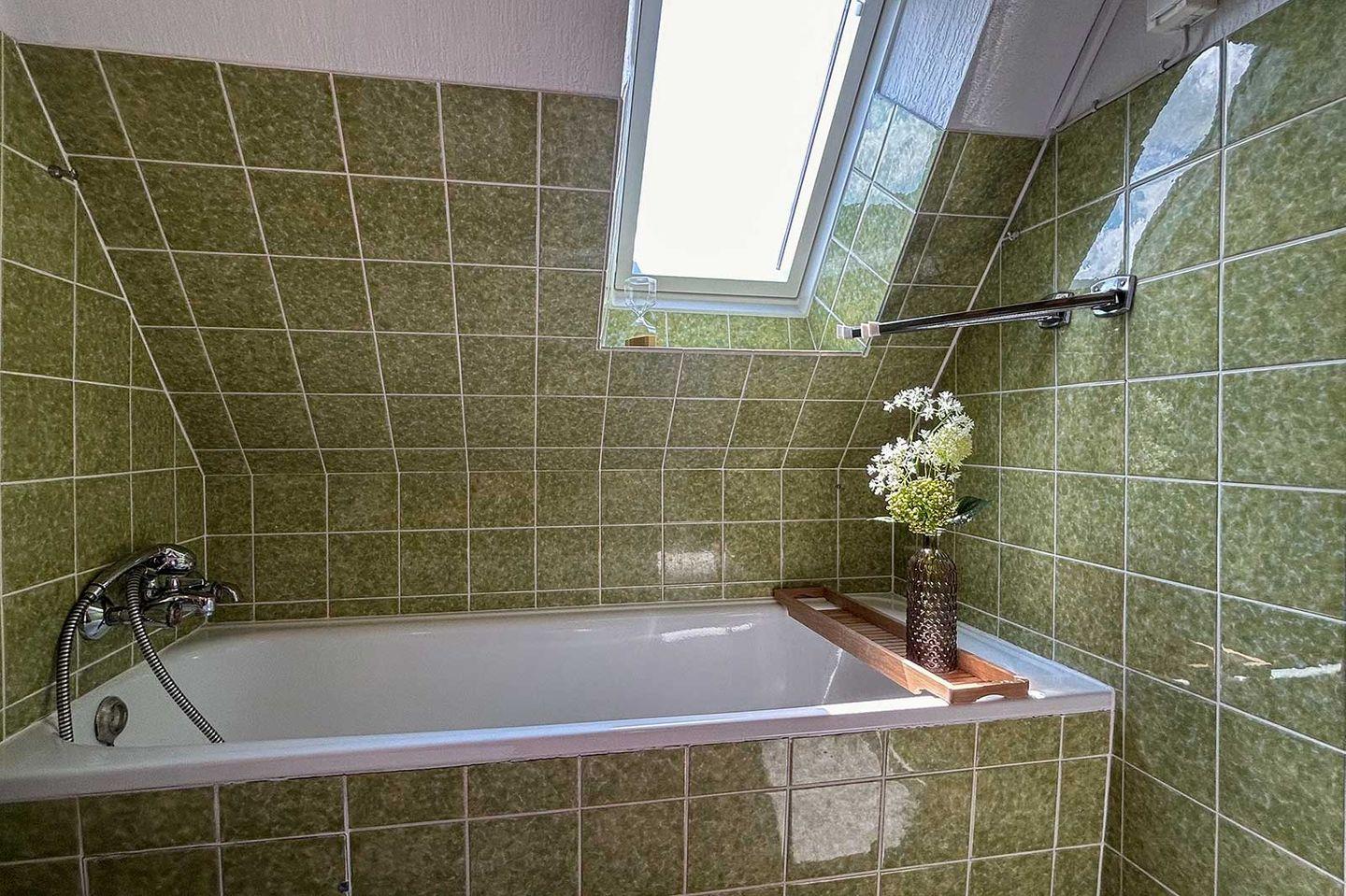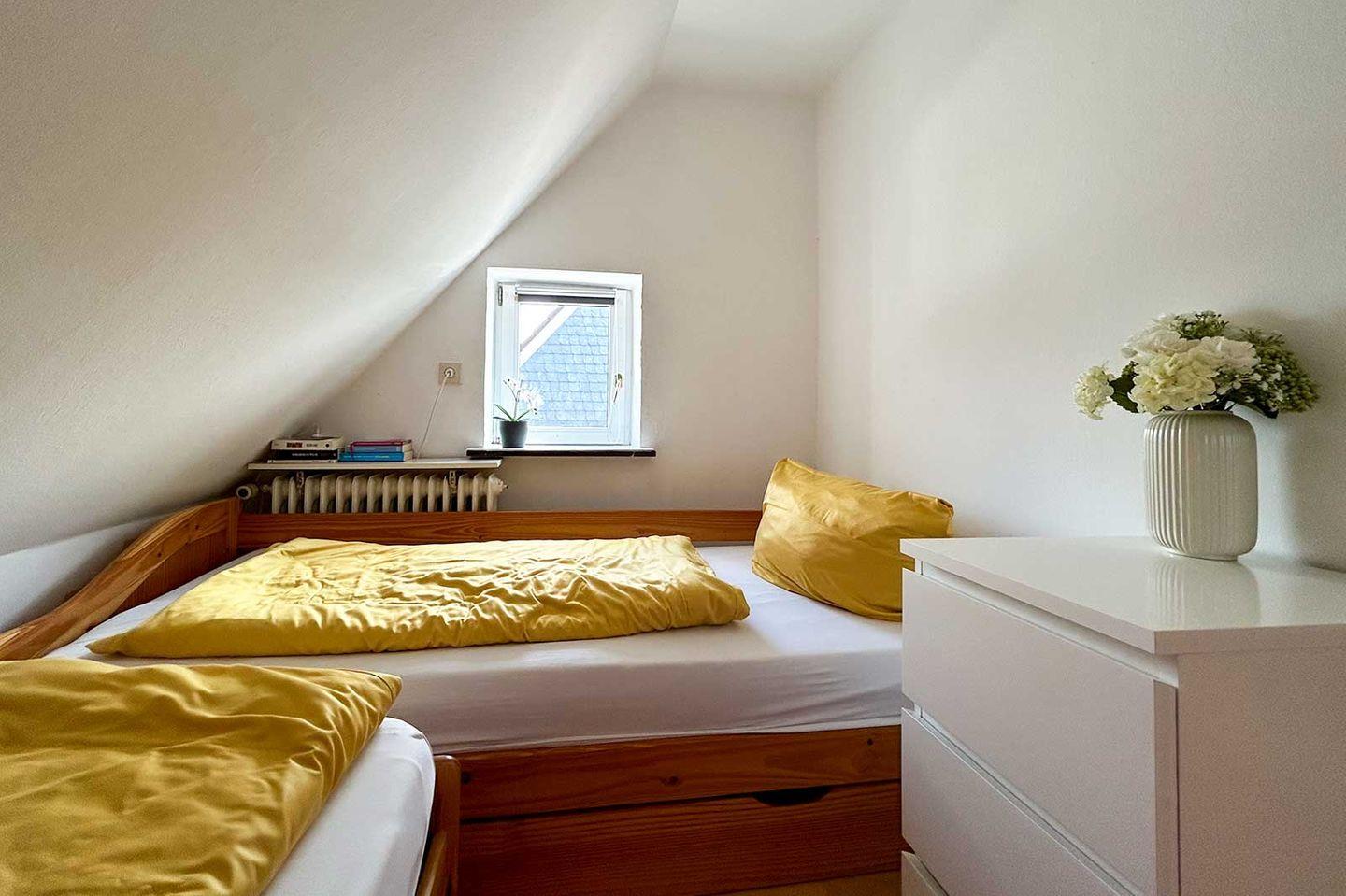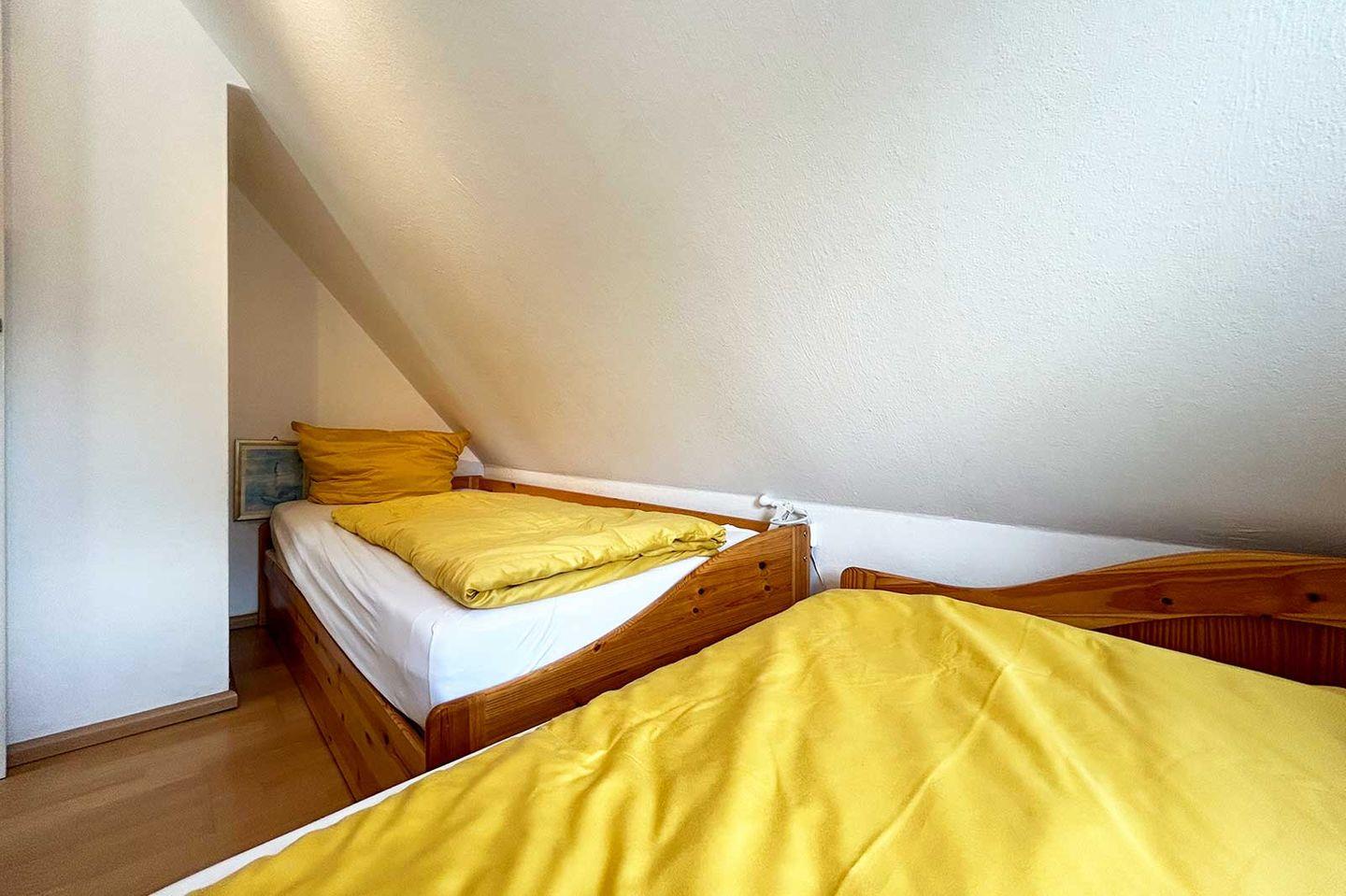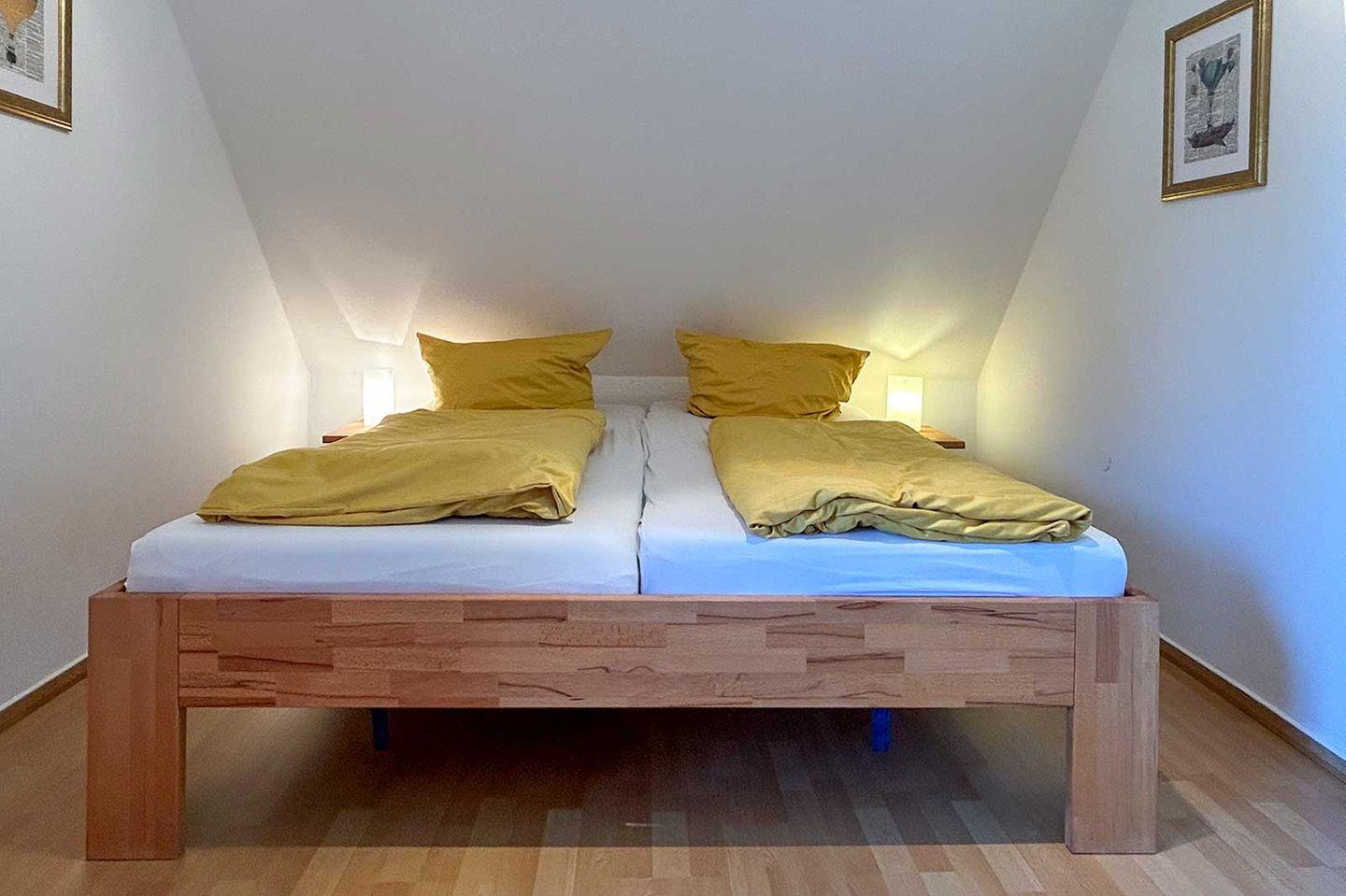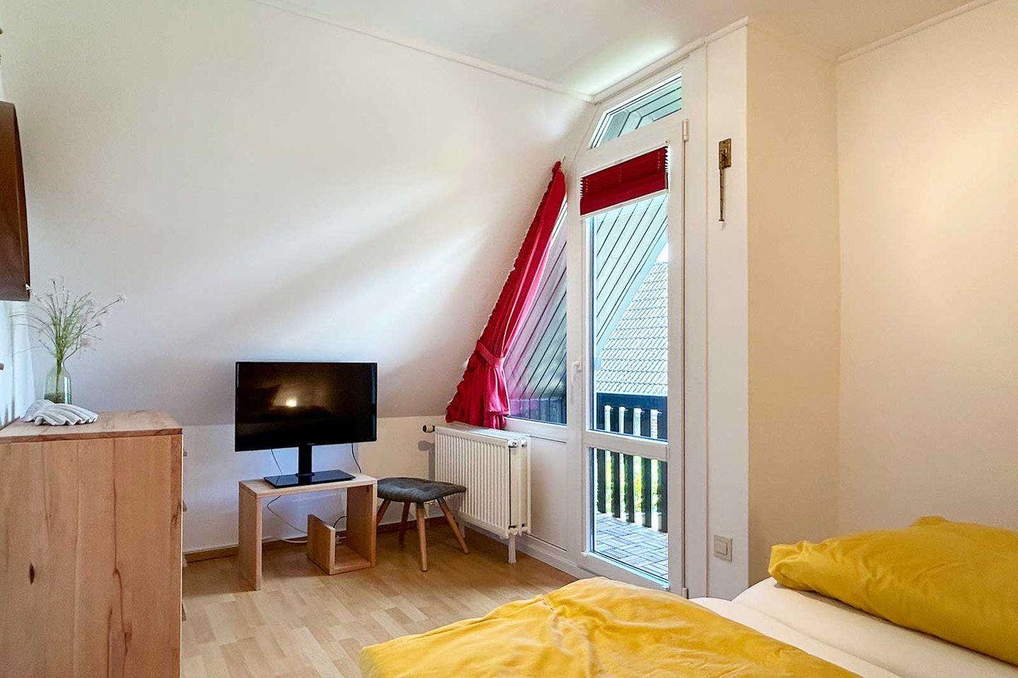 Im Obergeschoss befinden sich zwei Schlafzimmer: Eines mit einem Doppelbett und einem kleinen Balkon sowie einem TV. Das TV-Gerät im Schlafzimmer kann über einen mitgebrachten TV-Stick in Betrieb genommen werden (keine eigene Anbindung an Antenne/Kabel/Satellit!). Kleidung kann in einem kleinen Schrank auf dem Flur und in je einer Kommode im Schlafzimmer und im Kinderzimmer verstaut werden, da im Schlafzimmer kein Kleiderschrank vorhanden ist. Ebenfalls im Obergeschoss finden Sie ein Badezimmer mit Badewanne.