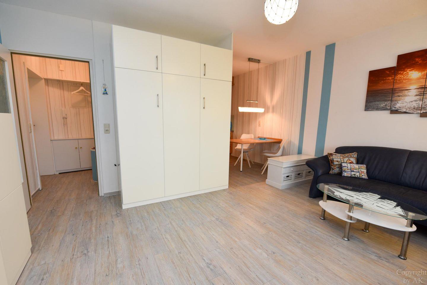 In puncto Aufteilung erwartet Sie ein kombinierter Schlaf-/Wohnraum mit einem praktischen Schrankbett, das tagsüber Platz spart und nachts für erholsamen Schlaf sorgt. Die integrierte Küchennische ist mit einem Esstisch ausgestattet, an dem Sie gemütliche Mahlzeiten genießen können. Das Badezimmer verfügt über eine Dusche, und im Flur finden Sie eine Garderobe für Ihre Kleidung und Accessoires.