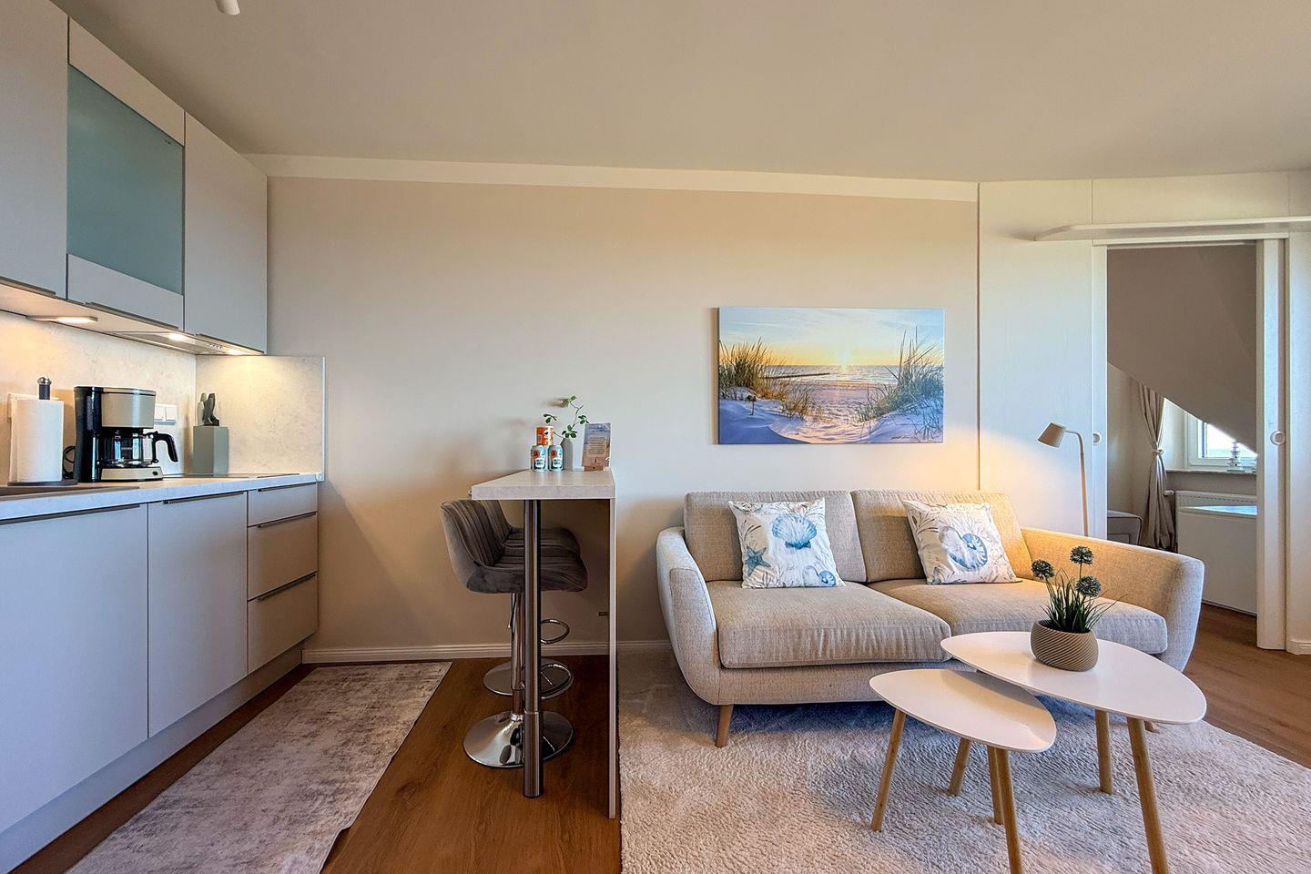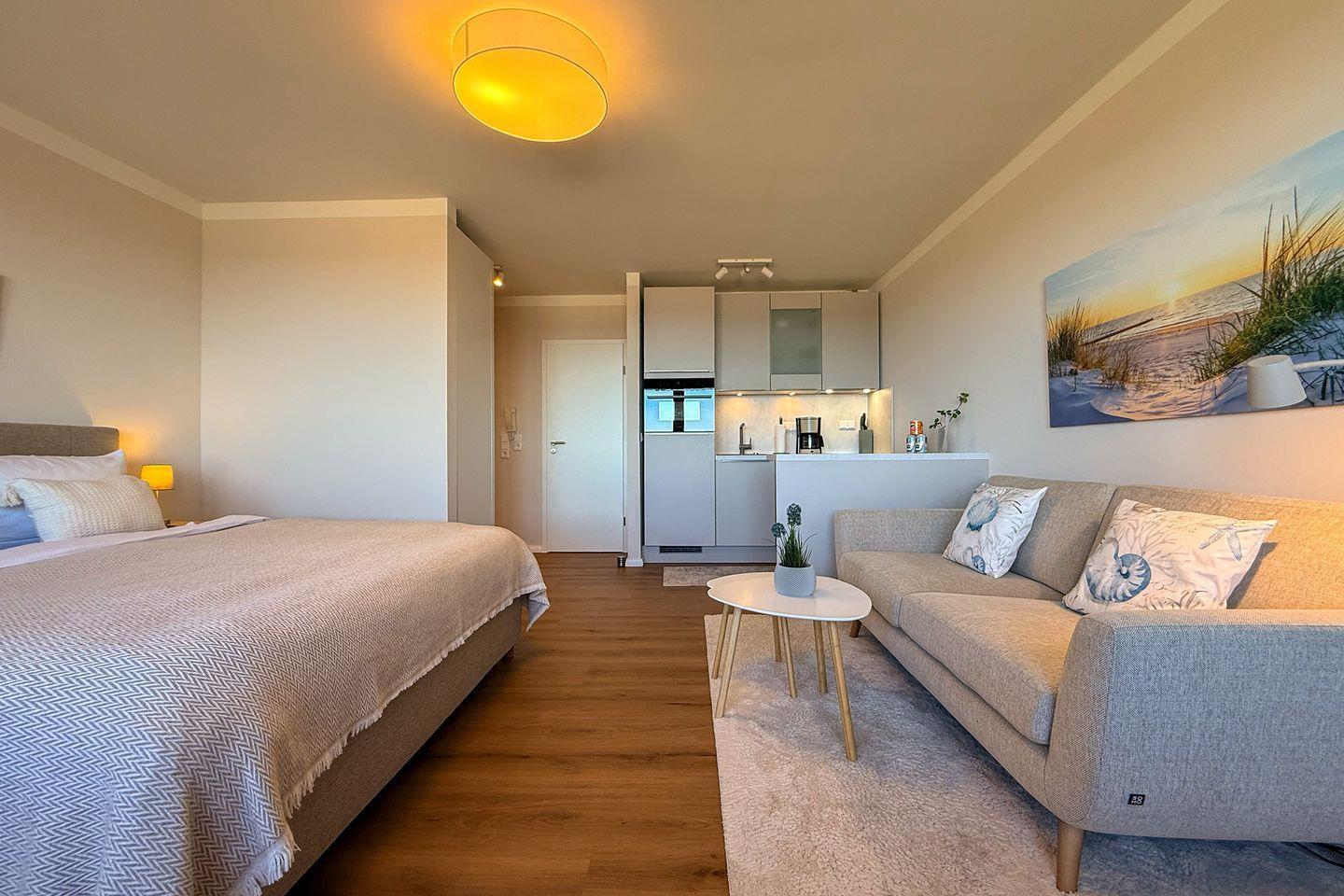 Mit einer Größe von ca. 35 m² verfügt die Wohnung über insgesamt zwei Zimmer, die Platz für bis zu zwei Personen bieten. Das Wohn- Schlafzimmer ist mit einem modernen Bodenbelag aus Vinyl ausgestattet und lässt durch große Fenster viel Tageslicht herein. Hier befindet sich auch das große Doppelbett. Der offene Küchenbereich ist ideal für Selbstversorger und lädt dazu ein, kulinarische Köstlichkeiten zubereiten. Die Küche ist mit hochwertigen Geräten ausgestattet, darunter ein Ceran-Herd, ein kombiniertes Backofen-Mikrowellen-Gerät, ein Kühlschrank mit Gefrierfach sowie eine Spülmaschine. Zudem stehen Ihnen Geschirr, Besteck und zahlreiche Küchenutensilien zur Verfügung. Für den perfekten Start in den Tag sorgt die Kaffeemaschine, während der Wasserkocher und der Toaster schnelle Snacks ermöglichen.