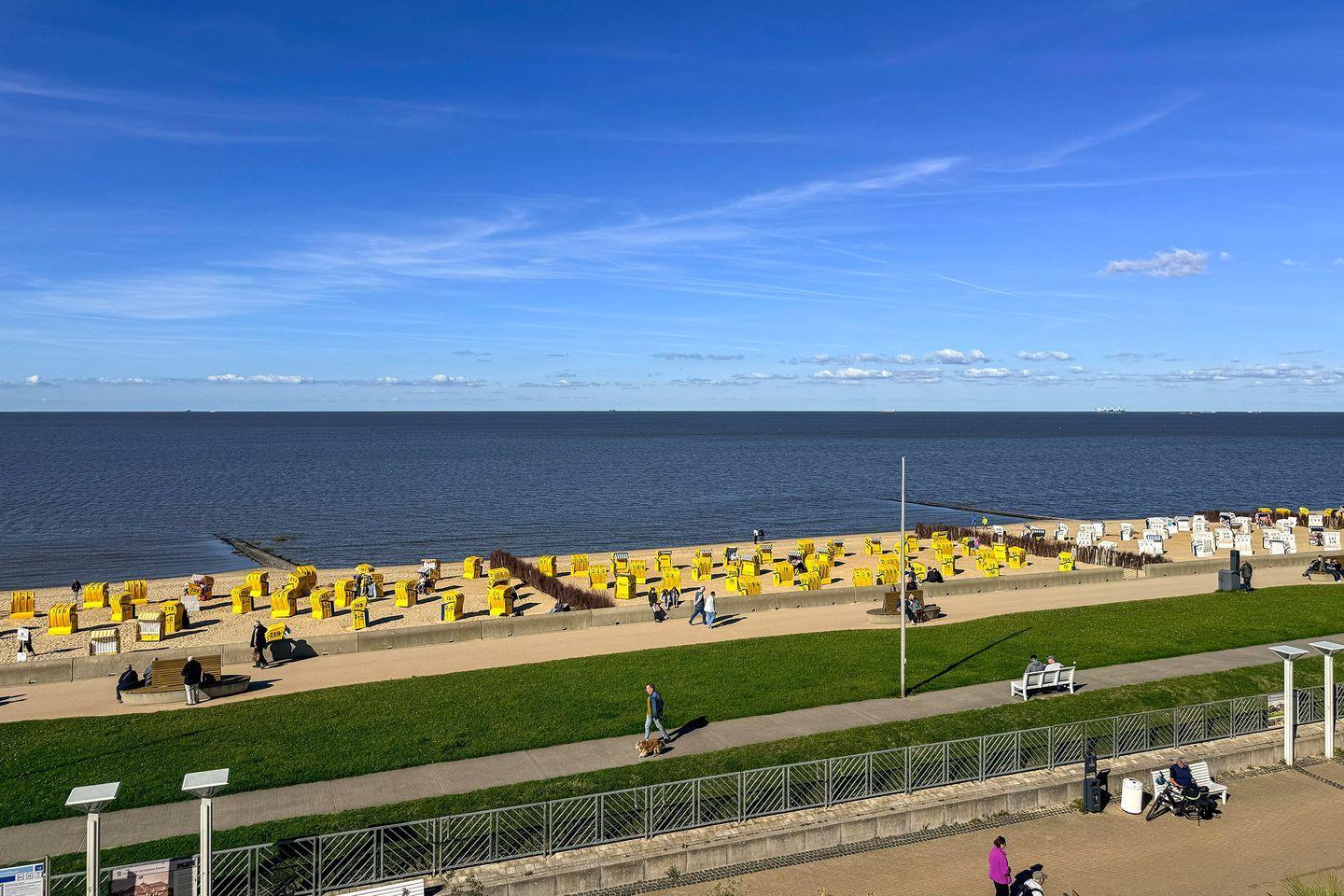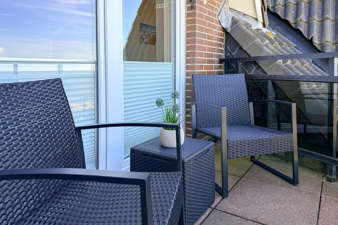 Ein weiteres Highlight der Wohnung ist der Balkon, der Ihnen einen außergewöhnlich guten Meerblick bietet. Genießen Sie die frische Nordseebrise, während Sie eine Tasse Kaffee trinken oder einfach nur die Aussicht auf den Strand und das Meer erleben. Der Strandkorb, der von Mai bis Mitte Oktober inklusive ist, lädt Sie ein, die Sonne und die maritime Atmosphäre optimal zu nutzen.