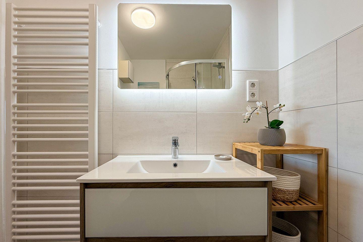 Die Ferienwohnung 35 in der Residenz Meeresbrandung verfügt über alle notwendigen Annehmlichkeiten, um Ihren Aufenthalt so angenehm wie möglich zu gestalten. Dazu gehören ein modernes Badezimmer mit Dusche, WC, Spiegel sowie Haartrockner. Auch Annehmlichkeiten wie ein Fernseher mit digitalem Kabelanschluss, Radio und WLAN sind vorhanden, damit Sie auch während Ihres Urlaubs bestens unterhalten und verbunden bleiben.