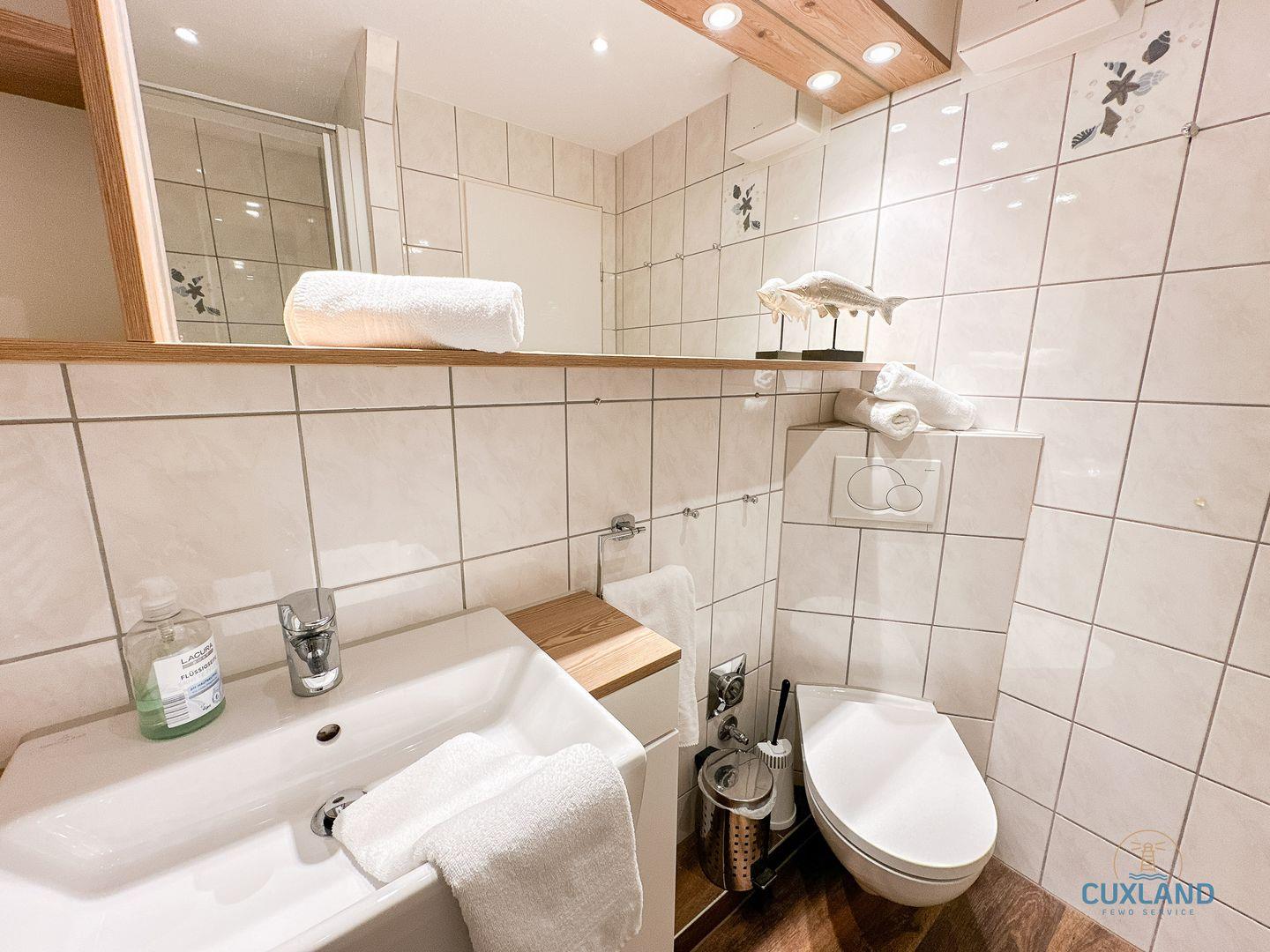 - Dusche, Waschbecken, WC, Spiegel, Haartrockner