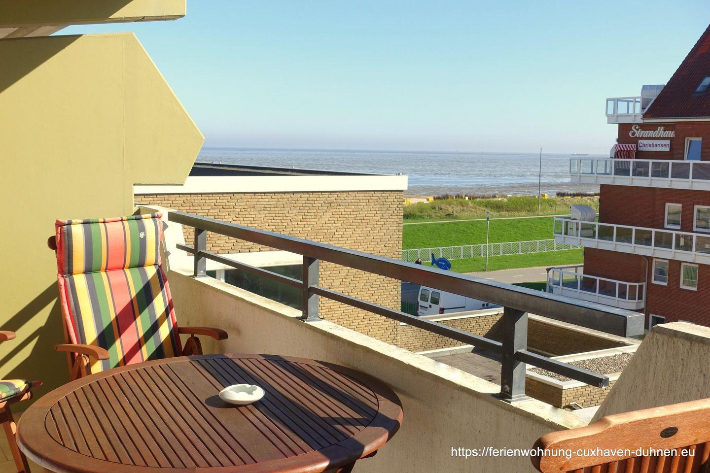 Vom gut möblierten Balkon hat man eine seitliche Seesicht über den Deich zur See. Die Küche ist mit allem notwendigen ausgestattet, auch Geschirrspülmaschine,