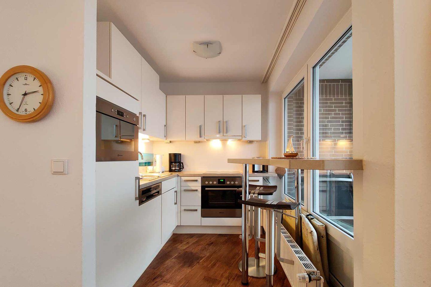 Residenz Meeresbrandung, Haus 1: Die großzügige Ferienwohnung für bis zu 4 Personen bietet aus der 3. Etage einen tollen Meerblick und ist absolut hochwertig eingerichtet. Mit der schönen Aussicht von Balkon, Küche und Wohnraum auf die Nordsee wird es nie langweilig.