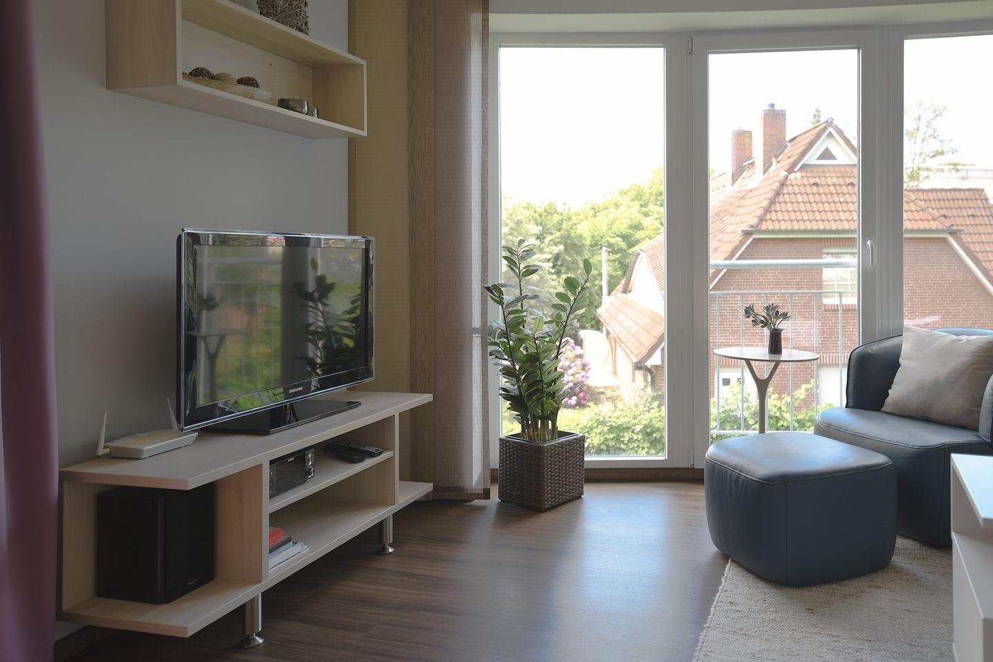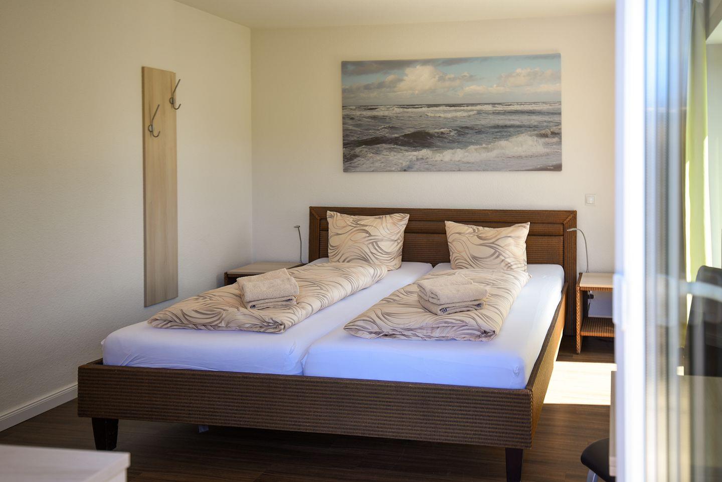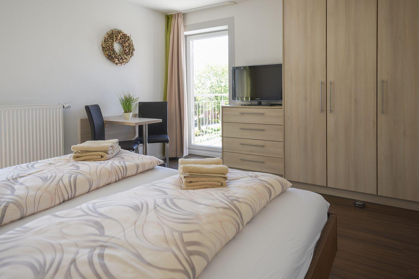 Die Ferienwohnung in Haus 2 in der 1. Etage ist komfortabel ausgestattet mit 2 Schlafzimmern mit Doppelbett und LCD-TV, 1 Badezimmer mit Dusche, WC und eigener Waschmaschine sowie ein separates Gäste-WC. Außerdem verfügt die Ferienwohnung über einen großen Balkon mit südwestlicher Ausrichtung. Ein Stellplatz in der Tiefgarage ist für Sie reserviert. Hier finden Sie auch einen abschließbaren Fahrradraum für die Sicherung Ihrer Räder.
