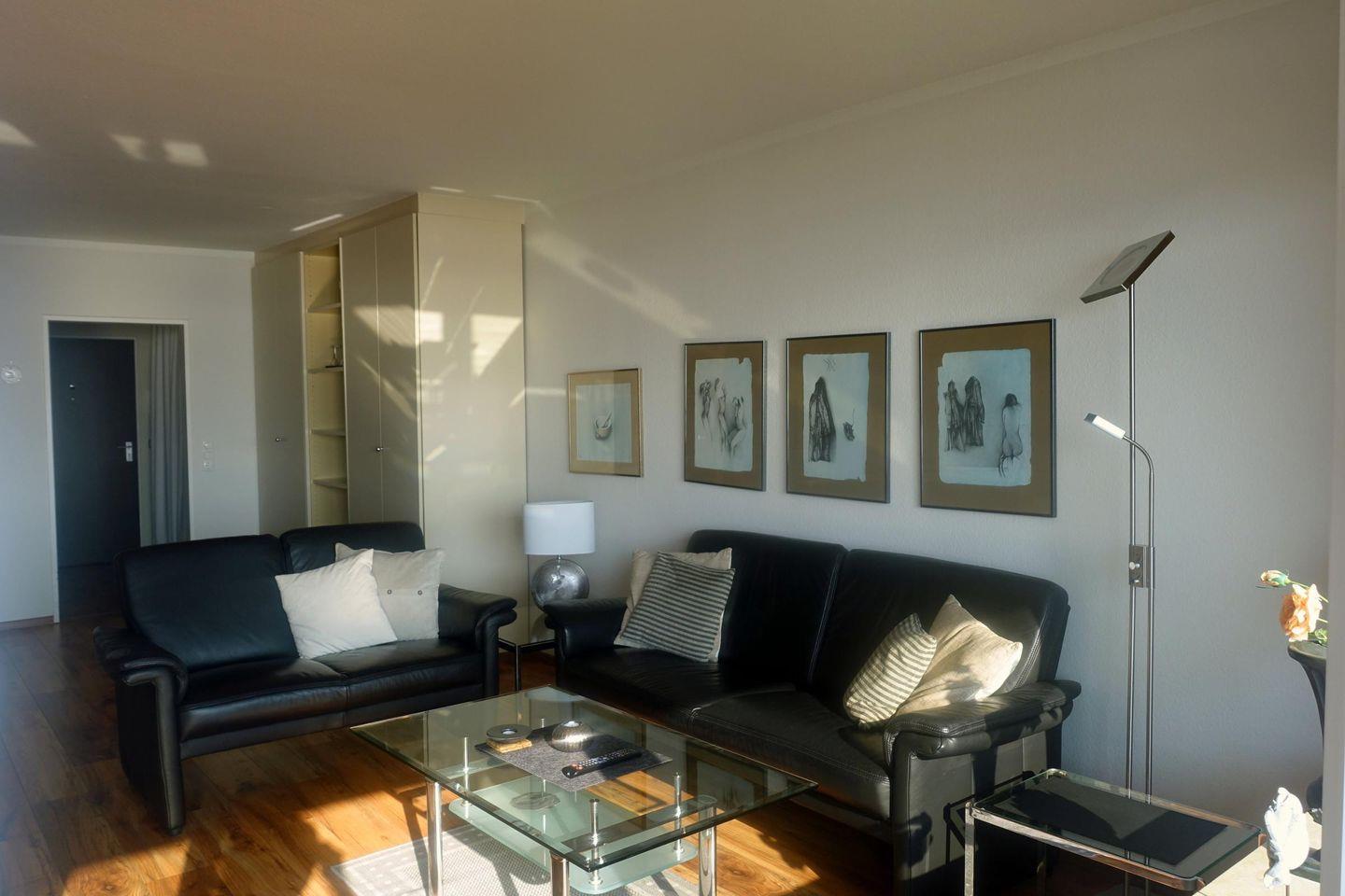 Im Wohnraum steht ein 3er und ein 2er Ledersofa, von den man auf die See sehen kann, ohne das Gebäude stören.