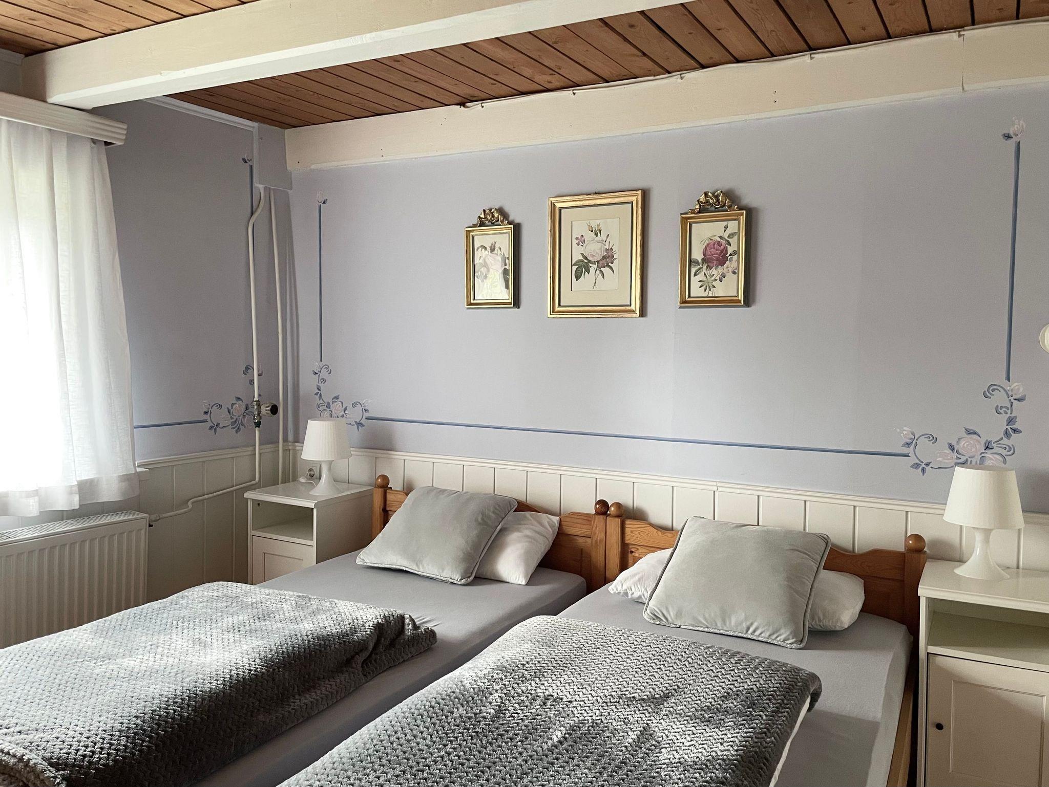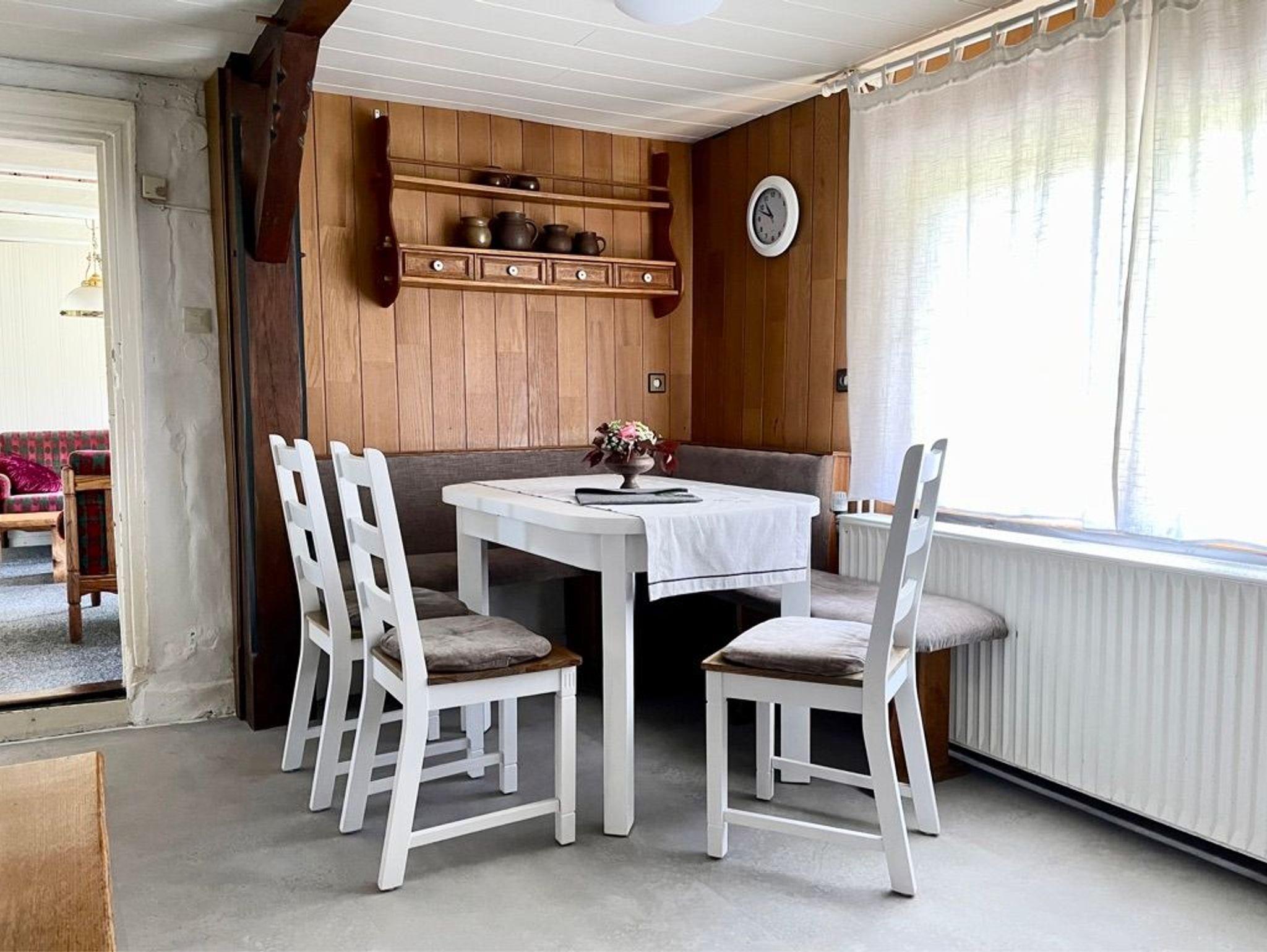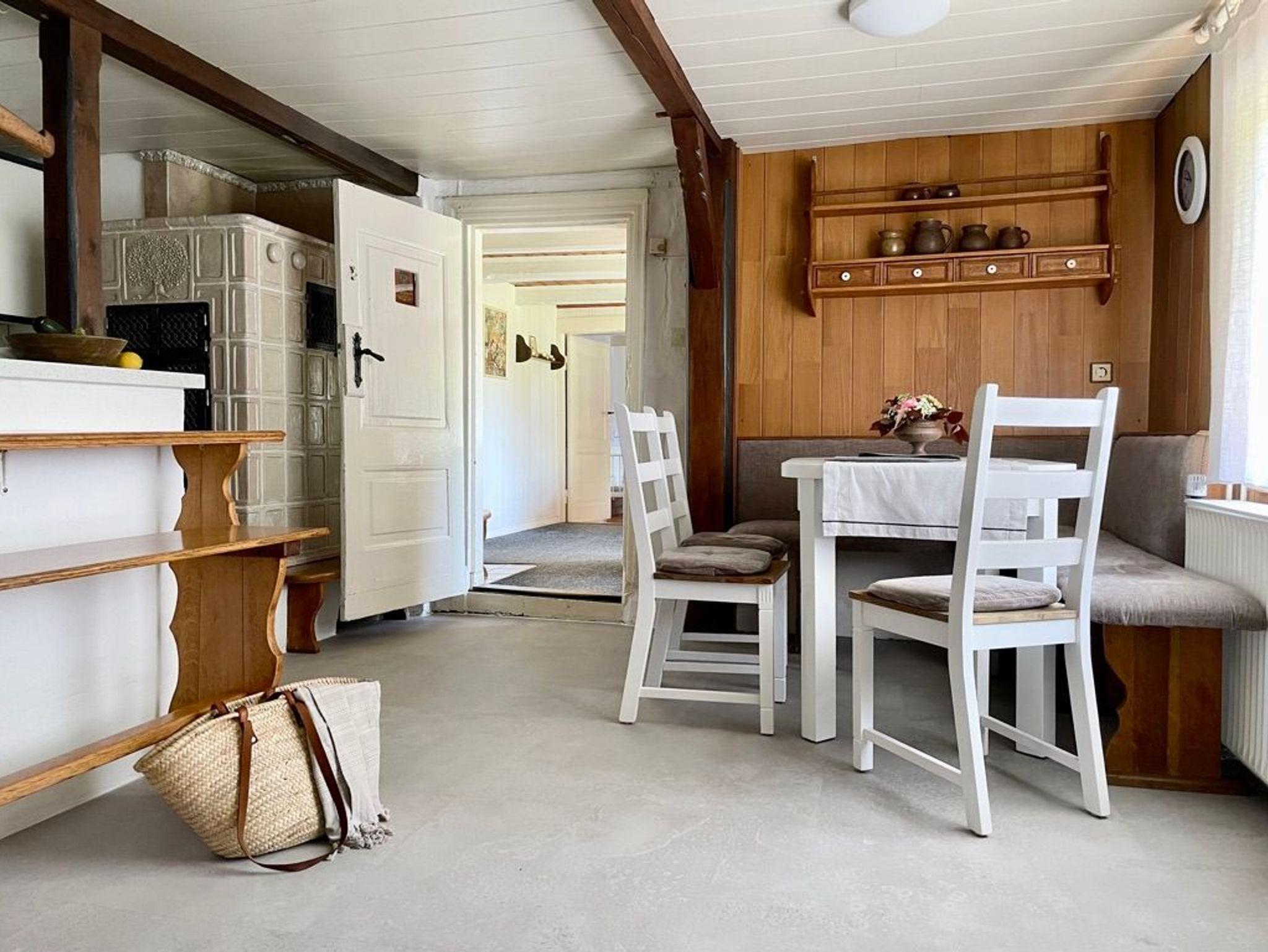 Die ersten Versicherungsunterlagen stammen aus dem Jahr 1820, das größere Haus ist also mindestens 200 Jahre alt. Immer wieder umgebaut und angebaut, blieben unverändert niedrige Deckenhöhe, schiefe Türzargen und lehmverputzte Wände in der 70 m2 Wohnung als stille Zeitzeugen…