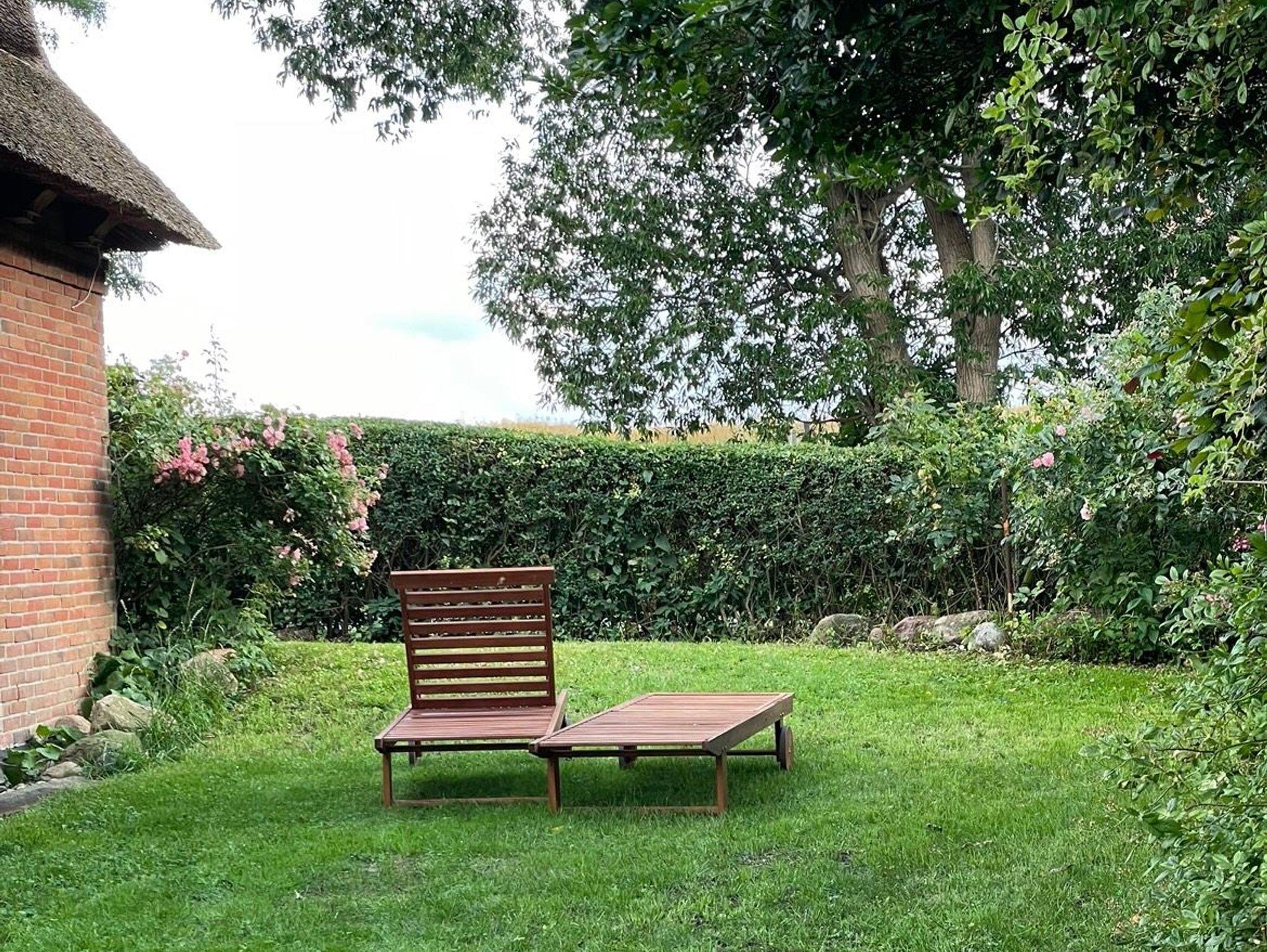 Vor dem Eingang zum Garten stehen Ihnen ein kleiner Sitzplatz, im Garten ein größerer und Gartenliegen zur Verfügung.